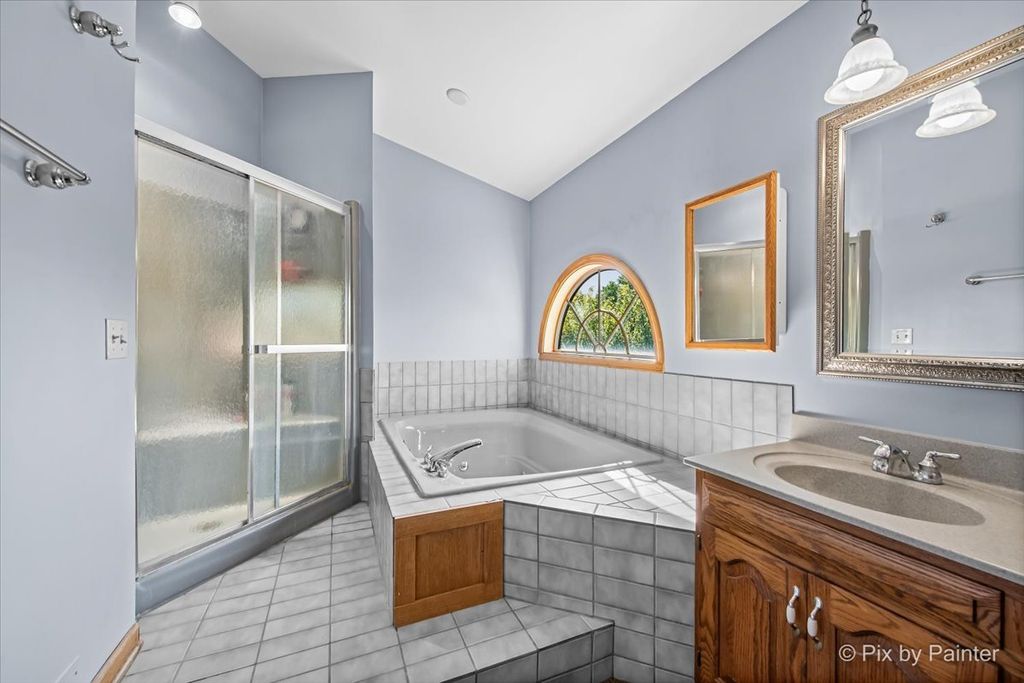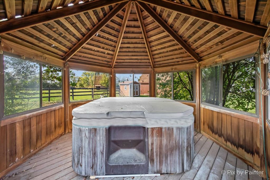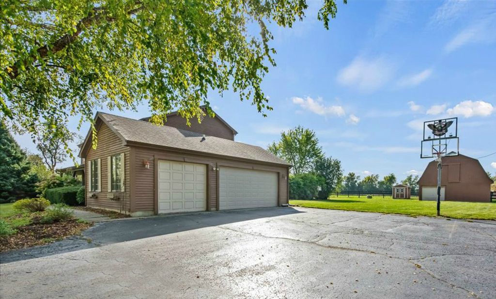 Fabulous 3 acre Estate ready for Horses! Lovely 1989 Cedar home with 4 BR, 3 1/2 baths, 3 car gar, finished basement, cemented crawl space, separate basement access and much more! Nicor gas--not propane. MAIN FLOOR FEATURES: Spacious Living room with Bay window, Casablanca Fans, 1st floor bedroom, full bath, half bath, 2-sided brick fireplace with sunny den, Kitchen & Breakfast nook with ceramic tile, granite counters, Stainless & black appliances, new kitchen hardware, Dining room with Bay window and hardwood flooring, separate laundry room w/pull-down ironing board. SECOND FLOOR FEATURES: Amazing Master Bedroom Suite with Casablanca ceiling fan & vaulted ceiling, Fabulous Master Bath suite with Whirlpool tub, separate shower & dual sinks, 2 more bedrooms, Loft area & hall full bath. BASEMENT FEATURES: Rec room, workout room, storage room, utility room and separate access to garage. OUTDOOR FEATURES: Above ground pool with large deck, Gazebo, pool fountain, Cedar barn with run-in area & loft, chicken house, Shuck fence on paddock & pasture, inside hydrant. Three horses are allowed on the property. NOTE--Property is being split from larger parcel and sale is contingent on final approval of zoning change and parcel split expected in Dec. 2025.