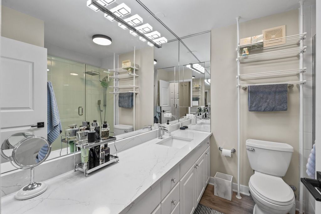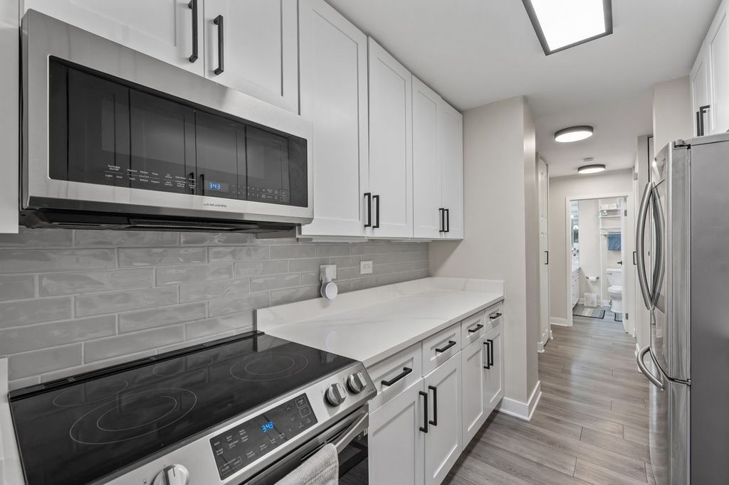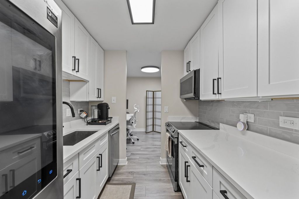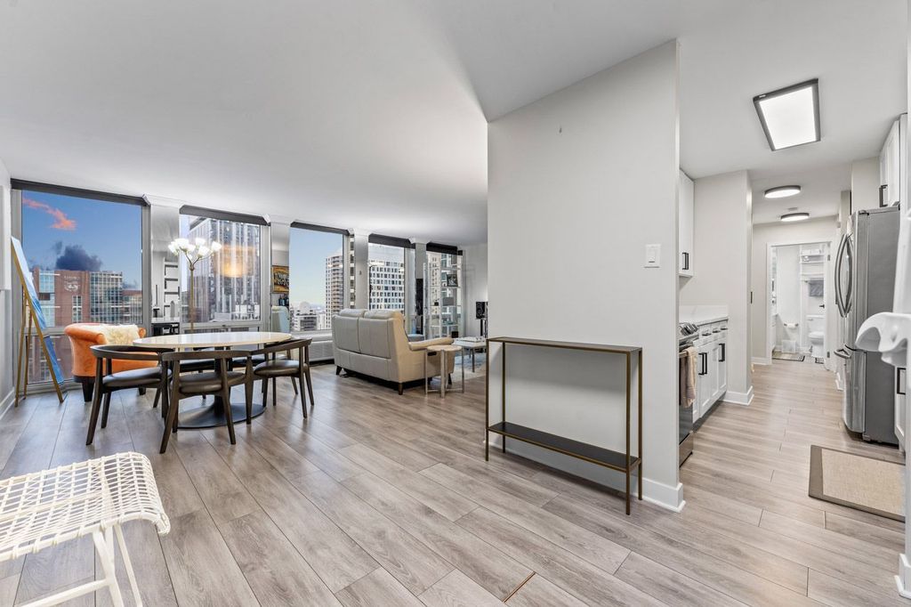 Experience refined city living in this premier Gold Coast building, offering breathtaking western skyline views. This beautifully renovated 1-bedroom, 1-bath condo features luxurious LVP flooring throughout and an expansive, sun-filled living room framed by floor-to-ceiling windows-enhanced with custom Levolor Cellular Smart Shades for light filtering and effortless comfort. The sleek, modern kitchen impresses with abundant white shaker cabinets accented by bold black hardware, Quartz countertops, a dove gray subway tile backsplash, and high-end stainless steel appliances. Enjoy the convenience of a new full-size LG Smart Washer and Dryer located in-unit. The spacious bedroom includes a generous closet outfitted with a custom California Closet system with dedicated shoe storage, along with motorized top-down/bottom-up blackout shades. The refreshed bathroom offers a wide vanity with gleaming Quartz countertop space, a wall-to-wall mirror, and a tub/shower combo. Additional peace of mind comes from the replacement of both PTAC systems in 2023. Residents of 111 E. Chestnut enjoy a full suite of amenities, including 24-hour door staff, an outdoor heated pool and sundeck with 10 grilling stations, a fitness center, a business center, and a banquet/party room available for private events. A private storage locker is conveniently located on the 9th floor. Perfectly positioned in the heart of the Gold Coast, this residence is just steps from Michigan Avenue, Water Tower Place, the John Hancock Building, the Museum of Contemporary Art, and the city's finest dining and shopping. With its combination of high-floor views, timeless finishes, and full-service amenities, Unit 28J delivers a move-in-ready lifestyle in one of Chicago's most desirable neighborhoods. Owner rents a parking spot in the garage which is transferrable to the new owner if needed. Schedule your showing today!