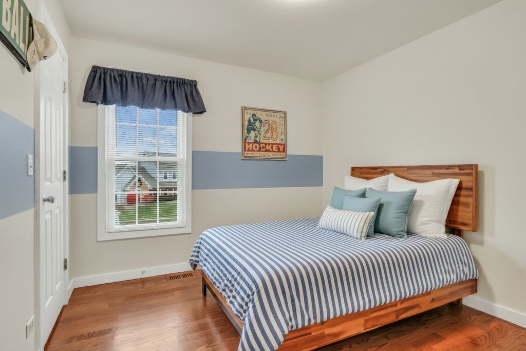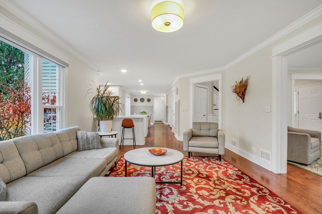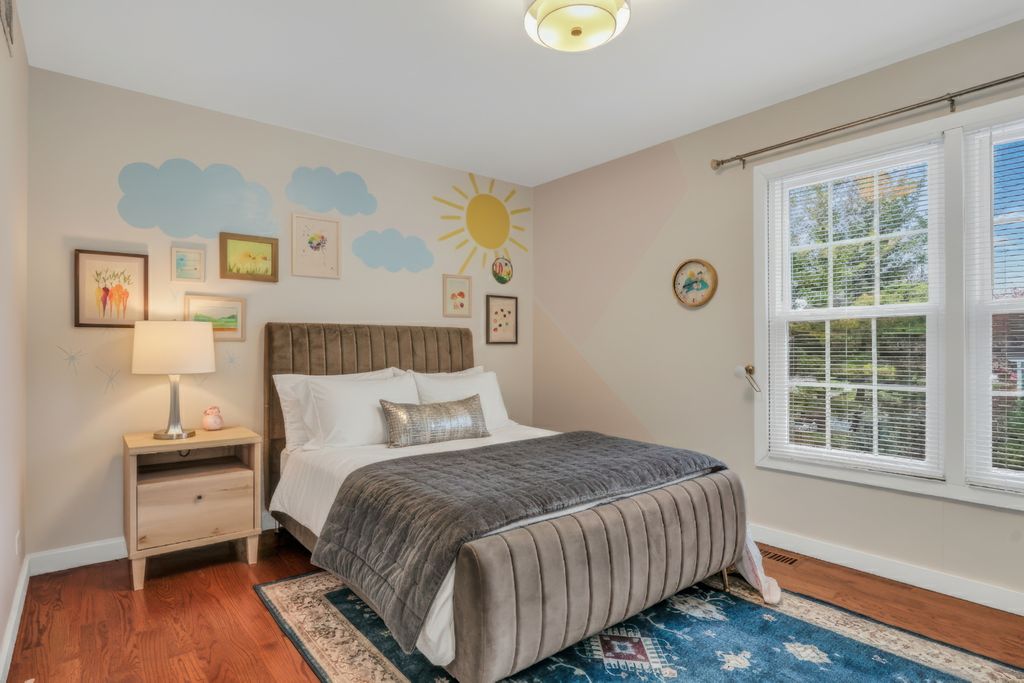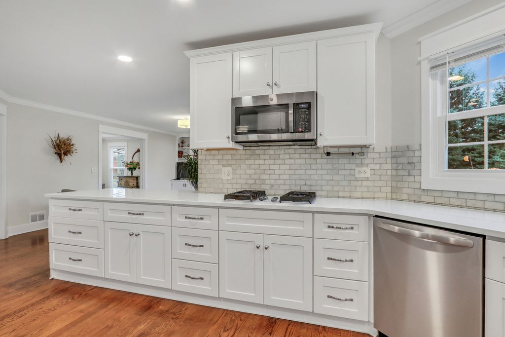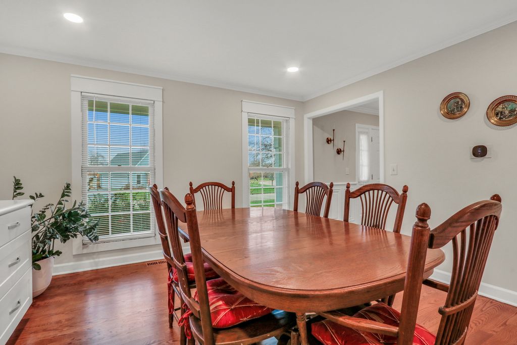 Welcome Home to this stunning residence in the highly sought-after Brookside community! Perfectly situated on a beautiful 1/2-acre corner lot, this home welcomes you with a charming, oversized front porch that sets the tone for everything that follows. Step inside and fall in love with the bright, open layout featuring gleaming hardwood floors, elegant wainscoting, an abundance of natural light, and impressive spaces designed for effortless entertaining. The formal living room offers a warm and inviting place to gather, opening seamlessly into the spacious family room where you'll find floor-to-ceiling windows, a cozy brick fireplace, and custom built-ins that elevate the room's style and function. The updated kitchen is truly a dream-complete with crisp white cabinetry, a stylish backsplash, stainless steel appliances, quartz countertops, and a generous center island perfect for meal prep or morning coffee. The comfortable eating area flows directly to the back deck, making indoor-outdoor living a breeze. The main level also features a convenient laundry/mudroom with stackable washer and dryer, plus a fifth bedroom ideal for a home office or overnight guests, along with a beautifully updated full bathroom. Upstairs, retreat to the impressive Primary Suite, boasting hardwood floors, a spacious walk-in closet, and a gorgeous updated en suite showcasing a large glass-enclosed shower, stunning tile work, a double-sink vanity, and a relaxing soaking tub. Three additional generously sized bedrooms-all with hardwood floors-and an updated full bathroom complete the second level. The finished basement provides a fantastic recreational space along with abundant storage options. From top to bottom, this home is filled with charm, comfort, and thoughtful updates. A true Brookside gem-ready to welcome you home!