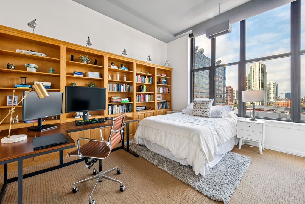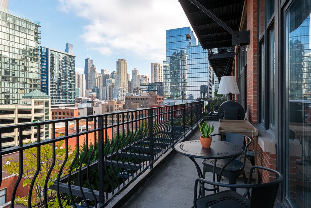Experience the best of sophisticated city living in this stunning penthouse corner residence at the prestigious Union Square Lofts. Soaring 11-foot ceilings and expansive walls of windows (with motorized blinds!) fill the home with natural light and frame captivating city views. The open-concept layout offers versatile living, dining, and work-from-home options, all centered around a sleek gas fireplace and rich hardwood flooring. The designer kitchen, fully renovated in 2022, features premium stainless steel appliances and elegant Misterio Vicostone countertops-perfect for both everyday living and entertaining. The serene primary suite feels like a private retreat, showcasing brand-new oak flooring (2025), a custom walk-through closet, and a spa-caliber en-suite bath with heated floors, a Toto toilet, floating vanity, and an indulgent steam shower. The second bedroom serves beautifully as a guest suite, nursery, or home office, complete with a custom bookcase and an adjacent full bath accessible from both the bedroom and main living area. Step outside to your private balcony-spanning the length of the home-and take in sweeping city views or enjoy the vibrant energy of River North, with premier shopping, dining, and nightlife just outside your door. A premium corner parking space is included. Union Square Lofts is among River North's most coveted addresses, offering timeless architecture, a newly renovated courtyard and 24-hour door staff. Assessments include nearly everything but electricity for effortless living.