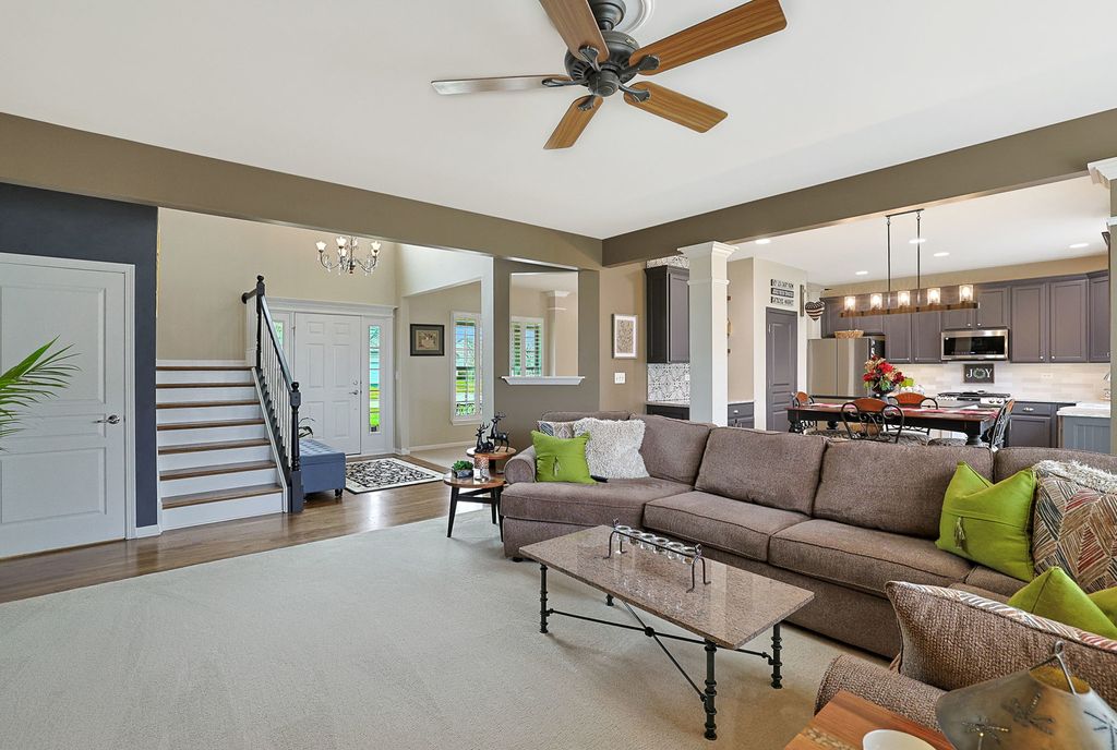 This fabulous, sought-after home truly has it all! Offering 9' ceilings on first floor, 4 spacious bedrooms and 2.5 recently remodeled baths, this home provides an ideal layout for both everyday living and entertaining. Situated on an expansive greater than quarter-acre lot, the property delivers generous outdoor space for gardening, play, or entertaining. Step into an inviting two-story foyer that opens to a spacious family room featuring a cozy gas fireplace and beautiful hardwood floors throughout most of the home. The stunning recently upgraded eat-in kitchen is a chef's dream-complete with an oversized center island, farmhouse sink, pantry, 42" cabinets, Quartz countertops, and stainless-steel appliances. A convenient first-floor den/office with a custom quartz countertop credenza and generous laundry room add to the home's exceptional functionality. The large unfinished basement offers endless possibilities for custom design and includes a sump pump with battery backup for peace of mind. Major upgrades include a new 30-year roof and gutters (2020) and a new driveway (2023). The exterior is professionally landscaped and showcases a charming front porch, large patio, and an in-ground sprinkler system. The attached 2-car garage is fully finished and is highlighted by a sleek epoxy floor. Enjoy the convenience of having a scenic neighborhood park just steps away, creating the perfect backdrop for afternoon walks, weekend picnics, and outdoor activities. With its thoughtful design, inviting atmosphere, and prime location, this home is a standout opportunity you won't want to miss. Perfectly located near the Randall Road corridor, I-90, shopping, Randall Oaks Park, Recreation Center, and Golf Course, this home sits within Winchester Glen, a 300-acre community with 114 acres of open space and miles of walking/biking trails. Highly regarded District 300 Schools complete the package. Be sure to view the Home Amenities sheet for the full list of upgrades-there are simply too many to list!