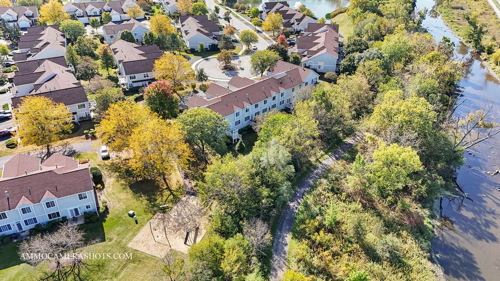 Super super Rare End unit next to park with First Floor Primary bedroom and finished basement!! So much space. Fabulous premier location nestled at the end of a cul de sac backing to west branch of the DuPage River. Tons of privacy! This home offers over 1900 square feet above grade and an additional 1,170 square feet in the basement. Large eat-in Kitchen with Island 42" oak cabinetry. Separate Pantry cabinet plus coffee bar/wine bar area! Stainless appliances and room for table. Oak cabinets with granite counters, under cabinet lights and wood look tile floor. The two story Living Room is filled with light from the large northwest windows (newer) and features a separate space for a Dining Room table. There is easy access to the BRAND NEW DECK directly from the Kitchen with forest preserve views! First floor ensuite with walk-in closet plus 2nd bifold closet. The Primary Bath features separate soaker tub, shower, double sinks, updated mirrors and lights plus granite counters. The Second level offers so much flexiblity with an additional bedroom PLUS Two lofts (one with gas fireplace) and huge storage room. The Loft areas make a great office or Family Room space. Finished English basement includes a large, bright rec area and more storage space! Attached two car Garage. If you have wanted to downsize but need storage space this is your place! District 200 Schools! Easy access to I-88, shopping, downtown Naperville, forest preserves and shopping. Roof approximately 2015. One of Cantera Village's finest locations! Only 6 buildings out of 29 have basements!!