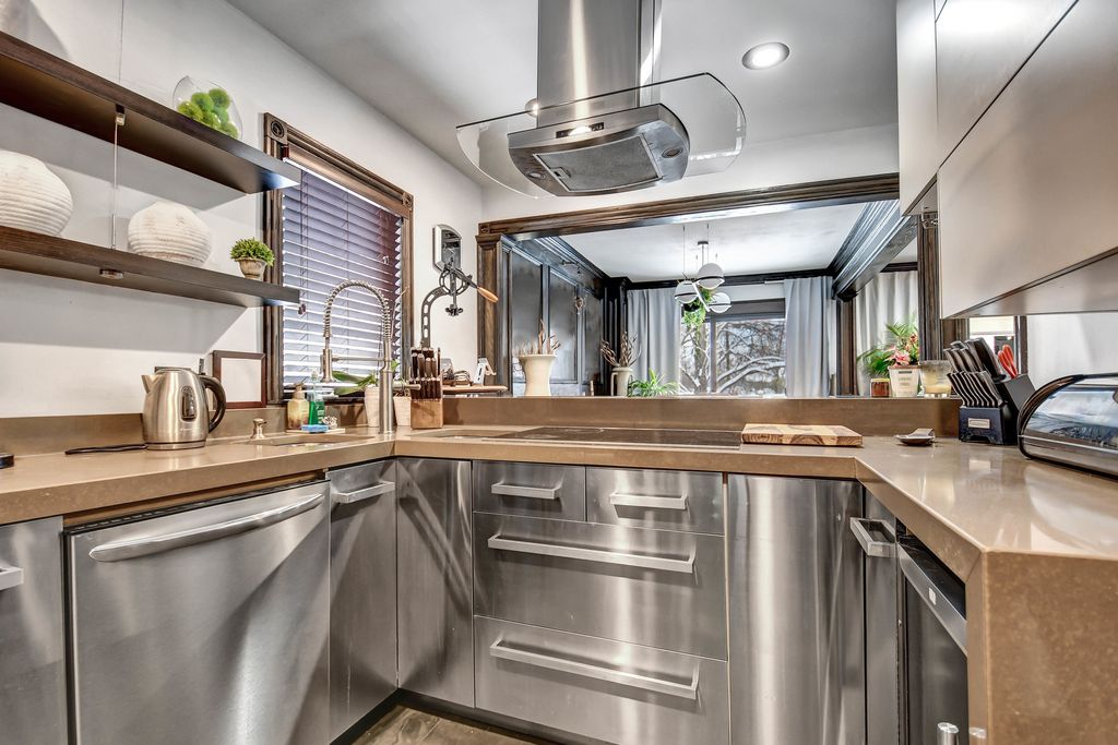 Step into a beautifully re-envisioned Hinsdale residence where every detail has been artfully redesigned. This first-floor condo with a finished basement and private garage offers effortless living defined by the perfect fusion of timeless craftsmanship and fresh contemporary style. The refined living room sets the tone with rich, hand-finished woodwork that brings depth and character, enhanced by clean recessed lighting for a modern touch. The dining room continues the look, showcasing dramatic paneling and expansive sliding glass doors that open to a private patio overlooking a wide green space ideal for outdoor entertaining. Seamless flow into the kitchen and bar seating makes the space equally suited for gatherings or everyday comfort. The striking kitchen marries bold aesthetics with practical function, featuring glossy wood-grain multi-toned cabinetry, stainless steel appliances wrapped in custom stainless steel base cabinets and drawers, floating shelves, and an efficient layout. Two bedrooms and two beautifully appointed bathrooms complete the main level. The primary bathroom offers boutique-hotel luxury with a crocodile leather-textured vanity, modern vessel sink, oversized mirror, and glass-enclosed shower. The second bathroom continues the elevated feel with espresso-toned marbled tile, stacked-stone accents, a glass-enclosed walk-in shower, and a warm wood-grain vanity topped with a sleek vessel sink. A finished basement provides valuable additional living space or storage, adding to the home's versatility. Close to top-rated schools, shopping, restaurants, and transportation, this exceptional residence blends modern sophistication with classic warmth. Schedule your visit to experience this one-of-a-kind home before this rare find is gone!