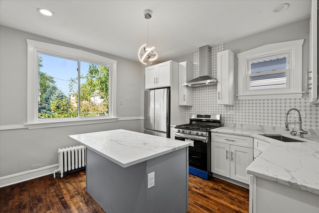HOME SITS ON A DOUBLE LOT! As soon as you walk in, you're welcomed by all the natural lighting that fills up your living room. Three bedrooms on the main level. GORGEOUS kitchen with all brand new appliances. Formal dining room AND kitchen island ideal for hosting! SECOND LEVEL- Primary bedroom with an ensuite bathroom with double sinks! Family room also on second floor, perfect for --working from home office, additional living room, etc! To top it off, you have a FINISHED BASEMENT, for entertainment all year-round or in-law arrangement with the 2 bonus rooms. Washer and dryer included! With this double lot, backyard is spacious enough to enjoy summer gatherings! Two car garage PLUS off-alley parking spaces. Home is located close to everything, easy access to I-290, close Chicago Downtown, shopping centers, schools, restaurants, etc!