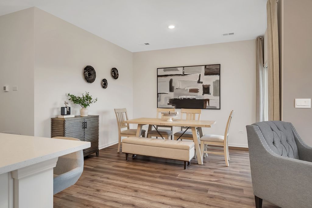 Envision yourself at 1124 Bluebell Lane in Bartlett, Illinois a beautiful new home in The Grasslands community. This ranch duplex home is ready for an immediate move-in! Homesite backs to open ground and includes fully sodded yard and covered back patio. The Taylor plan offers 1,505 square feet of living space with 3 bedrooms, 2 baths, and 9-foot ceilings. When you first enter the home you will see the secondary bedroom, full bathroom, and linen closet. Down the hall, you will walk into the open concept great room, kitchen, and dining. The kitchen layout includes a large island with an overhang for stools, 42-inch designer cabinetry with crown molding and soft close drawers. Additionally, the kitchen features a pantry, modern stainless-steel appliances, quartz countertops, and easy-to-maintain luxury vinyl plank flooring. Enjoy your private get away with your spacious primary bedroom and en suite bathroom with a raised height dual sink, quartz top vanity, and walk-in shower with clear glass shower doors. All Chicago homes include our America's Smart Home Technology. Photos are of similar home and model home. Actual home built may vary.
