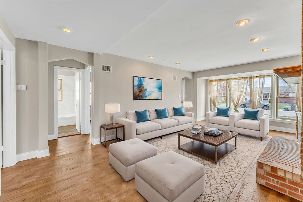 3 bedroom, 2 bath brick home with over 2400 total square feet. E bright living room and dining room combination with brick fireplace and refinished hardwood floors. kitchen and dinette area are tastefully updated with new cabinets, quartz countertops, appliances, and flooring. The dinette has a garden window allowing for lots of natural light. 3 bedrooms on main level, all with newly refinished hardwood floors. The finished basement will double your living space with recreation room, 3/4 bath large workout area, play area or easily convert to 2 extra bedrooms . 50' wide lot, side drive, garage with new overhead door and fenced back yard. New windows, roof approximately 7 years, Furnace and central air approximately 5 years, newer water heater.