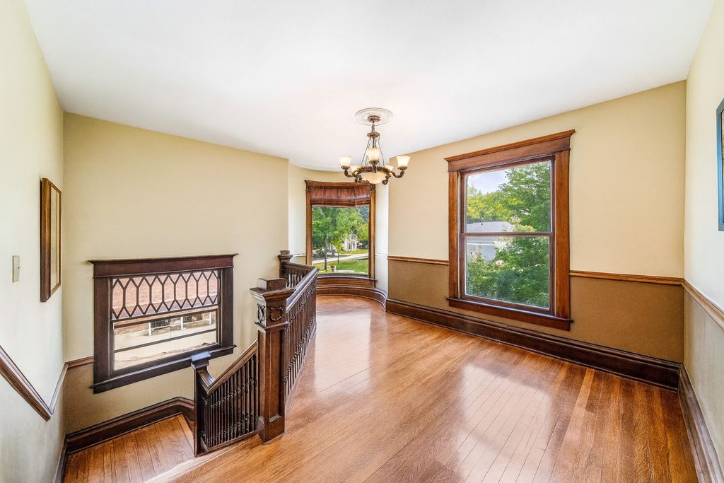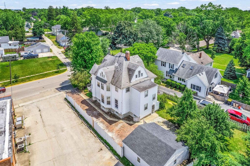 Welcome to this exquisite 3-story Victorian home, a true gem with timeless charm and modern amenities. This 5-bedroom, 2-full bath home offers natural woodwork and oak flooring throughout, pocket doors adding character and functionality. 9ft ceilings creating an airy, spacious feel. Kitchen with custom cabinetry and Corian countertops. Ornamental gas fireplace in the living room for cozy gatherings. Turret windows offering unique architectural appeal. Huge 3rd-story bonus room, perfect for a home office, studio, or additional living space. A convenient kitchenette on the second level. Updated, fully tiled bathroom with modern fixtures. Detached two-car garage providing ample parking and storage. Brick driveway made with western pavers from downtown Sycamore, IL. The front iron fence sourced from the historic railroad station in Arlington, KY. Partially fenced back yard with apple and pear trees, concord grape vines, and berry bushes. Whether you're looking for a spacious family home or a charming retreat, this property offers it all. Enjoy all the downtown amenities of charming Genoa.