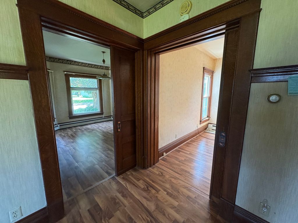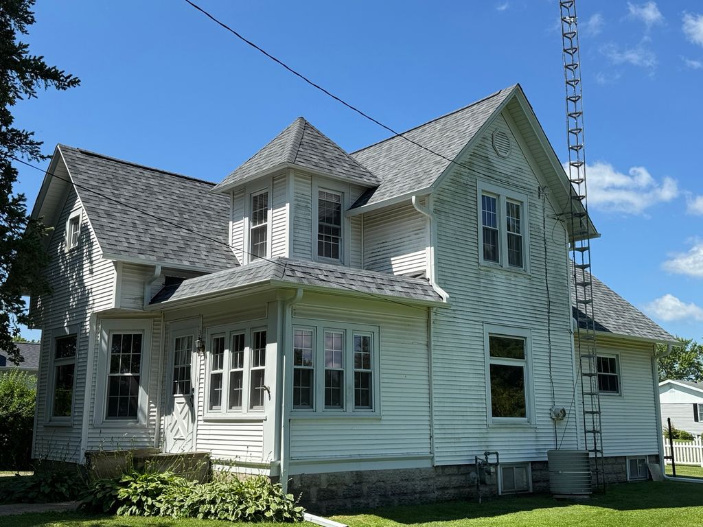 This charming two story home is all ready to move into. It still has all the natural wood work, pocket doors. In the living room is a beautiful wood plate rack that goes all around the wall to hold your memorabilia. Also, the home has a large family room and living room that is perfect for gatherings or just relaxing. A Master bedroom, bath and laundry and central air on first floor, front enclosed porch, 3 more bedrooms up with 3 large closets in the hallway as you enter the up stairs. Included is a 1.5 car detached garage with plenty of parking spaces out side for 6 vehicles. Plus, the location near a park and downtown. Newer roof and gutters (2025). This wonderful home has a lot of character, great features and won't last long! Call today for a showing! Realtor is related to the family! Home is sold AS IS!