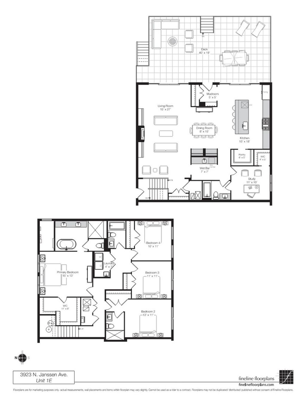 New construction 5BR / 4BA duplex-down in a great part of Lakeview, offering single-family-style living with high-end finishes throughout. The main level features an open-concept living and dining space and a chef's kitchen with custom cabinetry, walk-in pantry, Sub-Zero & Wolf appliances, and oversized island. Enjoy a separate wet bar area with beverage center outdoor living with a massive private front terrace with porcelain pavers. The lower level includes radiant heated floors throughout and the large primary suite which offers a spa-inspired bath, soaking tub, separate shower, and custom walk-in closet. Four additional bedrooms provide flexible living options. Additional features include white oak floors, custom millwork, Marvin windows, advanced soundproofing, smart wiring, garage parking, and a prime Lakeview location near dining, parks, and transit. ANTICIPATED DELIVERY: JUNE 2026. *Images of completed project are of recent build by same developer. *Renderings and plans, etc. are for marketing purposes only; finishes/plans may change at the discretion of Seller. Buyer(s) and their representation to confirm all finishes prior to purchase.