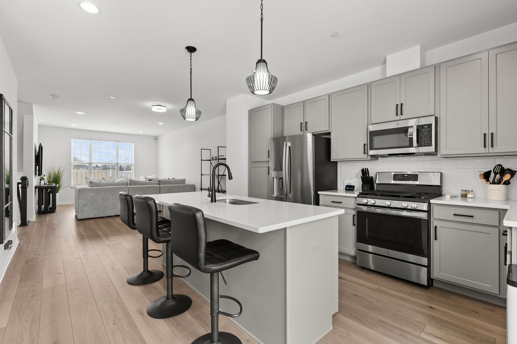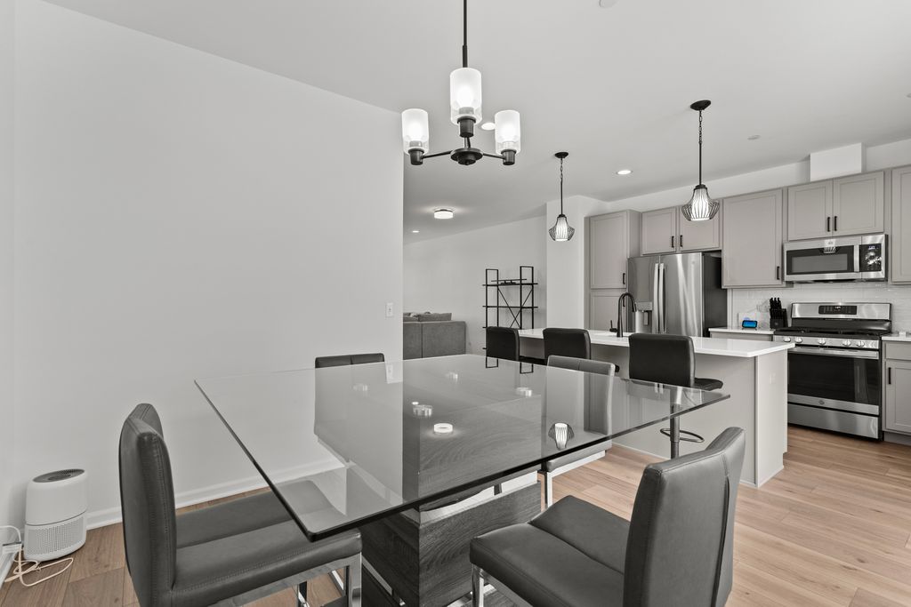 This Incredible Tri-Level Townhouse was built in 2024 and offers over 1,930 square feet of living space. The undeniable features include the transferrable 10 year builder warranty to provide a peace of mind (2 years in), the Electrical Vehicle charger that is conveniently located inside the attached 2 car garage, the spacious open concept floor plan that shows off the kitchen quartz countertops, the dark 4 inch cabinetry hardware, the mounted double sink island with a trash compacter that seats 4 comfortably, the stainless steel appliances, and the spacious dining and family area that you may rest your furniture on the mocha wooden flooring. Enjoy all the beautiful light fixtures, including the benefit of having the newer blue washer and dryer off the hallway on the 2nd floor, that is next to the master suite that provides a luxury and customized walk-in closet, and a bathroom with a roomy standing shower and double sinks. These 3 bedrooms with 2 and half baths townhouse, balcony off the kitchen and lower level recreational or family area has the style you have been waiting for! Schedule your showing now!