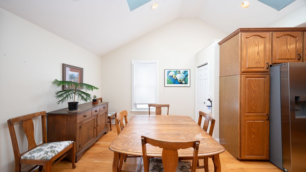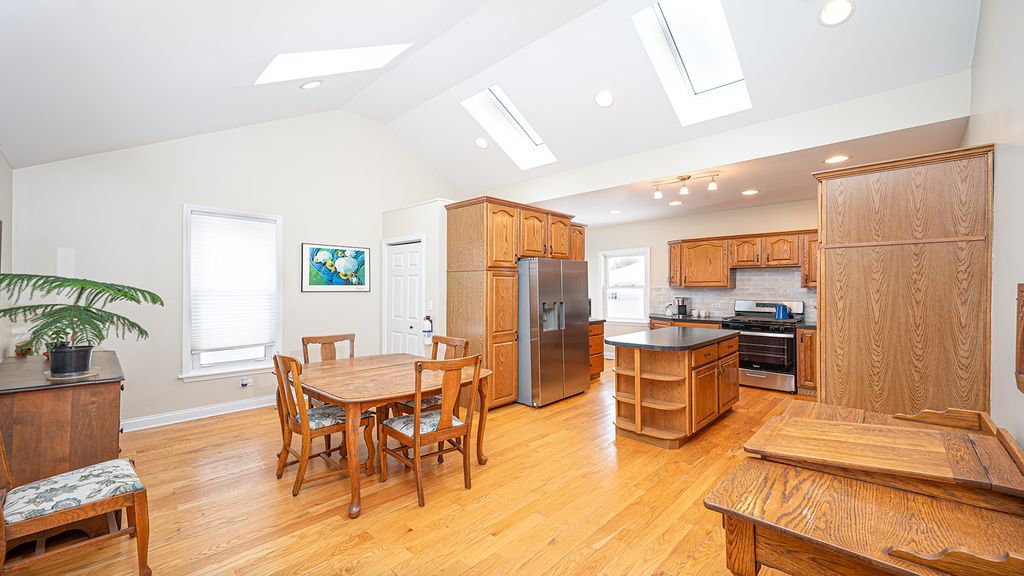 Welcome to this updated and modernly remodeled 3-bedroom, 2.5-bath home offering a perfect blend of style, comfort, and functionality. The home features a first-floor primary bedroom with a beautifully updated primary bath, all hardwood floors on the main level, and a partially finished basement with a half bath for added living space or home office. The updated kitchen includes vaulted ceilings, skylights, a tile backsplash, and appliances less than one year old. Major exterior upgrades include updated siding and a newer roof, complemented by an oversized two-car garage and a huge, newly paved asphalt driveway. There is also an area next to garage for added parking. Small laundry area with stackable washer and dryer next to kitchen. The plumbing, electric, water heater and hvac have all been updated. Enjoy relaxing on the enclosed front porch and the unbeatable walk-to-everything location-just steps from downtown, the train station, shopping, and dining. This home is truly move-in ready and offers exceptional quality and convenience.