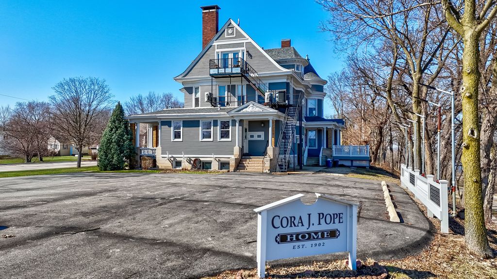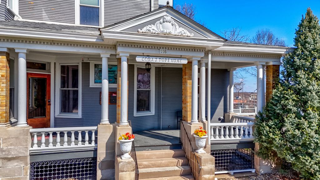 Welcome to the Cora J. Pope Home, one of Ottawa's most recognizable historic landmarks and a rare opportunity for anyone seeking a luxury Airbnb, boutique inn, or bed-and-breakfast property. Built in 1902 by Milton and Cora Pickens Pope, this Victorian masterpiece has been lovingly restored to its original grandeur while thoughtfully updated for modern comfort. Perched on a scenic bluff overlooking downtown Ottawa and the Illinois River, the home immediately impresses with its stately exterior, welcoming porch, decks and balconies, and intricate architectural details that have welcomed guests for more than a century. Inside, the grand foyer sets the tone with elegant woodwork and a hearth room featuring a fireplace, a stunning staircase, and warm gathering space. The adjacent full bathroom with a garden tub sits conveniently beneath the stairs. Off the hearth room you'll find a large formal parlor with space to relax, entertain, or simply enjoy the ambiance of a home with deep local roots; an elevator provides additional convenience. The family room offers another cozy retreat with a second fireplace, built-ins, and a turret-style sitting nook perfectly positioned for river views. The formal dining room is a showstopper with beamed ceilings, wainscoting, built-in china cabinet, and a fireplace, creating a timeless atmosphere for gatherings of any size. A kitchenette or butler's pantry with original cabinetry and leathered granite connects to the main kitchen, which blends modern stainless steel appliances with custom cabinetry designed to match the home's historic character. The main level also includes a bedroom currently used as an office, a full bathroom, and three additional flex rooms currently used as a gathering room, family room, and gift shop, offering excellent layout options for guest suites or business use. Upstairs, the expansive landing showcases leaded glass windows with sweeping river views and leads to four bedrooms, each full of character. Cora's room features birds-eye maple woodwork, a fireplace, and an en-suite bathroom with a stunning soaking tub and separate water closet. Milton's room also includes an en-suite bathroom and connects to an adjoining bedroom that can remain private or linked as a suite. The Starved Rock room sits next to a historic full bathroom with original "wet-set" subway tile and soaking tub. An additional full bathroom with tub/shower rounds out the second level. The third floor continues the home's rich character with the Riverview Suite, named for its stunning views, complete with French doors opening to a private balcony and an en-suite full bathroom. The Bishop's Suite features beautiful exposed brick, a walk-in closet, an impressive bath with curved walls showcasing a soaking tub, and an attached secondary bedroom and kitchenette, making it ideal for extended-stay guests. The basement houses exceptionally well-maintained mechanical systems, including a fire-suppression system with three 100-gallon tanks, dual boilers, anti-freeze protection, two sump pumps with French drains, 400-amp electrical service with a 220 plug, laundry area with egress window, and a convenient half bathroom. The elevator has been fully updated to current standards with new mechanical lines. Also on the property, sits a separate ranch home, currently rented. This property is a striking blend of history, luxury, and opportunity, offering an unmatched layout for short-term rental hosting, multi-suite accommodations, events, or a dream owner-occupied business. With its rich history, breathtaking views, restored architectural integrity, and modern updates, the Cora J. Pope Home stands ready for its next chapter. Don't miss the chance to own and operate a truly remarkable piece of Ottawa's heritage.