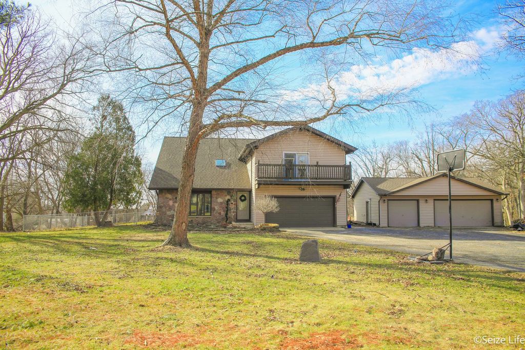 FRESH NEW PRICE! SPACIOUS 2-STORY ON~1 ACRE with FINISHED BASEMENT. Generous room sizes and flexible living spaces provide an excellent opportunity to personalize and add value. 2021 UPDATES INCLUDE: Homeowner-owned solar panels (no lease), new shingles, skylights, breaker box & surge protector, AC/Furnace, heat pump, and water heater. 2026 sump pump. The property features a large covered deck, and ample garage space with a two-car attached heated garage + a three-car detached- perfect for boats, etc. The yard includes a fenced-in area, ideal for a child's playground or pets. Plenty of room to raise your backyard chickens. Located north of Marengo with easy access to I 90. Enjoy a sunken, inviting living room, formal dining room, and family room. The kitchen includes double ovens, abundant oak cabinetry, and an eating area with sliders to the deck and in-ground pool, making indoor-outdoor entertaining effortless. Upstairs, discover four cozy bedrooms and a sunlit loft with built-in shelving, perfect for a reading nook, office, or play area. The master suite features a private balcony and a huge walk in closet. The finished basement adds a second family room with fireplace, bar, storage room, and full bath. This Home is perfect for entertaining, raising a family, and enjoying country living.