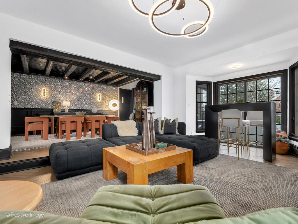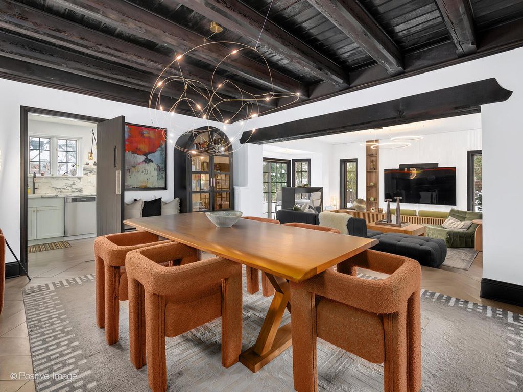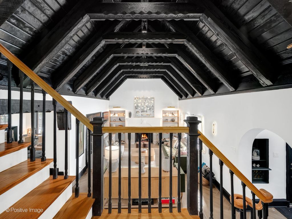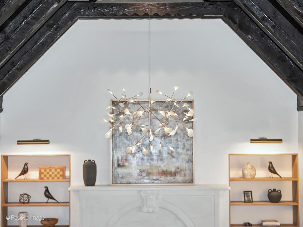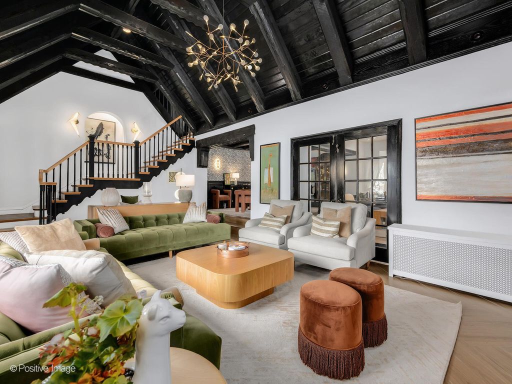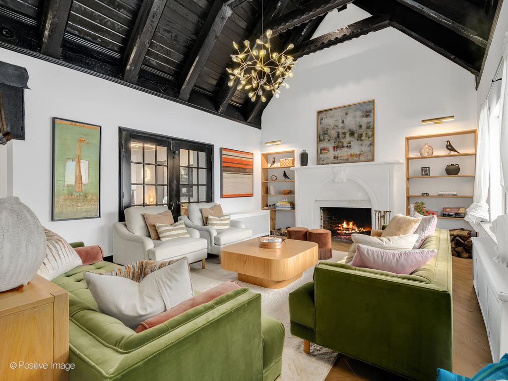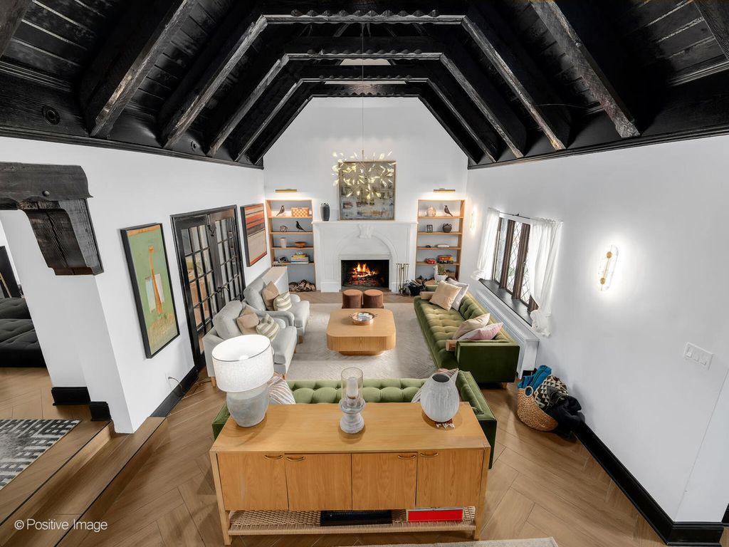 Storybook curb appeal meets magazine-worthy interiors in this extraordinary Cotswold-inspired, Zook designed Elmhurst residence, where timeless European architecture and bold modern design blend seamlessly throughout. From the snow-kissed brick and stone exterior with dramatic rooflines, decorative half-timber detailing and rare detached matching garage to the impeccable curated interior spaces, this home delivers irreplaceable character with elevated style at every turn. Inside the breathtaking main living room features exposed dark wood beams, sculptural statement chandelier, and stunning custom marble fireplace flanked by built-in bookcases. Layered textures, refined symmetry, and walls of natural light create a dramatic yet welcoming centerpiece ideal for both everyday living and unforgettable entertaining. A secondary lounge/family room offers a relaxed media and gathering retreat that can accommodate sectional seating and custom built-ins, flowing effortlessly into the formal dining room. This space features bold designer wallpaper and lighting, ceiling beams, custom millwork creating a setting built for memorable gatherings. The fully redesigned kitchen is a true showstopper, showcasing soft sage custom cabinetry, striking marble countertops and backsplash, premium appliances, designer pendants and an oversized workstation sink with sleek black faucet. A sun filled breakfast nook with custom built-in seating offers charming garden views and the perfect spot for morning coffee or casual meals. The main level is completed with a 1st floor bedroom and adjacent mudroom with plenty of built-in cabinetry and storage plus a designer powder room. A dramatic foyer features the turned staircase with rich wood treads and newer wooden railings invites one to explore the upper levels. The primary suite is a luxurious private retreat featuring expansive proportions, dramatic accent wall, custom window seating and boutique hotel ambiance. The spa-inspired primary bath offers a stunning walk-in marble shower with niche shelving, refined vanity and luxe finishes. Additional bathrooms throughout the home continue the elevated design with floating vanities, statement tile and custom lighting. Secondary bedrooms are generously sized and filled with charm and sunlit garden views. A beautifully appointed home office or studio offers a quiet, light-filled workspace ideal for today's lifestyle. Outdoors the private courtyard patio with checkerboard stone flooring provides a rare European-inspired entertaining space perfect for dining al fresco or quiet mornings under the trees! Set on a picturesque, tree-lined street in one of Elmhurst's most desirable neighborhoods this exceptional residence delivers architectural distinction, thoughtful design, and true statement-home presence rarely seen in today's market. This is a forever home with soul.