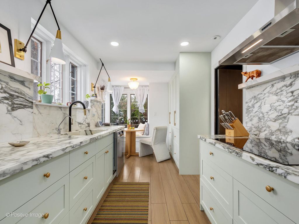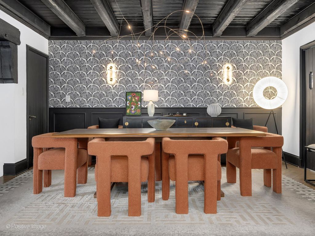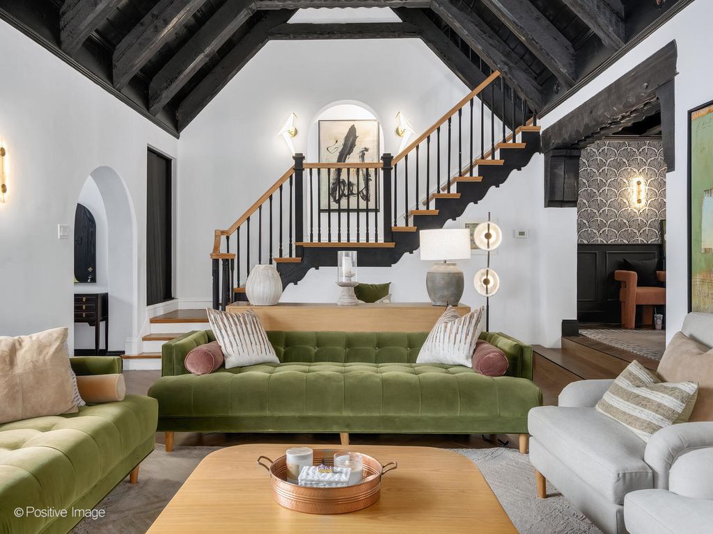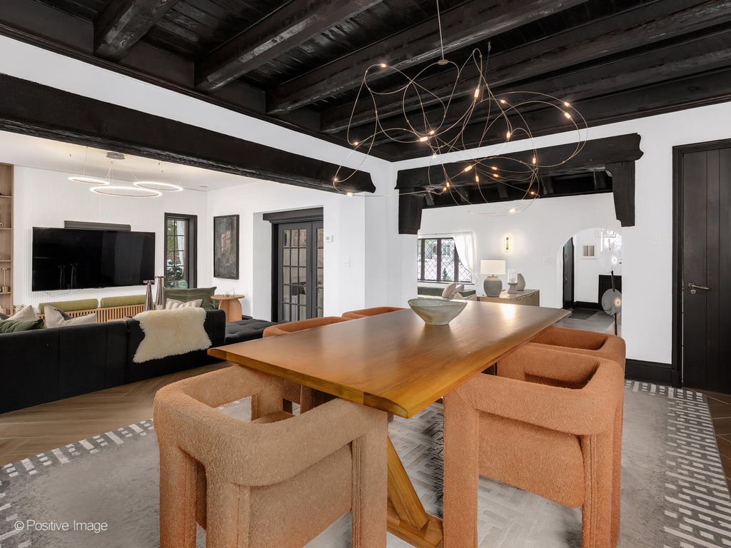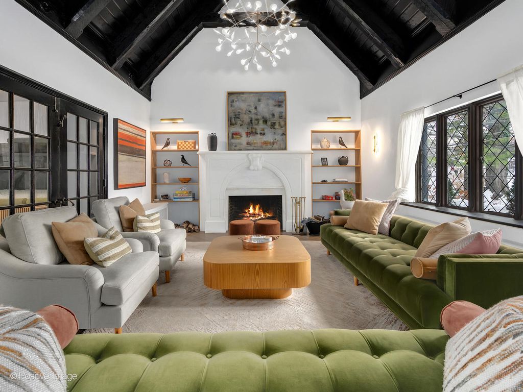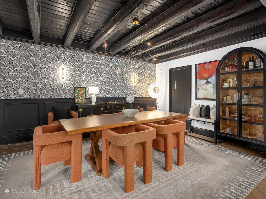 Storybook curb appeal meets magazine-worthy interiors in this extraordinary Cotswold-inspired, Zook designed Elmhurst residence, where timeless European architecture and bold modern design blend seamlessly throughout. From the snow-kissed brick and stone exterior with dramatic rooflines, decorative half-timber detailing and rare detached matching garage to the impeccable curated interior spaces, this home delivers irreplaceable character with elevated style at every turn. Inside the breathtaking main living room features exposed dark wood beams, sculptural statement chandelier, and stunning custom marble fireplace flanked by built-in bookcases. Layered textures, refined symmetry, and walls of natural light create a dramatic yet welcoming centerpiece ideal for both everyday living and unforgettable entertaining. A secondary lounge/family room offers a relaxed media and gathering retreat that can accommodate sectional seating and custom built-ins, flowing effortlessly into the formal dining room. This space features bold designer wallpaper and lighting, ceiling beams, custom millwork creating a setting built for memorable gatherings. The fully redesigned kitchen is a true showstopper, showcasing soft sage custom cabinetry, striking marble countertops and backsplash, premium appliances, designer pendants and an oversized workstation sink with sleek black faucet. A sun filled breakfast nook with custom built-in seating offers charming garden views and the perfect spot for morning coffee or casual meals. The main level is completed with a 1st floor bedroom and adjacent mudroom with plenty of built-in cabinetry and storage plus a designer powder room. A dramatic foyer features the turned staircase with rich wood treads and newer wooden railings invites one to explore the upper levels. The primary suite is a luxurious private retreat featuring expansive proportions, dramatic accent wall, custom window seating and boutique hotel ambiance. The spa-inspired primary bath offers a stunning walk-in marble shower with niche shelving, refined vanity and luxe finishes. Additional bathrooms throughout the home continue the elevated design with floating vanities, statement tile and custom lighting. Secondary bedrooms are generously sized and filled with charm and sunlit garden views. A beautifully appointed home office or studio offers a quiet, light-filled workspace ideal for today's lifestyle. Outdoors the private courtyard patio with checkerboard stone flooring provides a rare European-inspired entertaining space perfect for dining al fresco or quiet mornings under the trees! Set on a picturesque, tree-lined street in one of Elmhurst's most desirable neighborhoods this exceptional residence delivers architectural distinction, thoughtful design, and true statement-home presence rarely seen in today's market. This is a forever home with soul.