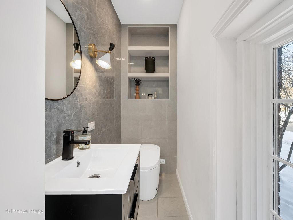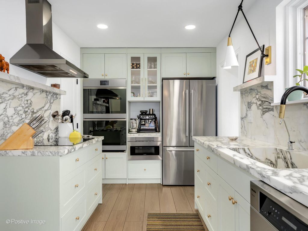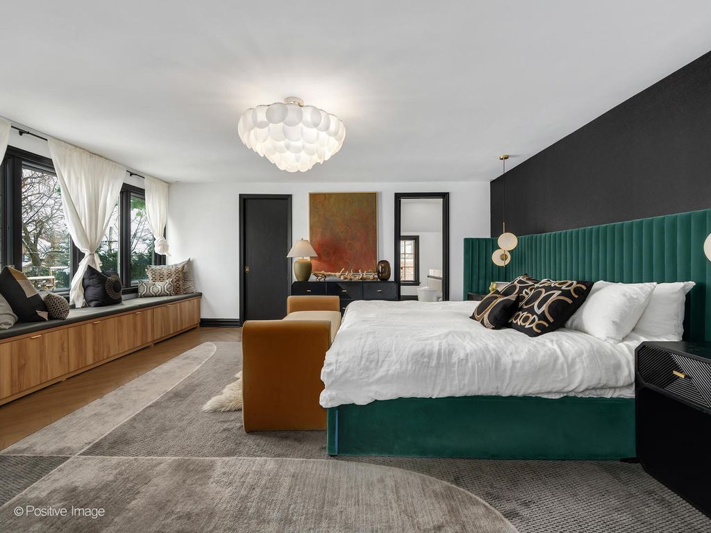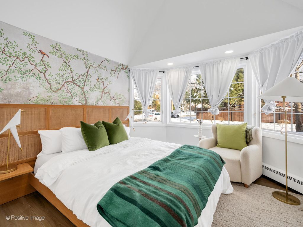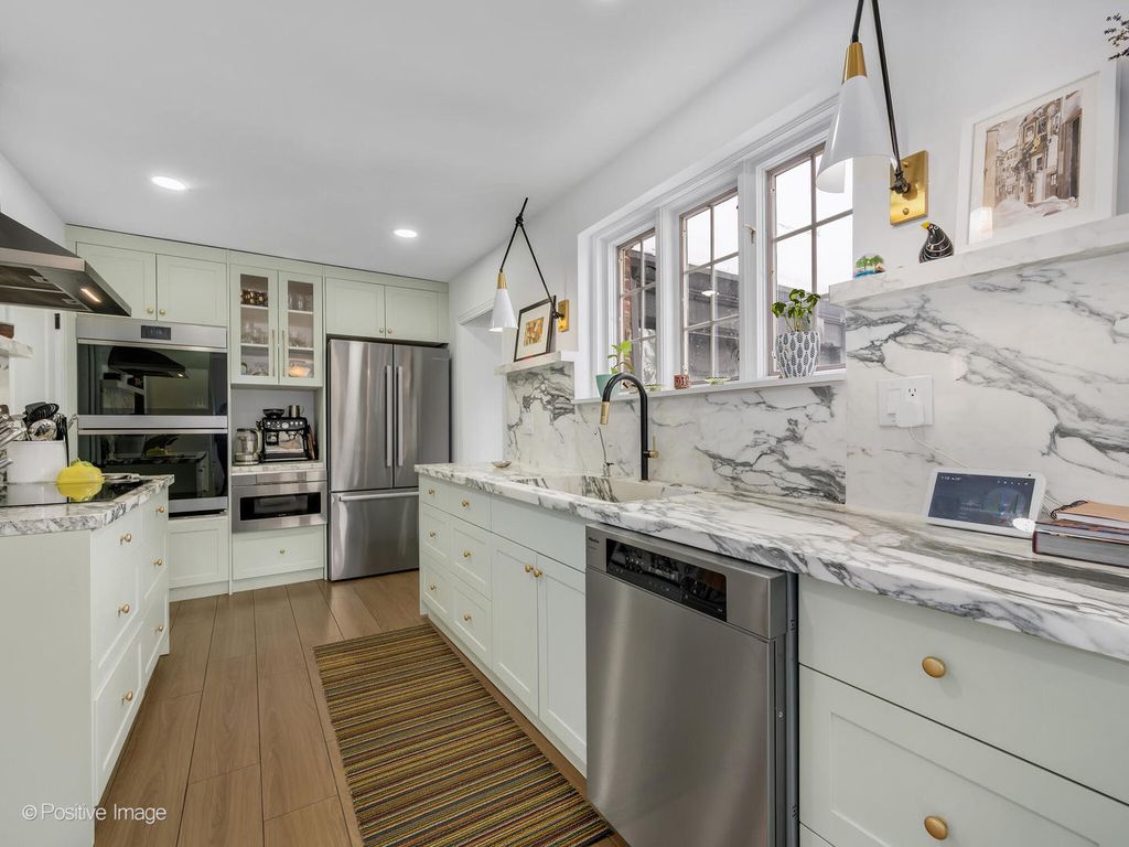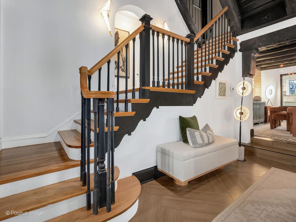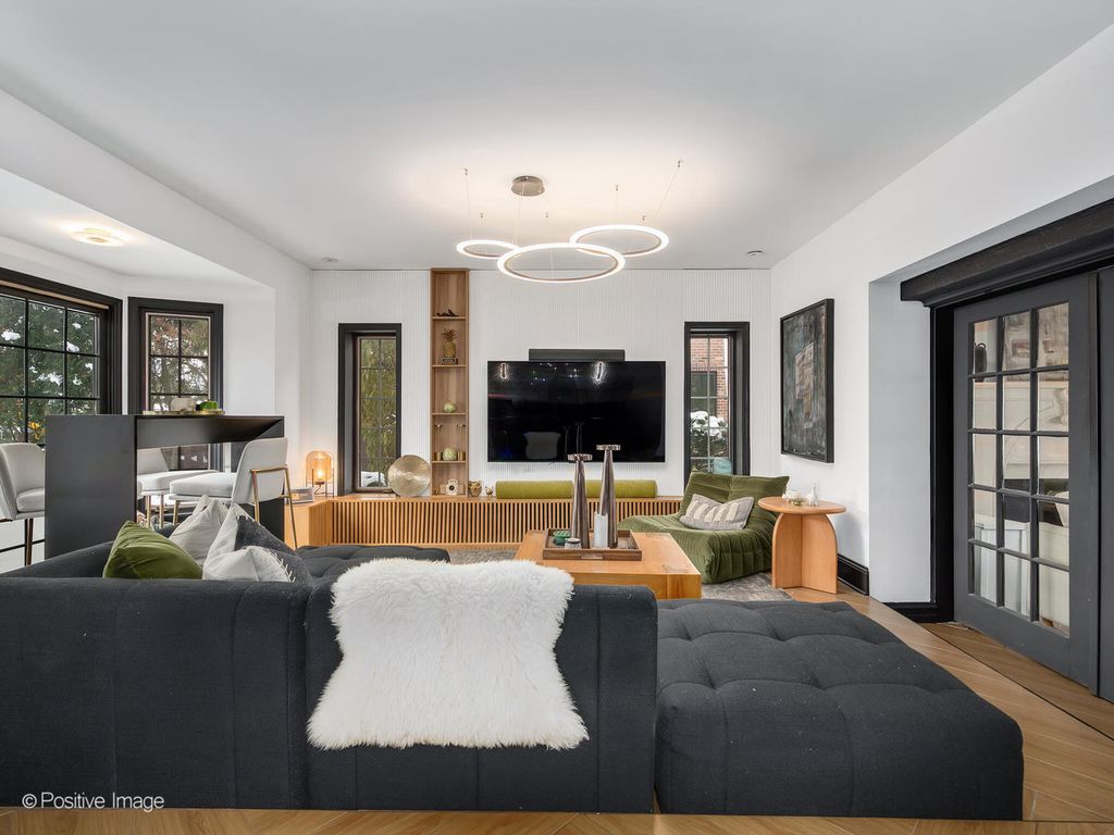 Storybook curb appeal meets magazine-worthy interiors in this extraordinary Cotswold-inspired, Zook designed Elmhurst residence, where timeless European architecture and bold modern design blend seamlessly throughout. From the snow-kissed brick and stone exterior with dramatic rooflines, decorative half-timber detailing and rare detached matching garage to the impeccable curated interior spaces, this home delivers irreplaceable character with elevated style at every turn. Inside the breathtaking main living room features exposed dark wood beams, sculptural statement chandelier, and stunning custom marble fireplace flanked by built-in bookcases. Layered textures, refined symmetry, and walls of natural light create a dramatic yet welcoming centerpiece ideal for both everyday living and unforgettable entertaining. A secondary lounge/family room offers a relaxed media and gathering retreat that can accommodate sectional seating and custom built-ins, flowing effortlessly into the formal dining room. This space features bold designer wallpaper and lighting, ceiling beams, custom millwork creating a setting built for memorable gatherings. The fully redesigned kitchen is a true showstopper, showcasing soft sage custom cabinetry, striking marble countertops and backsplash, premium appliances, designer pendants and an oversized workstation sink with sleek black faucet. A sun filled breakfast nook with custom built-in seating offers charming garden views and the perfect spot for morning coffee or casual meals. The main level is completed with a 1st floor bedroom and adjacent mudroom with plenty of built-in cabinetry and storage plus a designer powder room. A dramatic foyer features the turned staircase with rich wood treads and newer wooden railings invites one to explore the upper levels. The primary suite is a luxurious private retreat featuring expansive proportions, dramatic accent wall, custom window seating and boutique hotel ambiance. The spa-inspired primary bath offers a stunning walk-in marble shower with niche shelving, refined vanity and luxe finishes. Additional bathrooms throughout the home continue the elevated design with floating vanities, statement tile and custom lighting. Secondary bedrooms are generously sized and filled with charm and sunlit garden views. A beautifully appointed home office or studio offers a quiet, light-filled workspace ideal for today's lifestyle. Outdoors the private courtyard patio with checkerboard stone flooring provides a rare European-inspired entertaining space perfect for dining al fresco or quiet mornings under the trees! Set on a picturesque, tree-lined street in one of Elmhurst's most desirable neighborhoods this exceptional residence delivers architectural distinction, thoughtful design, and true statement-home presence rarely seen in today's market. This is a forever home with soul.