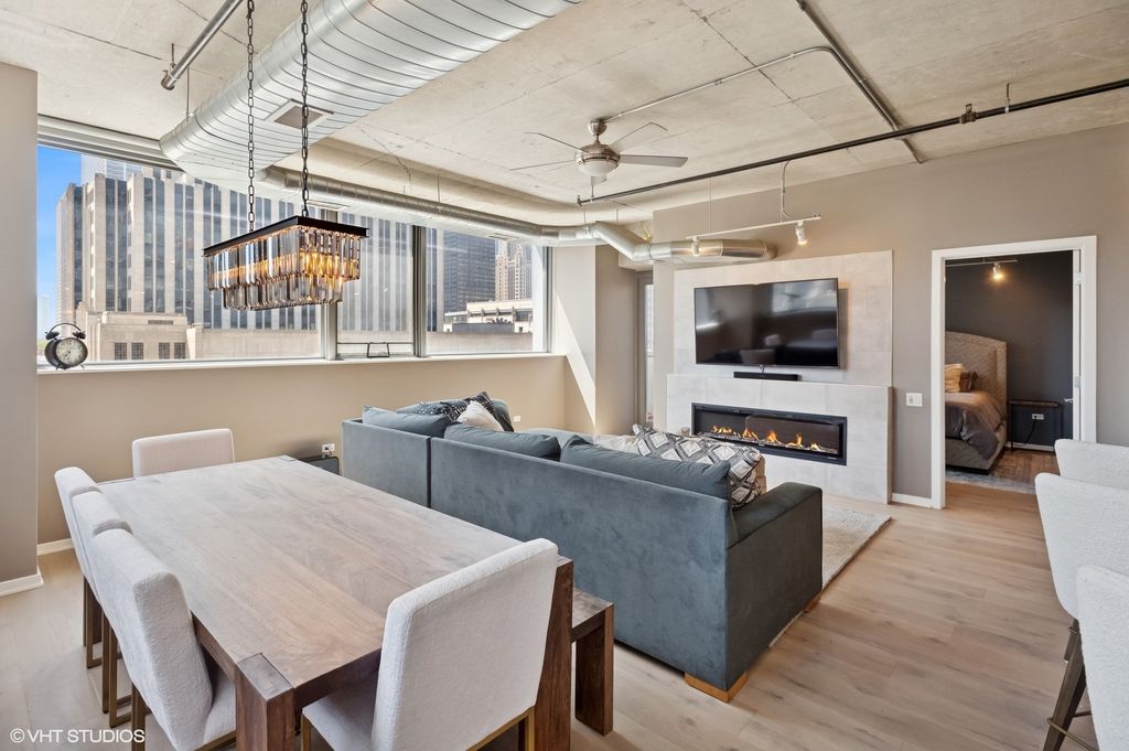 Immerse yourself in an elevated expression of urban sophistication in this southeast corner loft-inspired residence, a luminous 2-bedroom, 2-bath sanctuary tucked within the heart of Streeterville. From the moment you step inside, the home reveals a harmonious blend of modern elegance and effortless livability. An expansive open layout anchors the interiors, where the kitchen, dining area, and living room converge in one continuous, beautifully scaled space ideal for both intimate gatherings and refined entertaining. The chef's kitchen stands as its own sculptural centerpiece-an oversized island, sleek stainless-steel appliances, and a gas range with designer venting all framed by clean architectural lines. The tranquil primary suite evokes a boutique-hotel sensibility, offering two generous closets, balcony access, and a spa-inspired en-suite bath appointed with dual vanities, a separate glass-enclosed shower, and a deep soaking tub. A spacious secondary bedroom accommodates a queen bed with ease, making it perfect for guests or a thoughtfully designed home office. Throughout the home, rich hardwood floors, a striking fireplace, custom closet build-outs, an in-unit washer/dryer, and abundant pantry storage elevate everyday living. The full-amenity building enhances the lifestyle further with a 24-hour door person, outdoor pool, state-of-the-art fitness center, dedicated cardio room, business and media lounges, and even a private dog run-all complemented by the convenience of Whole Foods just steps away. Set within one of Chicago's most dynamic neighborhoods, residents enjoy walkable access to the lakefront, the Riverwalk, Northwestern Memorial Hospital, Navy Pier, the Magnificent Mile, and countless cultural destinations. Parking available for an additional $40,000.
