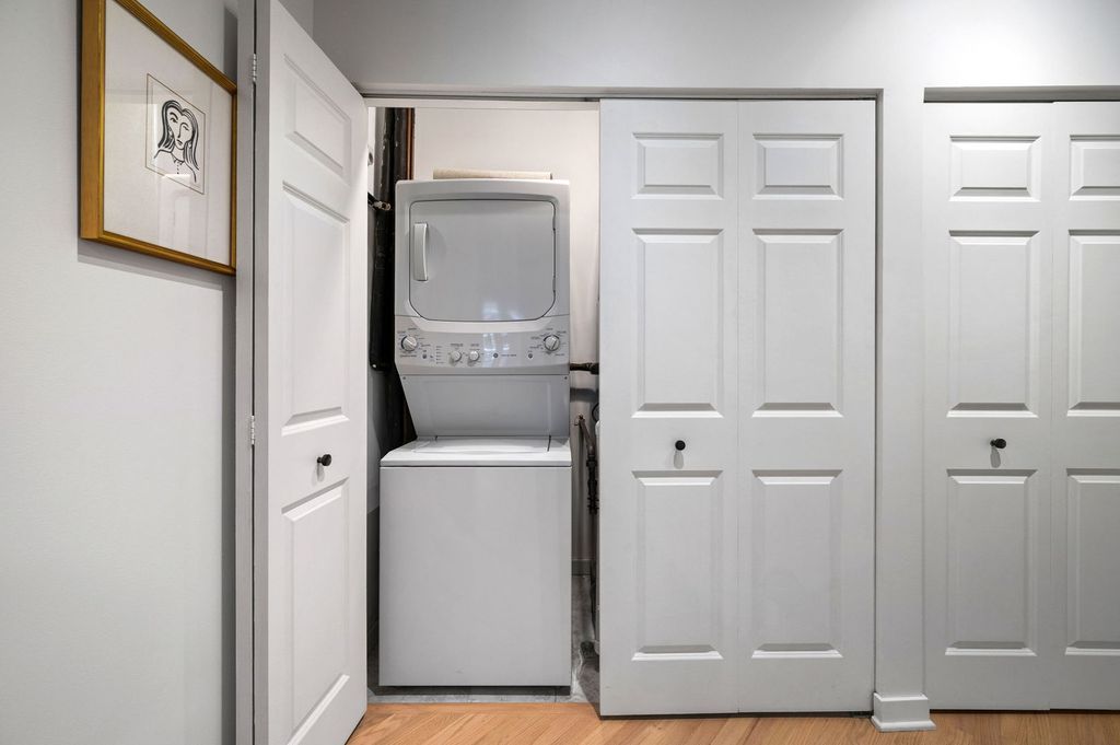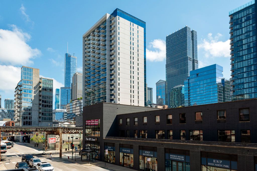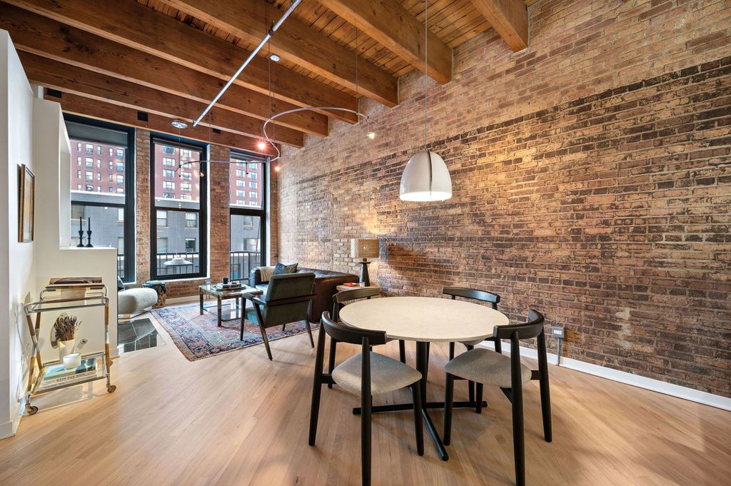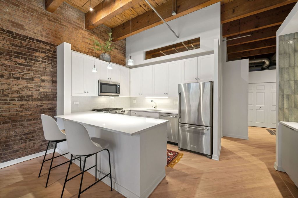 Enjoy this beautiful brick and timber 2 bed /2 bath loft unit in River North. With super sunny south-facing exposure, this end unit fills with light from floor to ceiling windows and features soaring thick-beamed ceilings and exposed brick in every room with two fully enclosed bedrooms. Remodeled in 2021, the kitchen features 42" Edgecomb Gray cabinets, all stainless steel Kitchen-Aid appliances, Artic White quartz counters, translucent glass backsplash, extra deep under-mount sink, faucet with sprayer, and under-cabinet lighting, plus a beautiful new bar area with beverage storage. Hardwood floors have been newly refinished throughout in a natural matte oak finish while the living/dining rooms are open and ideal for entertaining with a new composite decking balcony off the living room. A gas start fireplace is included and perfect for cozy-ups in winter. This split floor plan is ideal for a work-from-home office while still allowing for a complete guest suite. The primary bedroom is large enough for a king-sized bed and the entire unit has been freshly painted with tons of organized closets. A new Bryant 2.5 ton air conditioner was installed in July 2020 plus brand new Lenox furnace in 2025 including a convenient remote control Nest thermostat. Deeded garage parking an additional $15,000 located next door. A walk-in storage room is also included. Building also has a brand new common roof deck. Location is ideal convenient to plenty of restaurants, bars, transportation and East Bank Club. A loft lovers dream in River North.