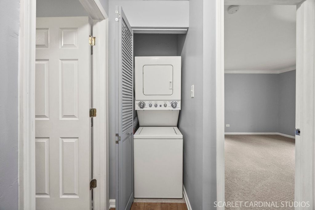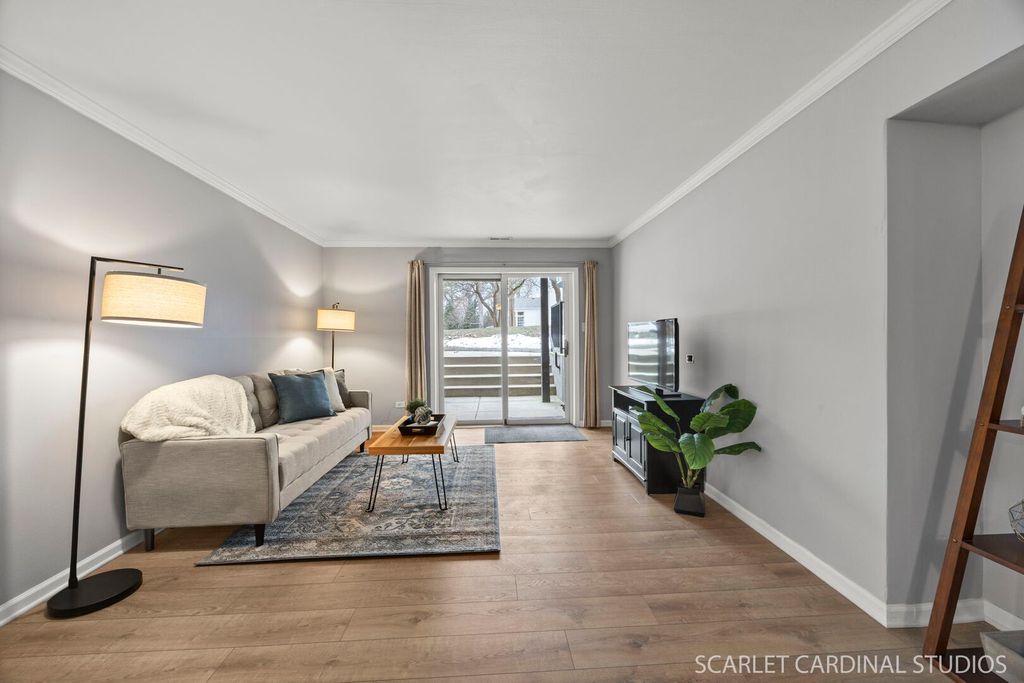 Say HELLO to this super darling freshly updated Condo in Wheaton! New wood laminate flooring is throughout the living room, dining room, kitchen and hall. Convenient in-unit laundry. Great bedroom and closet spaces. 2 full baths including a private primary ensuite with walk-in closet. Stainless Steel appliances and beautiful maple cabinetry. A sliding door provides garden level access to a covered concrete patio and easy access to Stonebridge Trail street parking - great for guests or unloading groceries, etc. Many great nearby places to explore such as Cantigny Park and Golf; Atten Park with trails and fields; Marianjoy Hospital grounds and paths; and Hurley Gardens. Terrific District 200 Schools. One assigned parking spot is included in the main lot marked B2 - just outside the main entrance. Abundant guest parking is also available. Association Fees include water and sewer and garbage. Water Heater 2024; Dishwasher 2022; Garbage Disposal 2025; Wood Laminate Flooring and Carpet 2025. Don't miss this great opportunity!