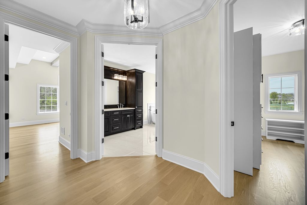 Welcome to this stunning custom-built new construction home located in New Lenox's upscale Steeple Run subdivision. Landscape just completed! Set on a generous .6 acre lot, this 4,879 sq ft residence is thoughtfully designed with the finest selections and craftsmanship throughout. The first-floor primary suite is a true retreat, featuring a spa-like ensuite bath and a professionally designed walk-in closet. The heart of the home is the gourmet kitchen, boasting custom cabinetry, quartz counters with full backsplash, high-end appliances, a spacious island, casual dining area, and a butler's pantry - perfect for entertaining. There is even a built-in wireless phone charger in kitchen quartz! Enjoy soaring ceilings in the two-story family room with a Heat n Glo fireplace and coffered ceiling, or get work done in the elegant first-floor study, highlighted by French doors and White Oak ceiling beams. A light-filled formal dining room, adorned with windows and a beautiful chandelier, adds the perfect touch of sophistication. The main-level Media room off the foyer offers versatility-ideal as a playroom or second office. The home features 6" Select White Oak plank hardwood flooring throughout main floor and second floor hallway, custom trim, and detailed woodwork throughout. Upstairs, you'll find three generously sized bedrooms, each with walk-in closets. One has on suite bath, while the other two bedrooms are joined by Jack and Jill style layout. The main-level laundry room and mudroom with built-in lockers add everyday convenience. Additional highlights include: 3-car side-load garage with epoxy flooring, Unfinished basement with rough-in plumbing, Dual furnaces for optimal comfort & Professionally landscaped yard with irrigation system. Located in the Lincoln-Way Central School District and New Lenox Grade Schools. Home is just minutes from Sanctuary Golf Course, shopping, dining, Metra, and I-80/355. Property has city water. Don't miss your chance to own this truly exceptional home in one of New Lenox's most exclusive neighborhoods.