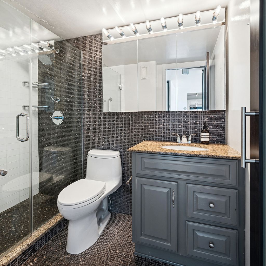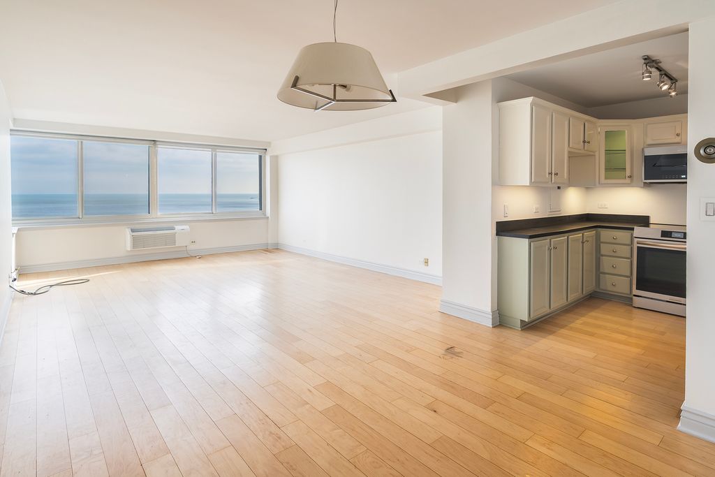 Generously sized one-bedroom residence offering beautiful lake views from both the living room and bedroom. Maple hardwood floors run throughout the main living areas, paired with upgraded interior doors featuring frosted glass and wood trim for a clean, modern aesthetic. The kitchen is bright and functional with white cabinetry with glass-front uppers, stainless steel appliances, and a deep oversized sink ideal for everyday cooking and entertaining. The primary bedroom is well-proportioned and is complemented by a second, professionally organized walk-in closet located just across the hall, providing excellent storage and flexibility. The bathroom has been tastefully renovated with a glass-enclosed walk-in shower and custom mosaic tile finishes. Full-amenity, professionally managed building with 24-hour door staff, newly updated lobby and party room, fitness center, bike room, and an expansive rooftop sundeck fully refreshed in 2025 with new furniture, grills, and railings, offering panoramic 360-degree views of the lake and city skyline. Dog-friendly building.