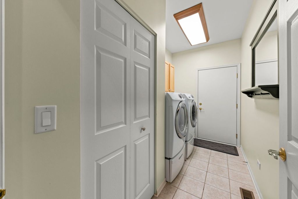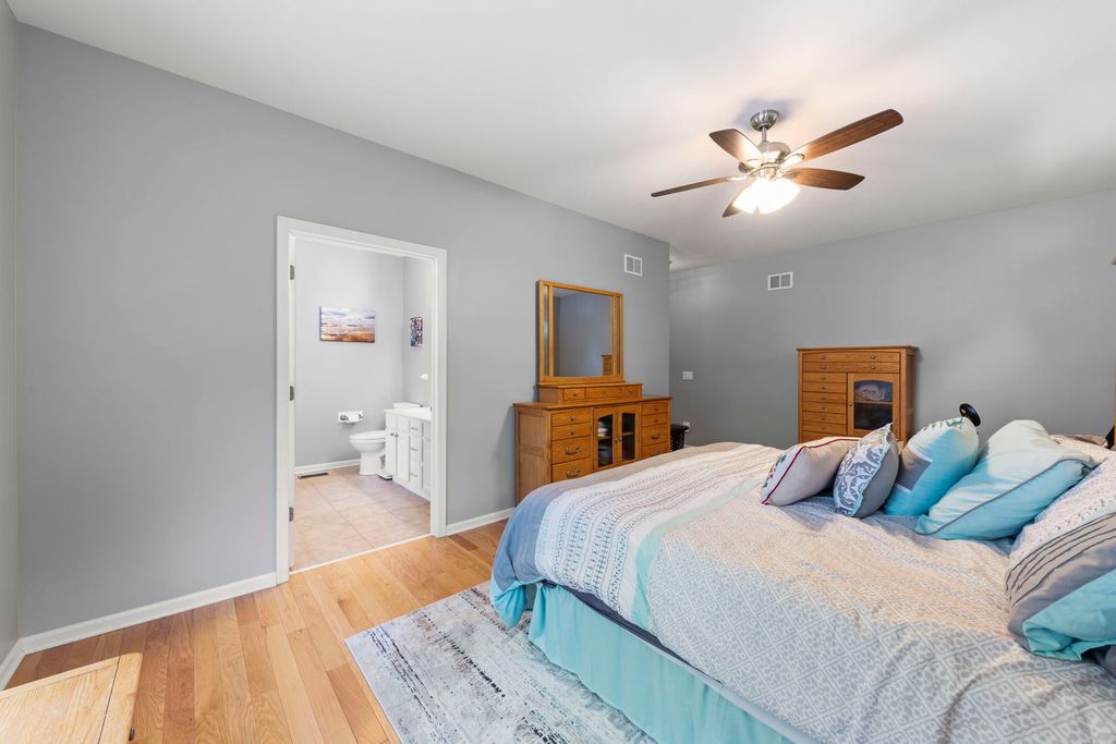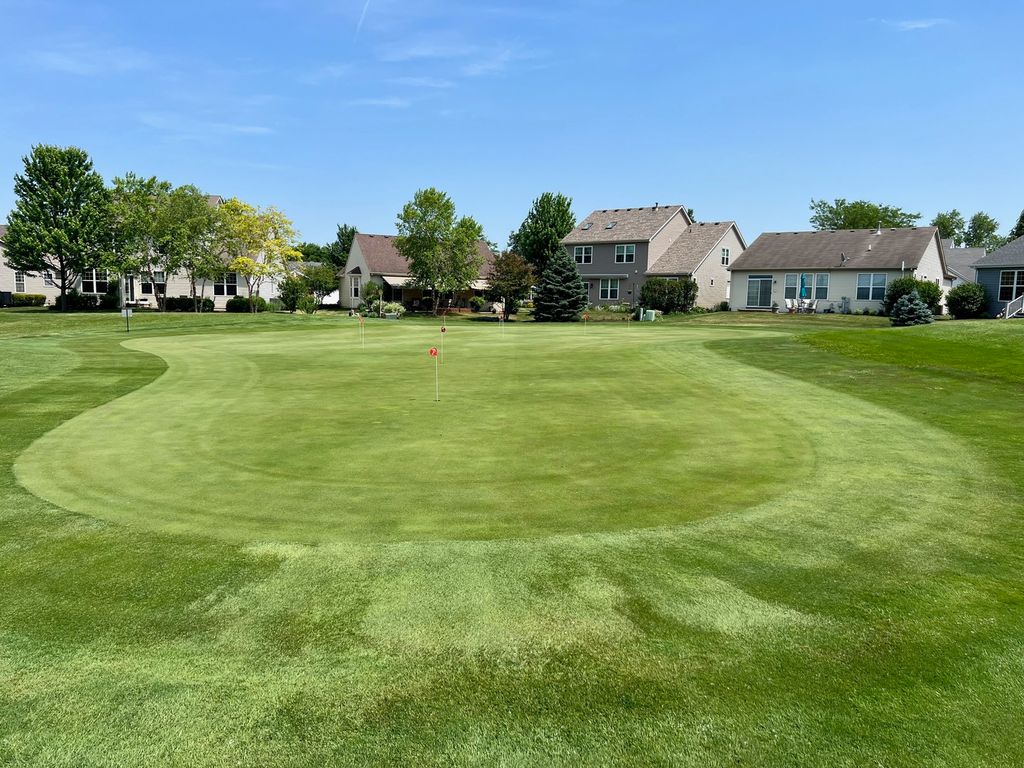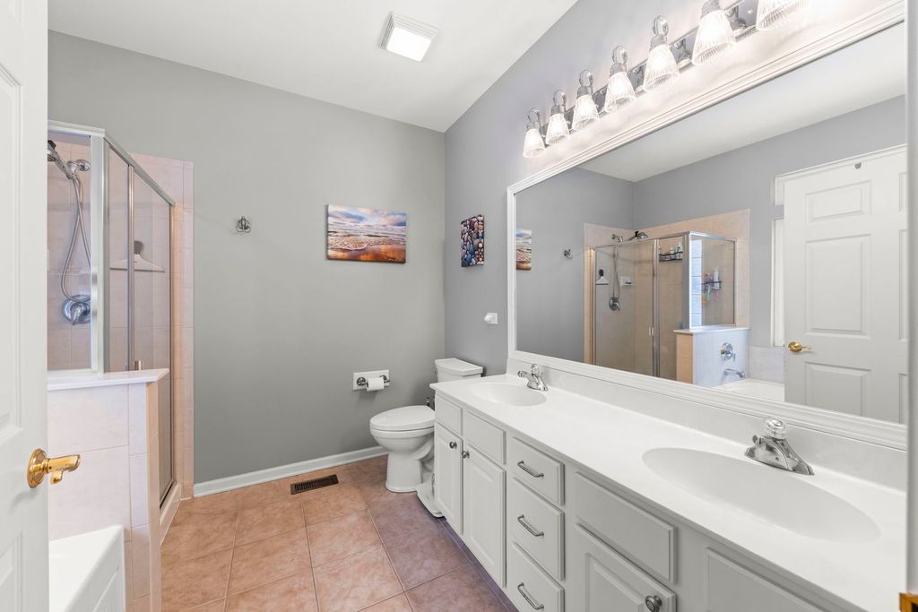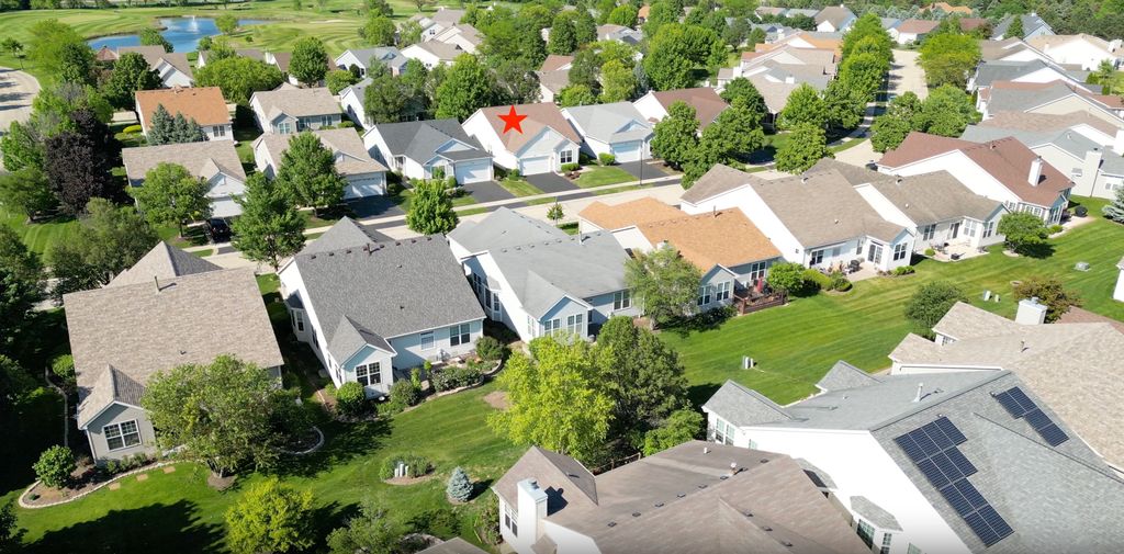 Introducing the highly desirable and rarely available Palm Springs floor plan in the resort-style 55+ community of Carillon Lakes-perfectly located just a short walk from the 18,000 sq. ft. clubhouse, putting you in one of the most sought-after spots in the entire neighborhood! This exceptional dual-primary layout features two huge bedrooms, each with its own private bathroom, and walk-in closet, plus a dedicated office/den that can be converted to a 3rd bedroom and an open, flexible floorplan. The home welcomes you with a bright foyer leading into an expansive living and dining area that can remain separate or be combined into an impressive 11'x32' great room. Large windows fill the space with natural light, and low-pile carpeting offers easy accessibility. The 12'x20' primary suite includes hardwood floors, a generous walk-in closet, and a private bathroom with a soaking tub, shower, and dual sinks. The kitchen offers abundant Corian counter space, white cabinetry, stainless steel appliances, a pantry, and room for an island or breakfast table. Directly adjacent is a versatile family room/dining area with access to a beautiful brick paver patio through new sliding doors, complete with a remote-control awning for shade and comfort. The 12'x16' second bedroom is oversized with its own walk-in closet and convenient access to the guest bath. Additional highlights include a full 9' deep-pour basement with rough-in plumbing, backup sump pump, first-floor laundry, and an attached 2-car garage. Major updates include a furnace and A/C approximately 5 years old, newer Aprilaire Humidifier, and water softener, and a roof about 7 years old. Outside, the community maintains weekly lawn care, snow removal, driveway resealing, and mulch replacement giving you true low-maintenance living. Carillon Lakes offers an unparalleled lifestyle with indoor and outdoor heated pools, a grandkid's pool, a hot tub, a large fitness center, art and ceramics studios, billiards, poker and ping-pong rooms, a grand ballroom for weekly events, an aerobics/dance studio, a 3-hole golf course, and miles of walking and biking paths circling 3 stocked fishing lakes. Conveniently located near Weber Rd. and Renwick Rd., you're just minutes from shopping, dining, entertainment, and easy access to I-55 and I-80. Homes with this floor plan and location are rarely available-schedule your showing today!
