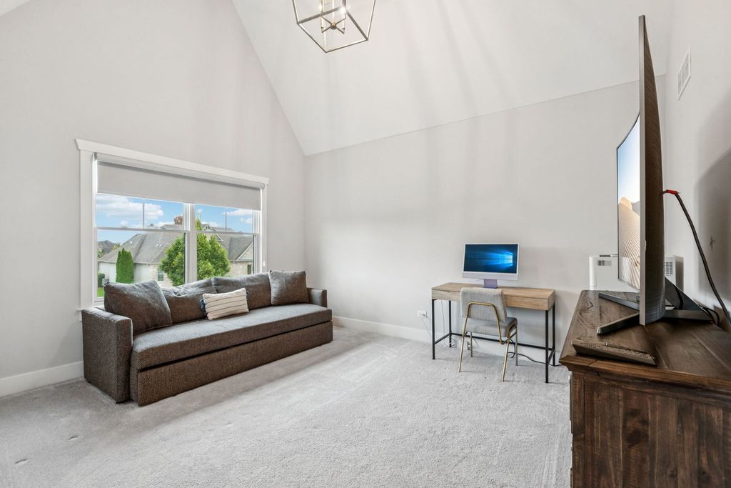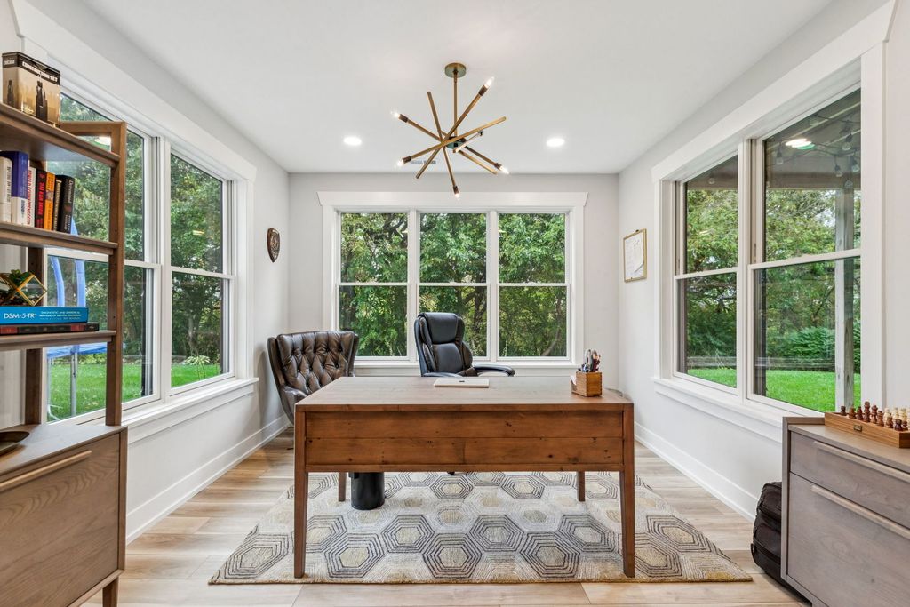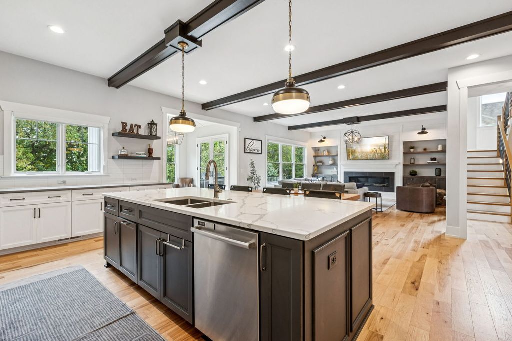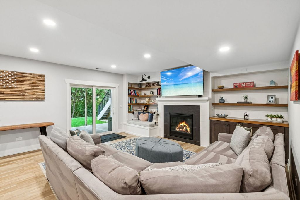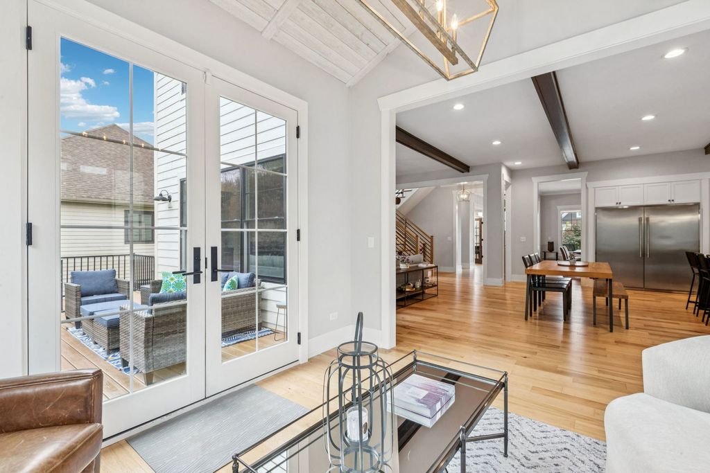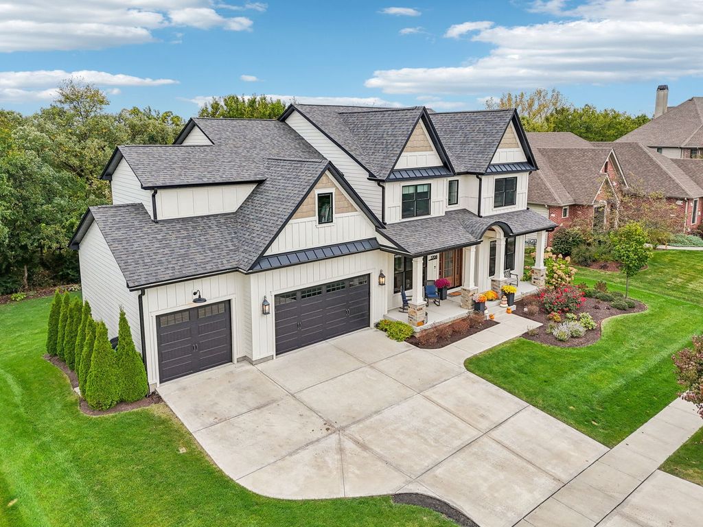 Better-than-new DeMarcco-built modern farmhouse located in the sought-after Highland Woods community of Elgin, Illinois. Built in 2020 with timeless craftsmanship and a fresh, modern design. The main level features beamed ceilings, rich hardwood flooring, and an open layout ideal for entertaining and everyday living. The chef's dream kitchen is appointed with top-of-the-line appliances, custom cabinetry, and a spacious island that connects seamlessly to the dining and great room. A bright sunroom captures backyard views, while a private den provides the perfect home office space. Upstairs, the primary suite impresses with an amazing spa-style bathroom and generous walk-in closets. The walk-out lower level, finished in 2021, offers a large family/rec room with fireplace, wet bar, full bath, bedroom, and private office-ideal for guests or extended living. Energy-efficient Pella windows fill the home with natural light, showcasing every thoughtful detail. Residents of Highland Woods enjoy access to a pool, clubhouse, fitness center, parks, and walking trails, all within the highly regarded District 301 schools. A rare opportunity to own a home that perfectly blends modern comfort, luxury finishes, and community living.