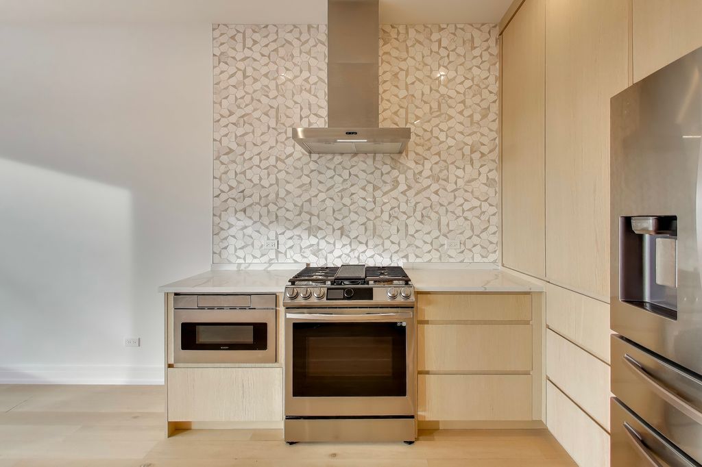 Looking for a Bronzeville condo that actually lives like a home? Welcome to the Flats on Vincennes, an all-brick duplex that gives you the space, light, and privacy you desire. This large, two-level home offers an easy, functional layout with plenty of room to breathe. The open living and dining area is bright, ideal for hosting, relaxing, and of course, everyday living. The kitchen is modern and sleek: quartz countertops, floor-to-ceiling cabinetry, large island with seating for four, and stainless steel appliance suite: French-door refrigerator with smart screen, gas range, dishwasher, microwave, and chef's hood, all accented with mosaic backsplash. There are three bedrooms and two full baths, including a spacious primary suite with a walk-in closet and an ensuite, which includes: a double vanity with a makeup counter, modern mirrors, and accent lighting, and spa-style bath with a rainshower and body sprays. There is also a dedicated laundry closet with room for a sink or cabinetry and storage throughout. Now, let's talk about the standout exterior feature: Your private garage parking and a rooftop deck over the garage, perfect for summer nights, morning coffee, or entertaining friends. Set in the heart of Bronzeville, you're close to public transit, Lake Shore Drive, the Dan Ryan, and everything that makes the neighborhood special. This is a move-in-ready home that offers scale, comfort, and location, without the single-family price tag.