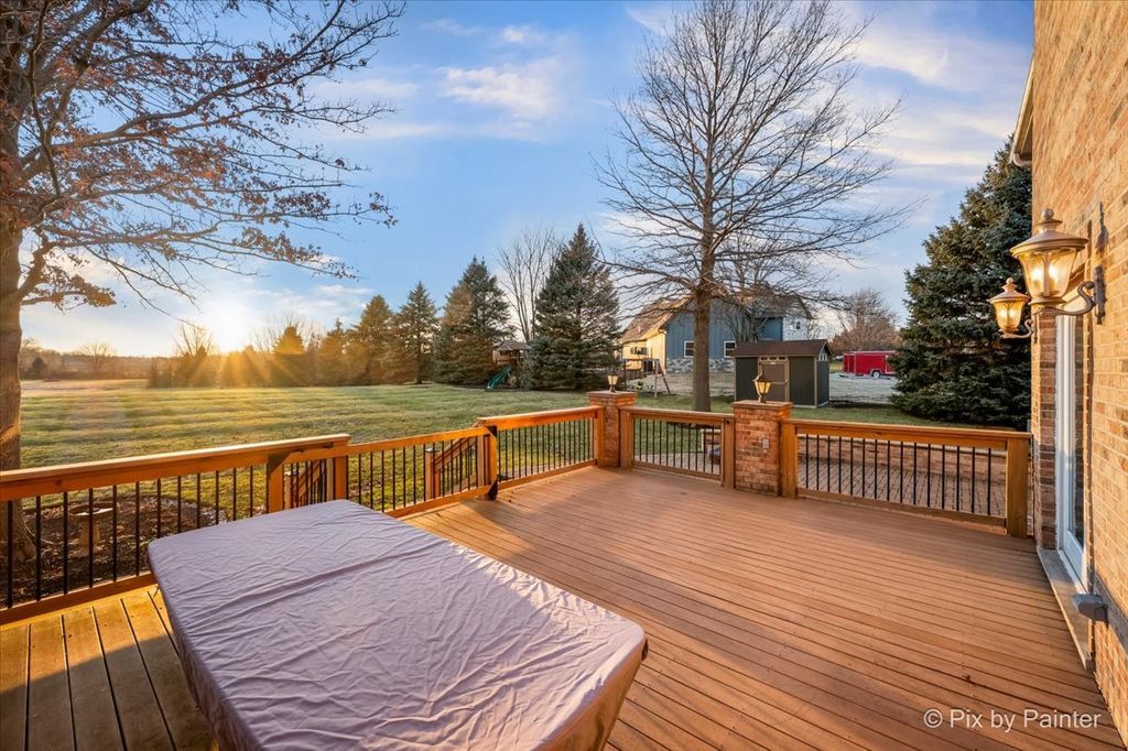 Welcome to this exceptional brick home set on over an acre lot in the highly sought-after Pebble Creek community of Huntley. Offering 3,362 square feet above grade plus a beautifully finished basement, this home delivers space, comfort, and timeless quality in a premier location. The sun-drenched, open-concept layout is ideal for both everyday living and entertaining, featuring sizable rooms throughout. The kitchen is thoughtfully designed with 42" cabinetry, double oven, updated appliances, and hard-surface countertops, flowing seamlessly into the inviting family room highlighted by a gorgeous stone fireplace. A first-floor office and large mudroom with built-ins add everyday functionality. The finished basement expands the living space with a recreation area, bar space, ample storage, and a full bathroom, making it perfect for entertaining or extended living. Retreat to the luxurious primary suite, complete with a private sitting room/flex space, spa-like ensuite bath with soaking tub, separate shower, dual vanities, and a huge walk-in closet. Step outside to the stunning patio and deck areas, perfect for entertaining and relaxing. The patio features a convenient natural gas hookup for your grill so that you can enjoy endless summer barbecues without the hassle of propane tanks, and the spacious deck offers plenty of room for outdoor dining and lounging. This home has been extensively updated for peace of mind, including: Furnace & A/C (2016), hardwood floors refinished (2020), new carpet and fresh paint (2020), central humidifier (2020), water softener (2020), full chimney sweep and cleaning (2020), active radon mitigation system, iron filtration system (2021), new sump pump (2024), and newer kitchen appliances. Located in highly rated School District 158 and just minutes from shopping, dining, and expressway access, this home offers the perfect blend of luxury, location, and lifestyle. A rare opportunity and true gem-schedule your private showing today!