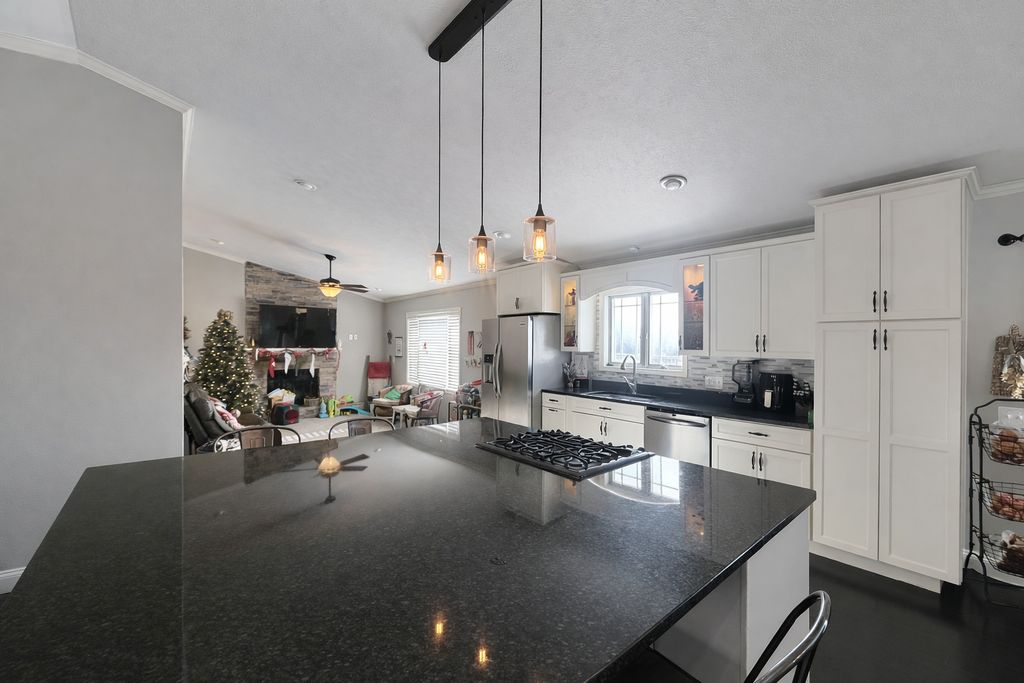 Stunning 3 bedroom, 2 bathroom Ranch home located in town. Open floor plan with custom kitchen, granite countertops and large island. Primary bedroom has walk in closet and full bathroom. Main floor laundry. Finished lower level features an additional living space as well as a wet bar for entertaining. Backyard is fully fenced with newer stamped concrete patio, freshly landscaped river rock and storage shed. New roof in 2025, Furnace 2019, AC Capacitor 2025, Water Heater 2019. Whole house remodel in 2016. Woodburning fireplace sold "as is" seller has not used it.