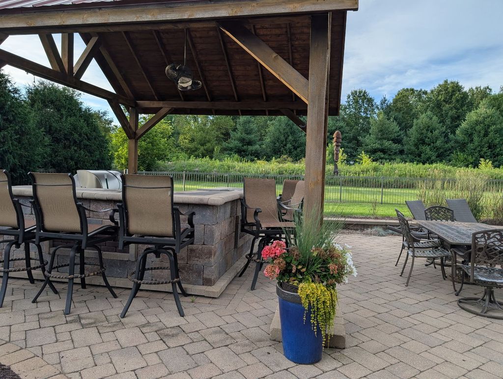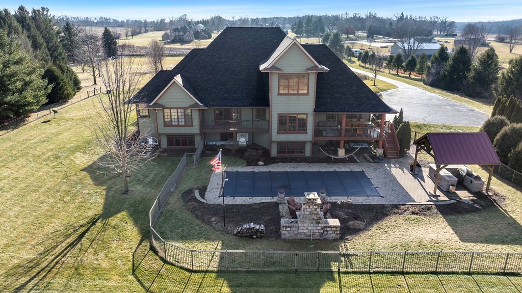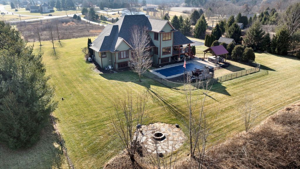 6400+SF living space | 5.41 Acres | Cherrywood Flooring through-out | Primary 1-private covered deck, bathroom with whirlpool tub, walk-in shower w/attached sauna, his & hers closets | Primary 2-private entrance to main covered deck, large walk-in closet, full bath | Open concept living-Redwood columns-Expansive ceiling heights-custom Fireplace w/built-ins | Chef's kitchen-Cherry cabinets-Limestone counters-large island with prep sink-3 Full ovens-microwave/wall oven (12/25)-gas cooktop-beverage fridge-eat in area with sliders out to covered deck w/access to back yard | Custom stairway to Gallery-style overlook | Office space/Flex Space | Media/Game room with wet bar |Partially exposed Lower level executed by Ron Beard | Family room w/2nd entrance to garage | Private Wine Cellar | Exercise room w/custom barn doors for privacy | Flex space | 2 additional bedrooms with large walk-in closets & share a Jack-N-Jill bath featuring separate vanities and large walk-in shower | Backyard features resort living | Heated Saltwater pool by Sonco Pools | Pavillion offering gas grill-fridge-ice maker-Sapphire brand smoker & retractable sun shade | outdoor fireplace w/additional seating | Whole house generator | Call for your private showing today!