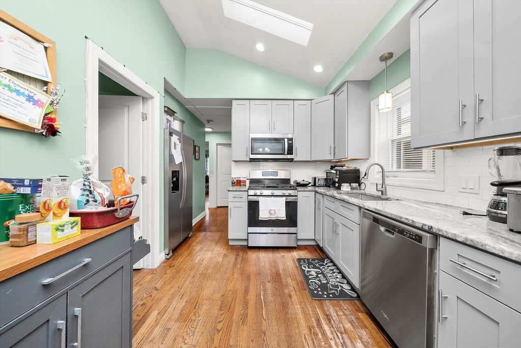 Impeccably recently renovated 5-bedroom, 2-bath brick raised ranch! Experience comfort in this expanded home featuring vaulted ceilings and skylights over the open living room and gourmet eat-in kitchen (grey shaker, granite, SS). Hardwood floors, custom-tiled new bathrooms. The fully finished basement adds massive value with a family room, 5th bedroom, full bath, and laundry. Fenced yard, new shed, and 2-car garage! A true must-see.