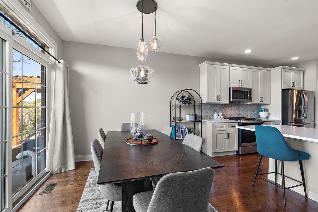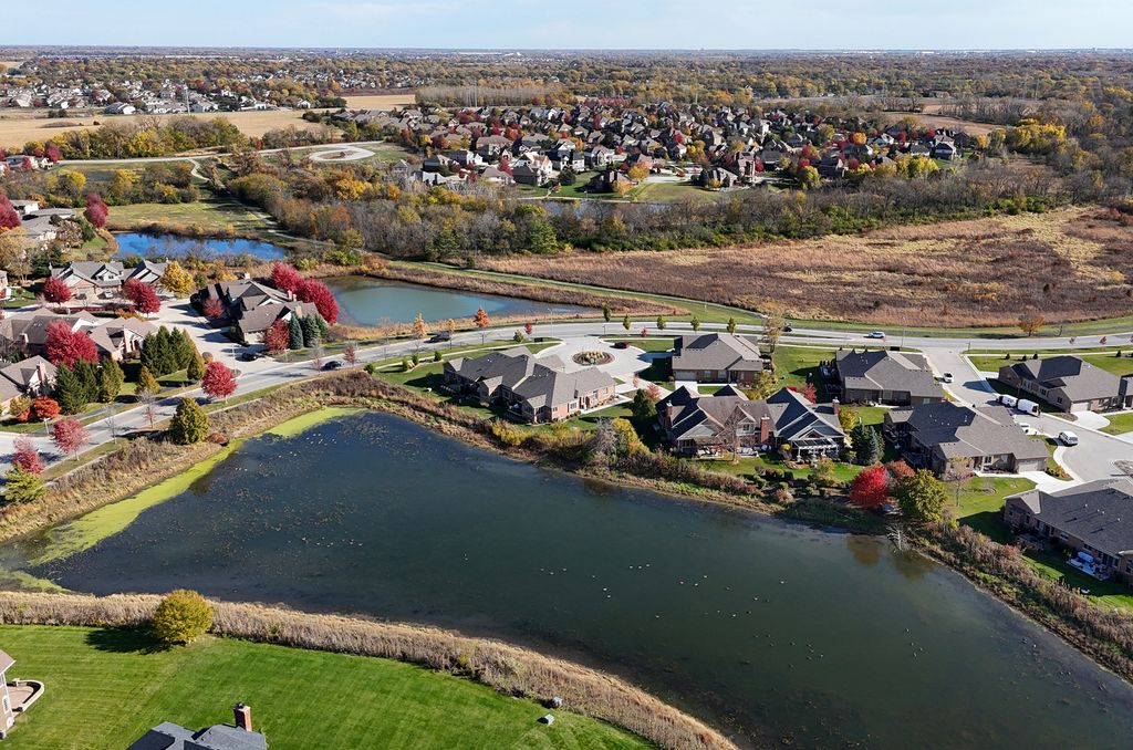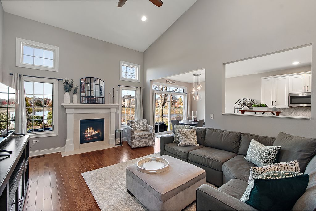 Impeccably maintained and truly turn-key, this beautifully updated 2-bedroom plus loft, 3.5-bath townhome in Lighthouse Pointe offers a like-new living experience on a premium waterfront lot. Thoughtfully improved with high-end finishes throughout, the home combines modern design, functional upgrades, and tranquil water views, allowing you to move in with confidence and ease. The two-story living room is filled with natural light and showcases hardwood floors, a granite-surround fireplace, and expansive windows framing peaceful water views. The custom kitchen rivals new construction, featuring quartz countertops, a striking herringbone stone backsplash, stainless steel appliances, a composite sink, pantry closet, and soft-close cabinetry, designed for both everyday living and entertaining. The adjoining dining area opens to the patio through oversized sliding glass doors with a transom window, creating a seamless indoor-outdoor connection. A formal dining room, currently styled as a sitting area, adds versatility and refinement with hardwood floors and a tray ceiling. A main-level laundry room with sink and cabinetry enhances convenience. Upstairs, the primary suite delivers a private retreat, complete with vaulted ceilings, dual walk-in closets with custom organizers, and a spa-inspired bath featuring a whirlpool tub, separate shower, and granite double vanity. The loft provides flexible space ideal for a home office, reading nook, or lounge, while the second bedroom enjoys morning light and calming water views. The finished basement significantly expands the living space, offering a recreation or fitness area, a full bath with heated floors and a double walk-in shower, plus a utility room and additional unfinished space for future expansion or storage. This home has been meticulously cared for and offers maintenance-free living, with landscaping and snow removal included, ideal for buyers seeking a low-maintenance, high-quality lifestyle. Outdoors, the concrete patio overlooks the water and provides a private setting for morning coffee, entertaining, or relaxing at the end of the day. Ideally located near Starbucks, scenic walking paths, and direct access to the Old Plank Trail, with convenient proximity to major expressways, this residence delivers the condition and ease of new construction paired with the rarity of a premium waterfront setting.