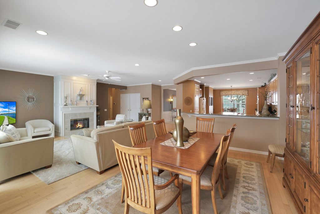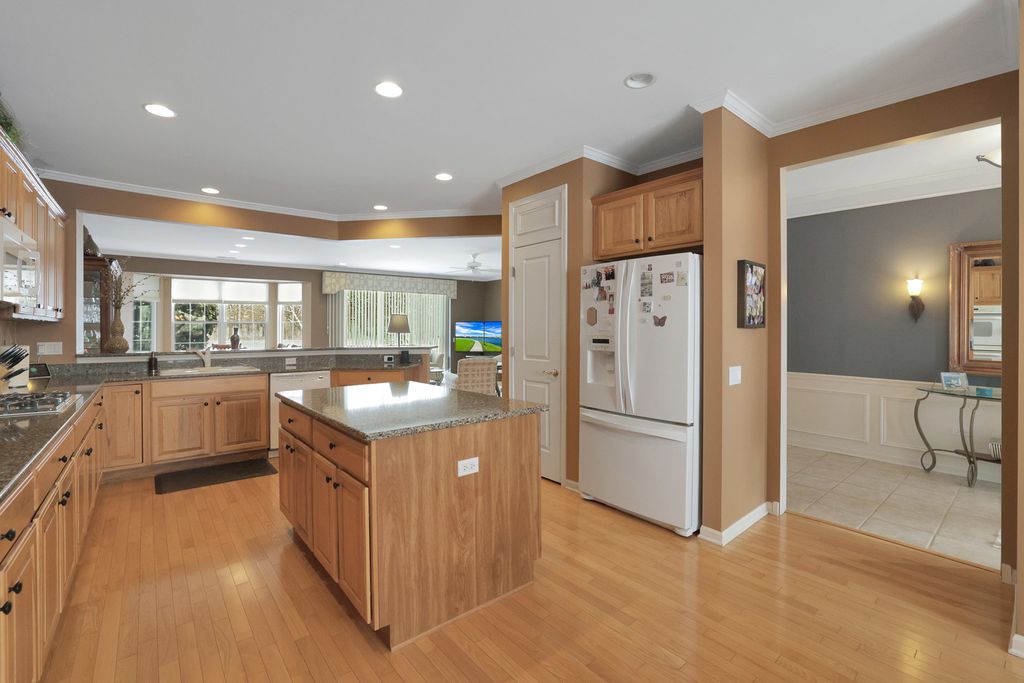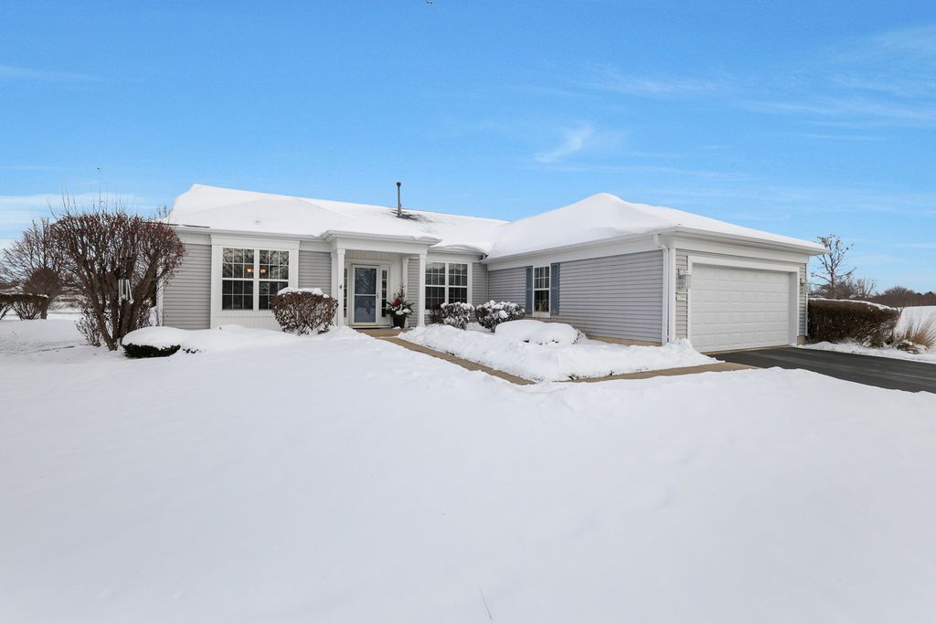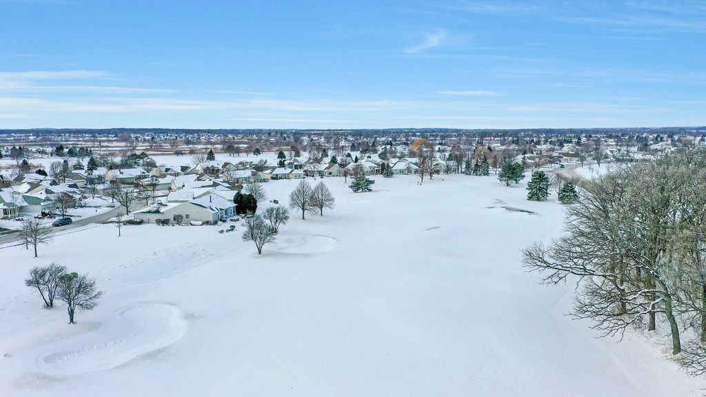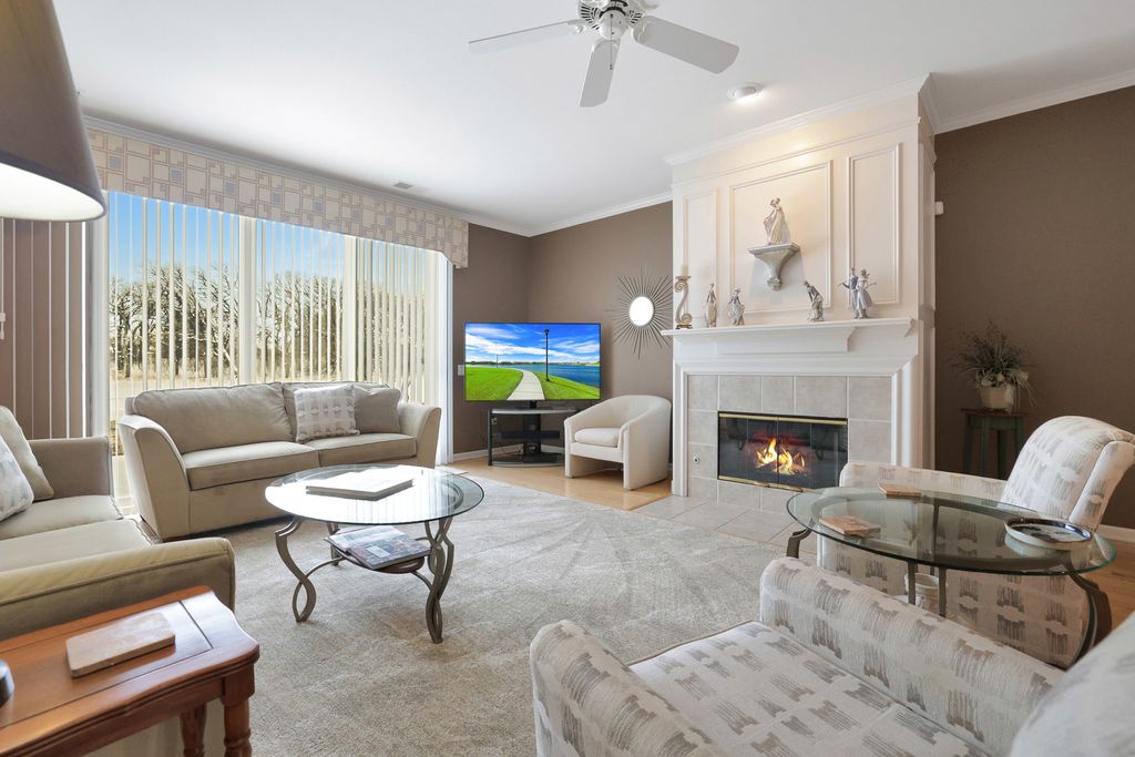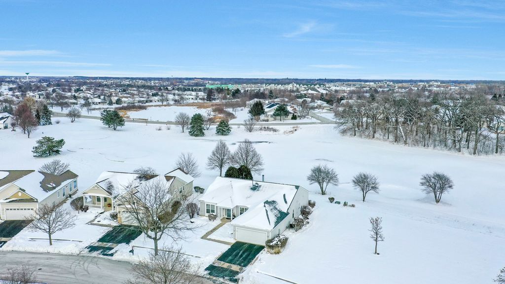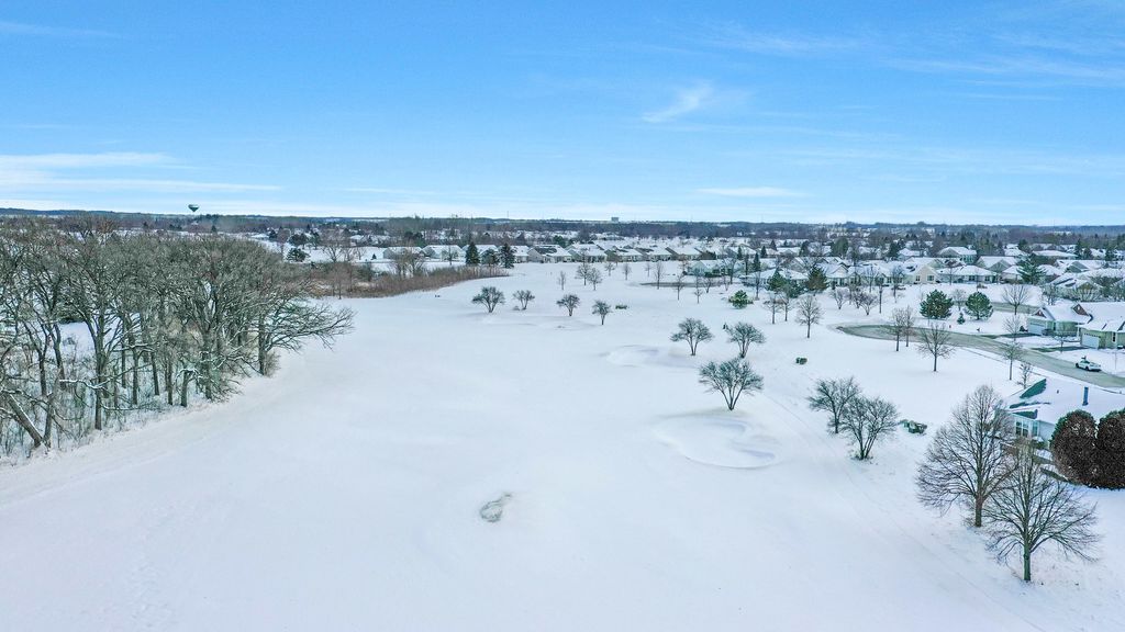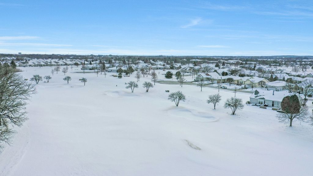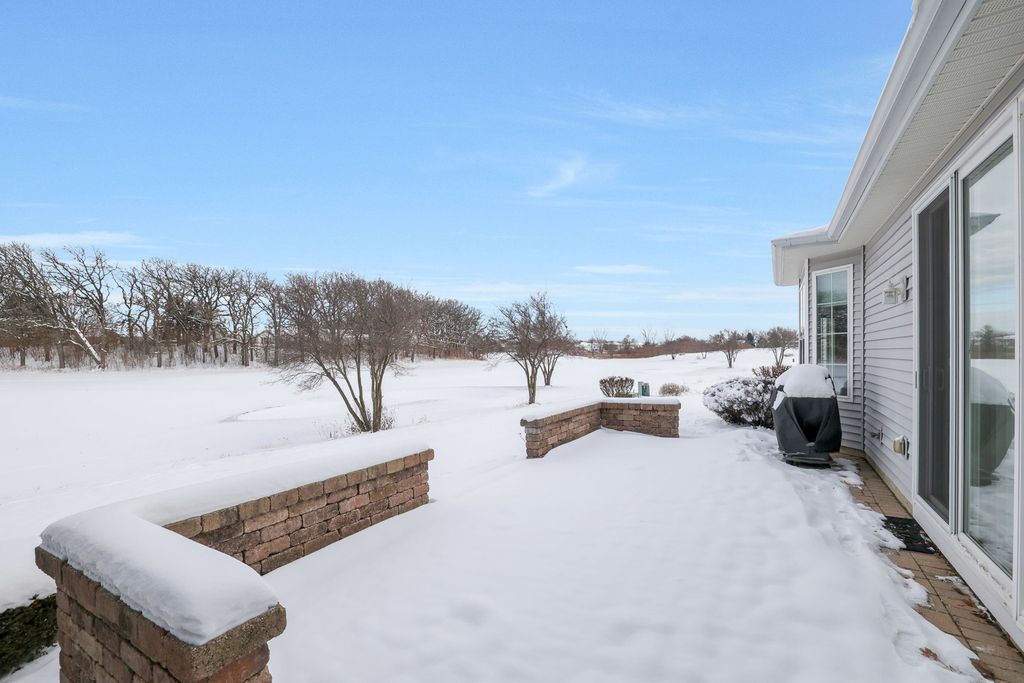 Move-in ready Grant model with an extended garage, ideally situated on a premium golf course lot with sweeping views! Walk into a spacious foyer with sightlines straight through to the open family room. Hardwood floors throughout the kitchen, dining room, family room, and bedrooms. The gourmet kitchen is ideally designed, featuring an eat-in breakfast area with bay window, a large center island, pantry, breakfast bar, quartz countertops, recessed lighting, hickory cabinetry, tile backsplash, and a double oven. The kitchen opens to a dining room with recessed lighting and a bay window, which in turn flows into the family room highlighted by crown molding and a gas fireplace. Step outside the sliding door to the large brick paver patio with knee-high wall, where you can take in the peaceful golf course setting and expansive views. The primary suite offers another bay window, a spacious walk-in closet, and a private bath with ceramic tile flooring, double raised vanity with granite countertops, and a relaxing garden tub. The guest bedroom and den both include ceiling fans, and the guest bath features granite countertops and hickory cabinetry. Neutral paint throughout makes this home truly move-in ready. Additional highlights include paver driveway ribbons, a lawn irrigation system, extensive landscaping and numerous mechanical updates: * New roof (2014) * New furnace (2016) * Refrigerator (2017) * New air conditioner (2020) * Microwave (2024) Located near the Prairie Lodge and an adjacent park at the end of a quiet cul-de-sac, this beautiful home is in Del Webb Sun City, a premier 55+ active adult community offering exceptional amenities and lifestyle.