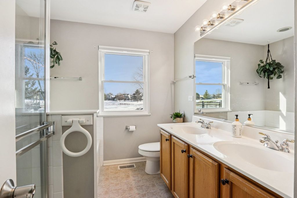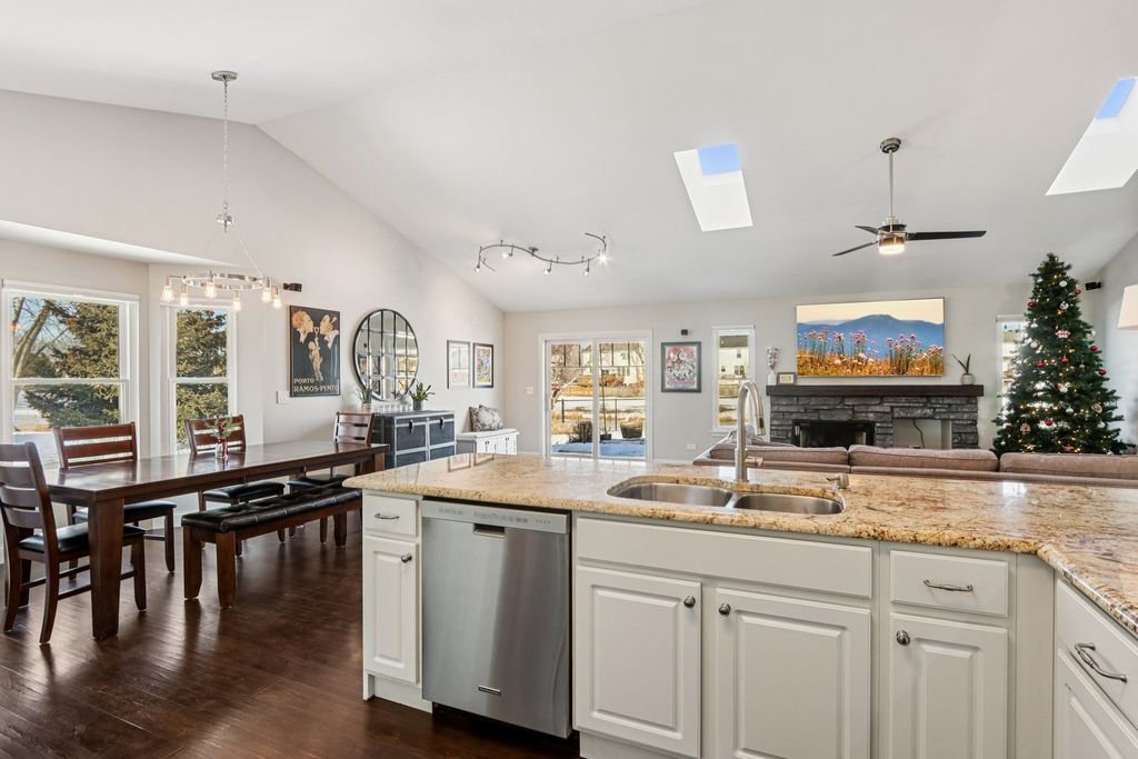 **Multiple offer received. Highest and best due 12/22 at 12noon**Well-maintained ranch home tucked away on a quiet cul-de-sac, featuring a fenced yard backing to a tranquil pond for peaceful views and added privacy. Just a short walk to Sunset Park. The bright main level is filled with natural light and showcases vaulted ceilings, skylights, and solar tubes. Pergo flooring runs throughout the main floor and bedrooms (2018). Recent updates include new windows and blinds (2022), patio door (2020), freshly painted exterior wood trim and shutters (2022), new driveway (2023), new shed doors (2024), and an upgraded primary closet system (2024). The kitchen offers an eating area with breakfast bar, pantry, and updated cabinet hardware. The primary suite features a full bath with whirlpool tub, separate shower, and double vanity. Enjoy the convenience of first-floor laundry, plus a full basement with bathroom rough-in and egress window; ready for your finishing ideas. Additional highlights include a dual gas/wood-burning fireplace, whole-house water filtration system, backup sump pump, UV air cleaner, built-in surround sound, gas line for grill, heated attached garage with WiFi-enabled opener, and storage shed. The waterfront lot backs directly to the pond, creating a serene outdoor retreat. Schedule your private showing today and see why this one stands out.
