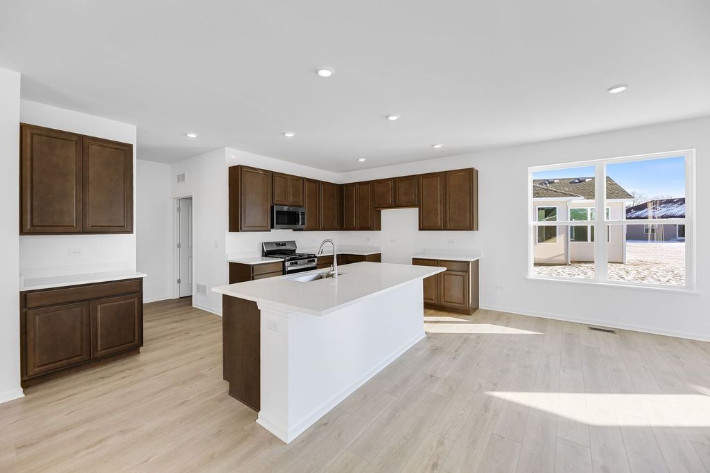 READY FOR JANUARY DELIVERY!!!! Homesite# 0044 Step into the Siena, a thoughtfully designed single-story home that blends comfort, efficiency, and modern style. This well-balanced layout features three bedrooms and two bathrooms within an open-concept design that creates a seamless flow between the family room, dining area, and kitchen-perfect for both everyday living and casual entertaining. At the heart of the home, the kitchen shines with a spacious island, Quartz countertops, stainless steel appliances, and generous cabinetry, offering both function and elegance. The private owner's suite is a peaceful retreat, complete with an expansive walk-in closet and a spa-like en-suite bathroom designed for relaxation. Two additional bedrooms are positioned near a shared hallway bath, offering flexibility for guests, family members, or a home office. The Siena also includes 9-foot ceilings, luxury vinyl plank flooring, plush carpeting, Deluxe shower upgrades, smart-height water-saving commodes, and many other premium features tailored to enrich your lifestyle. Delivering modern living in a streamlined, practical layout, the Siena is a versatile and stylish choice for a wide range of homeowners. Exterior will be Espresso color sidings with Shadow Gray Brick (pic for reference ONLY) *Photos are not this actual home* Experience the perfect blend of comfort, convenience, and outdoor living at Prairie Meadows, a charming new community offering low-maintenance ranch-style homes in the vibrant suburbs of Aurora, Illinois. Thoughtfully designed for effortless living and a love of nature, Prairie Meadows delivers a lifestyle centered on relaxation, recreation, and meaningful community connection. This thoughtfully planned neighborhood will feature a scenic park and playground, modern pickleball courts, a welcoming picnic shelter, fire pit, and comfortable seating areas, along with approximately 15 acres of open space to enjoy fresh air and the natural surroundings. Living at Prairie Meadows means you're just minutes from some of Aurora's most popular attractions. Downtown's RiverEdge Park offers outdoor festivals, an amphitheater, and scenic trails along the Fox River, making it a go-to destination for entertainment and relaxation. For shopping enthusiasts, the Chicago Premium Outlets is a premier open-air retail center featuring more than 170 designer brands, seasonal events, and unbeatable deals. Golfers will love the nearby Orchard Valley Golf Course, a beautifully maintained 18-hole championship course perfect for both casual and competitive play, complete with a welcoming clubhouse for dining and socializing.
