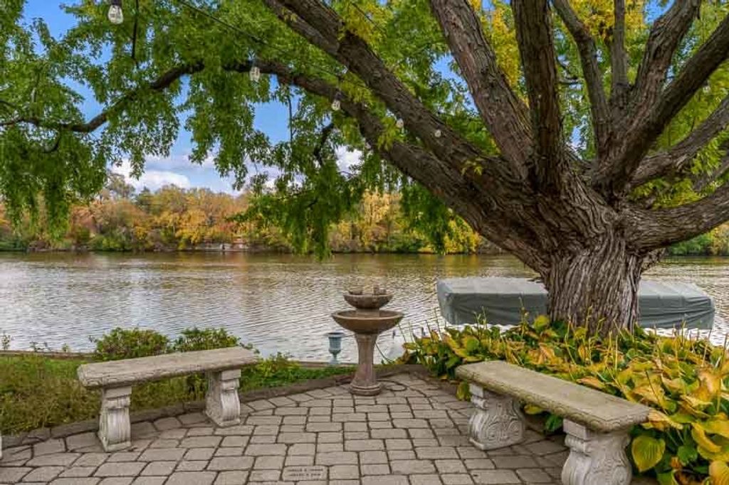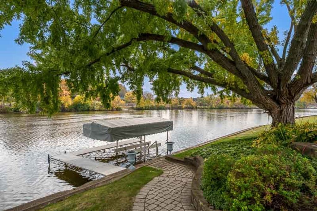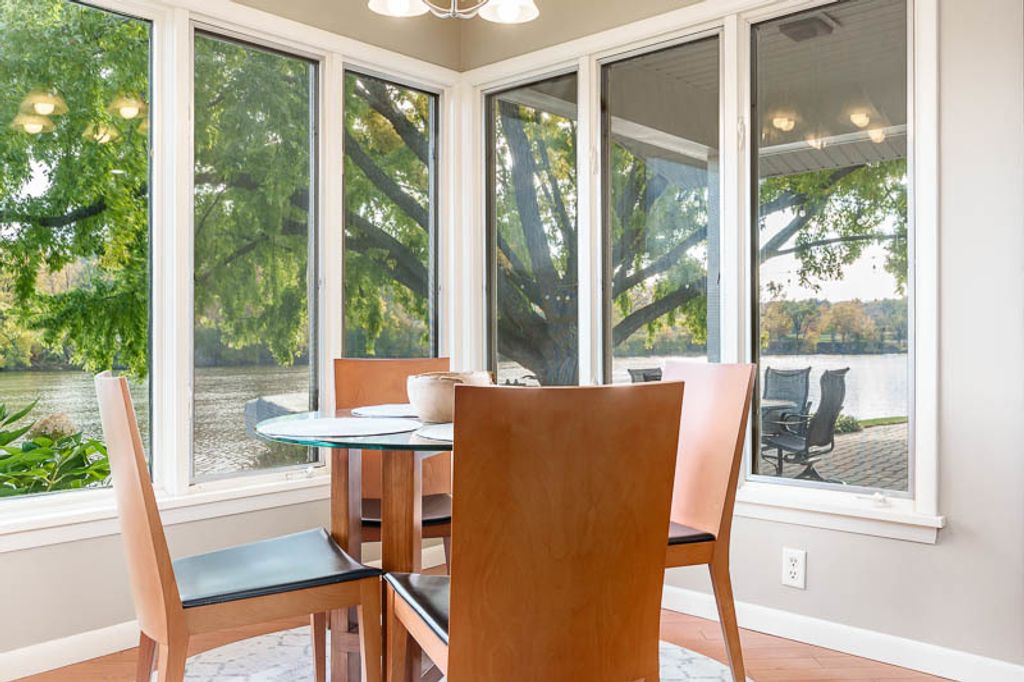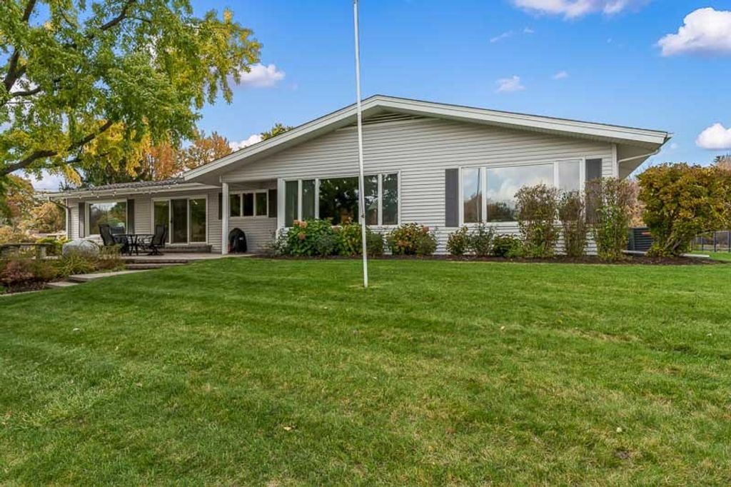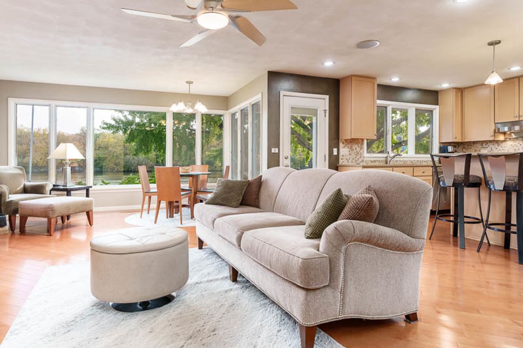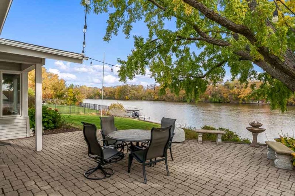Beautiful ranch home with stunning river views and access, set on a nicely landscaped lot with a circular driveway. The light and airy interior features oversized windows and sliding glass doors that open to a brick patio, offering river views from nearly every angle. Updated lighting enhances the open, inviting feel throughout the home. The kitchen showcases light cabinetry, an L-shaped island, hardwood floors opening to the family room with a wood-burning fireplace-ideal for everyday living and entertaining. An open-concept formal living and dining room combination adds additional space for gatherings while maintaining a seamless flow. The home offers three bedrooms and three bathrooms, including a primary suite with a wall of closets and a private bathroom with shower. The partially finished lower level provides additional living space with a family room featuring a brick wood-burning fireplace, a full bathroom, and an office. Additional highlights include an AprilAire system, two sump pumps, a fenced yard, and a home warranty for added peace of mind.