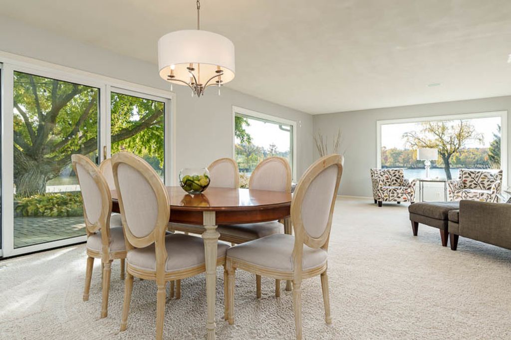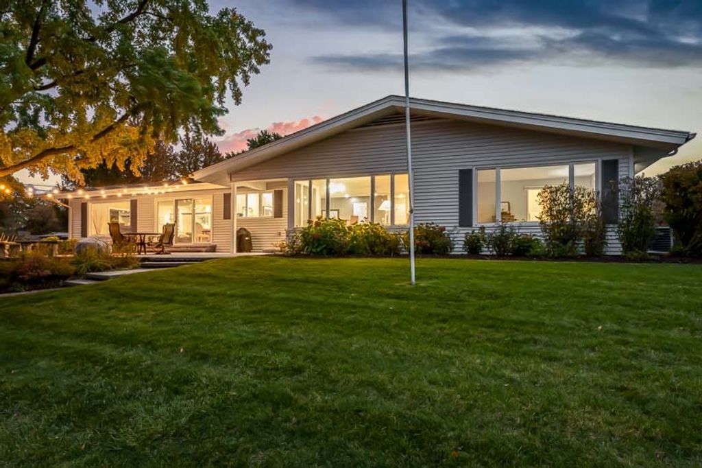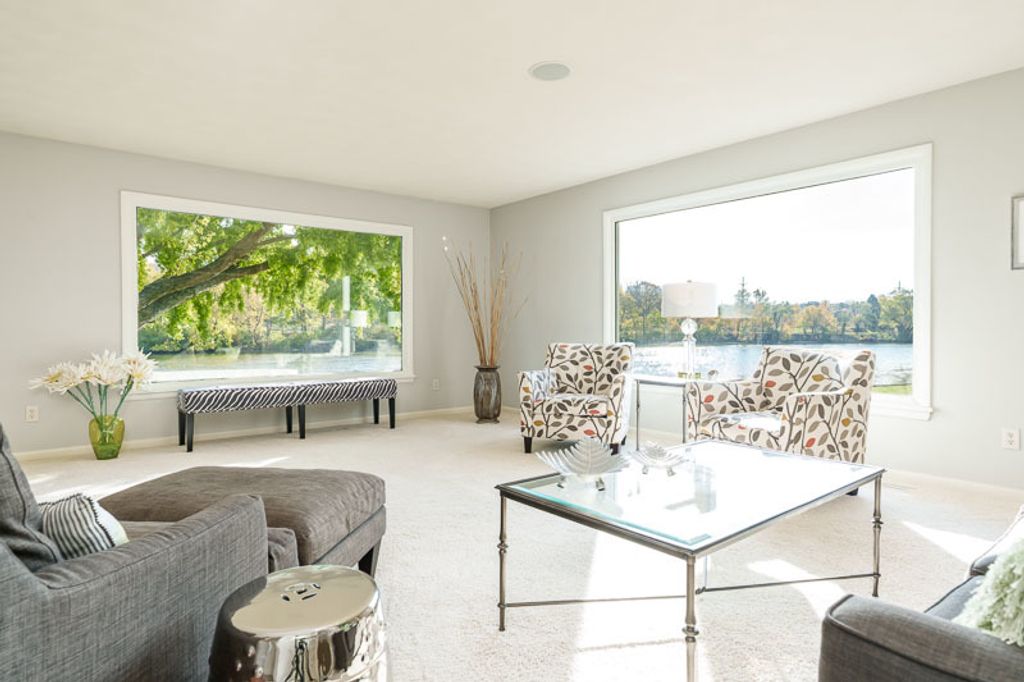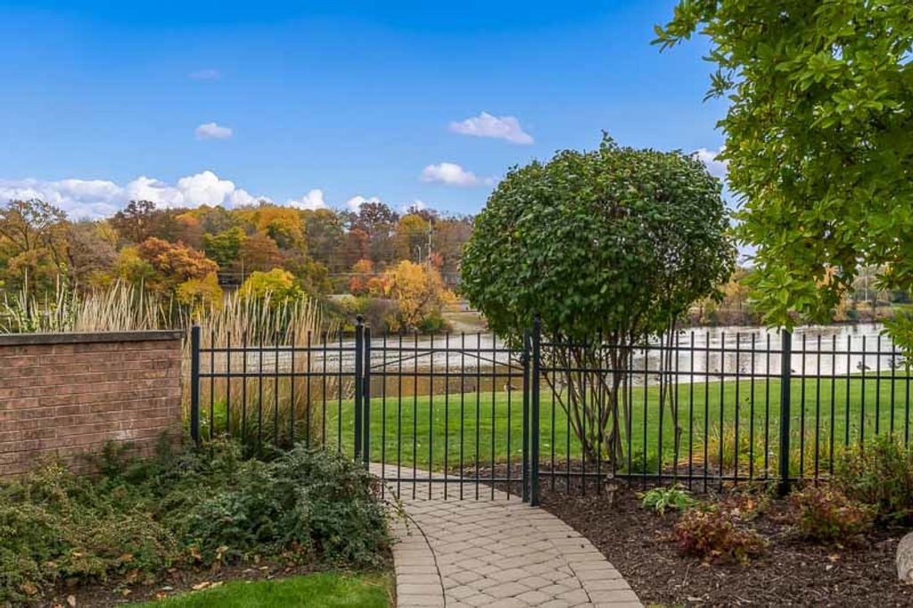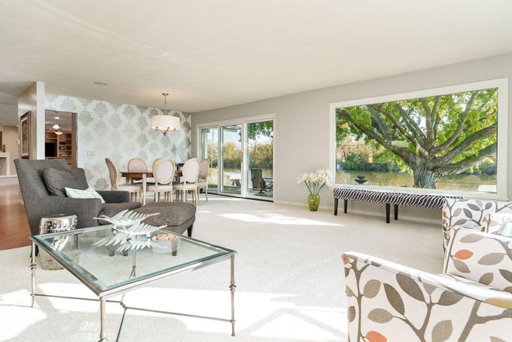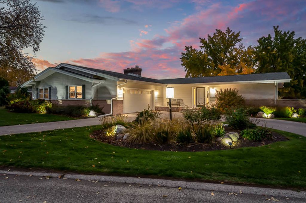 Beautiful ranch home with stunning river views and access, set on a nicely landscaped lot with a circular driveway. The light and airy interior features oversized windows and sliding glass doors that open to a brick patio, offering river views from nearly every angle. Updated lighting enhances the open, inviting feel throughout the home. The kitchen showcases light cabinetry, an L-shaped island, hardwood floors opening to the family room with a wood-burning fireplace-ideal for everyday living and entertaining. An open-concept formal living and dining room combination adds additional space for gatherings while maintaining a seamless flow. The home offers three bedrooms and three bathrooms, including a primary suite with a wall of closets and a private bathroom with shower. The partially finished lower level provides additional living space with a family room featuring a brick wood-burning fireplace, a full bathroom, and an office. Additional highlights include an AprilAire system, two sump pumps, a fenced yard, and a home warranty for added peace of mind.