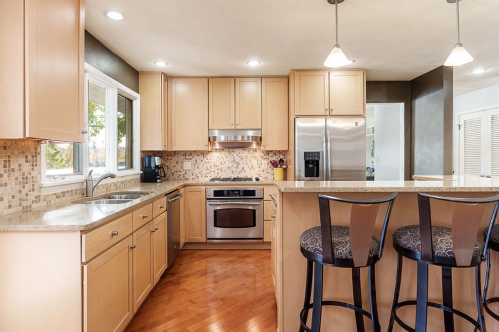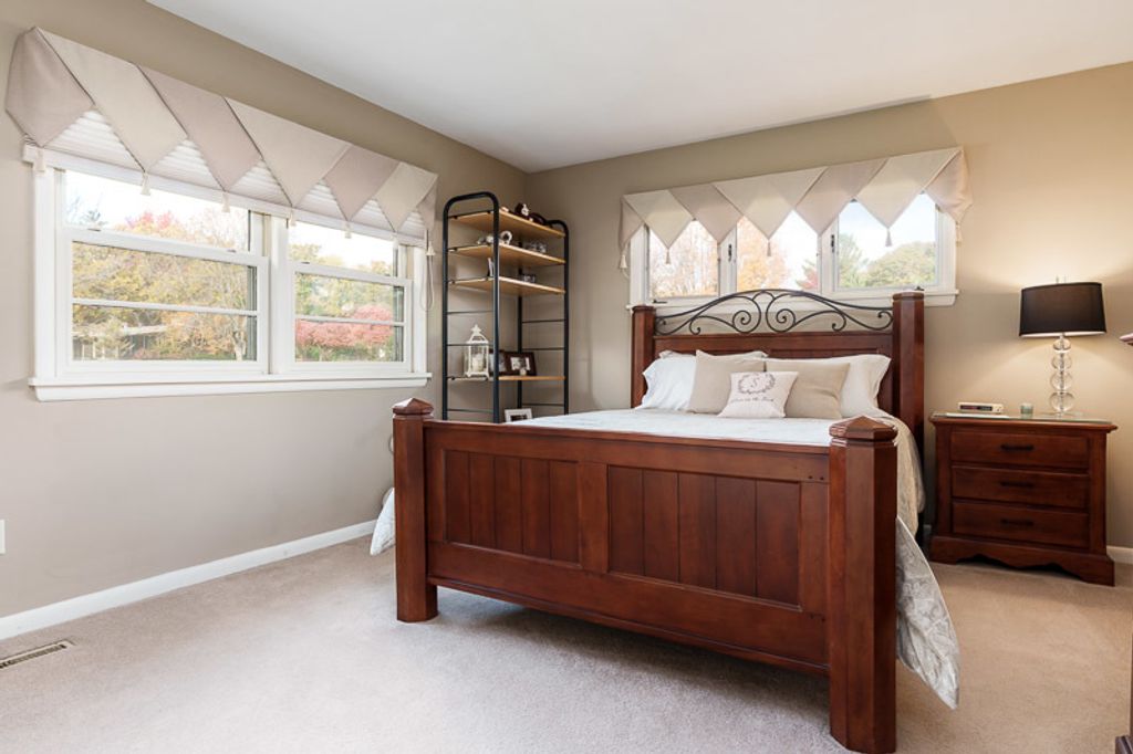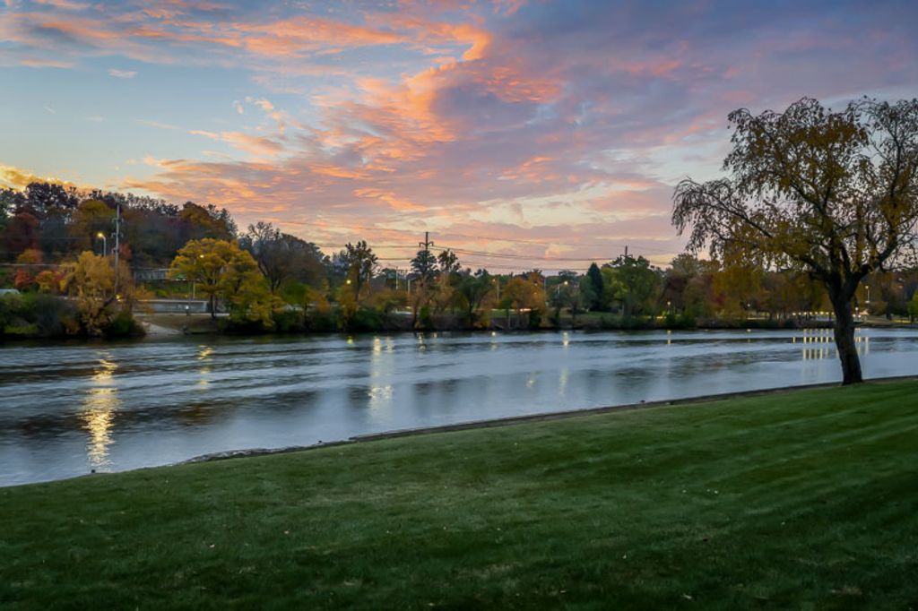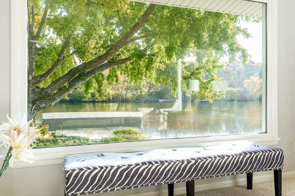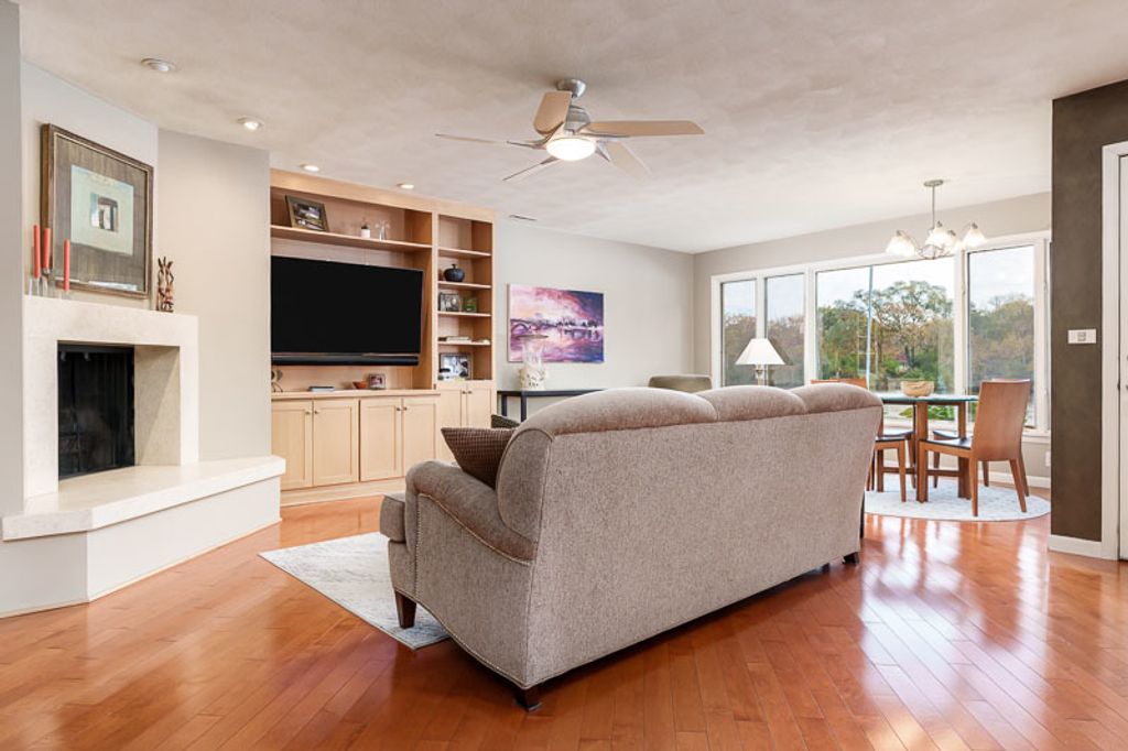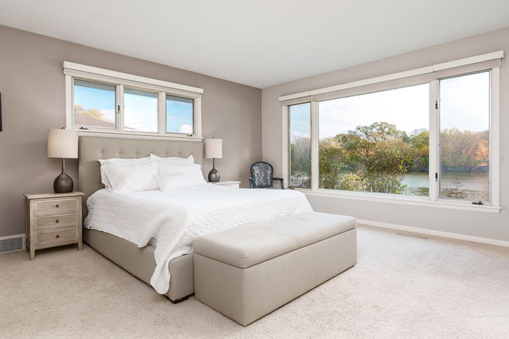 Beautiful ranch home with stunning river views and access, set on a nicely landscaped lot with a circular driveway. The light and airy interior features oversized windows and sliding glass doors that open to a brick patio, offering river views from nearly every angle. Updated lighting enhances the open, inviting feel throughout the home. The kitchen showcases light cabinetry, an L-shaped island, hardwood floors opening to the family room with a wood-burning fireplace-ideal for everyday living and entertaining. An open-concept formal living and dining room combination adds additional space for gatherings while maintaining a seamless flow. The home offers three bedrooms and three bathrooms, including a primary suite with a wall of closets and a private bathroom with shower. The partially finished lower level provides additional living space with a family room featuring a brick wood-burning fireplace, a full bathroom, and an office. Additional highlights include an AprilAire system, two sump pumps, a fenced yard, and a home warranty for added peace of mind.