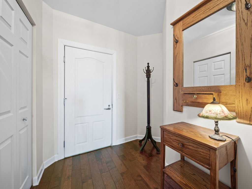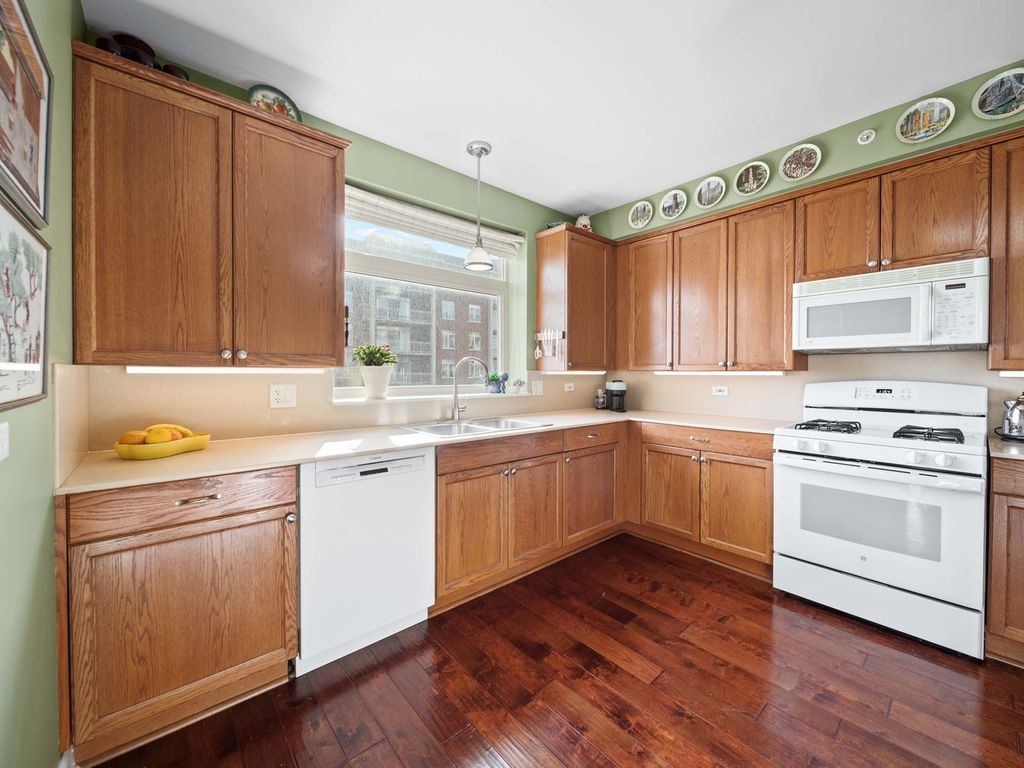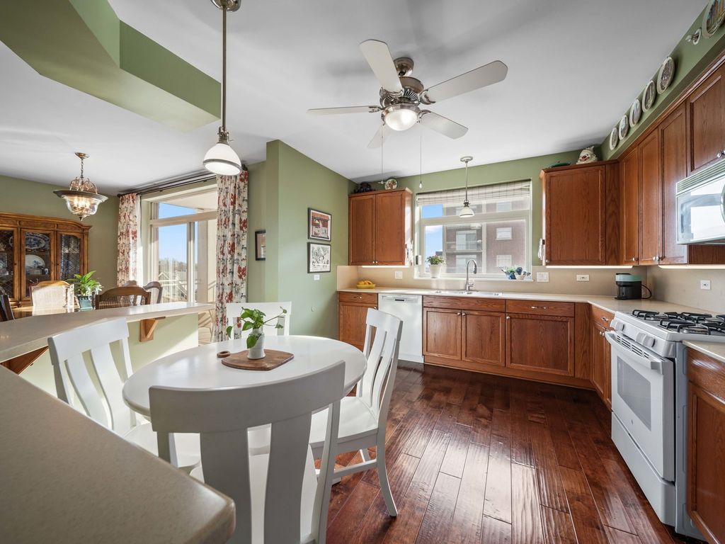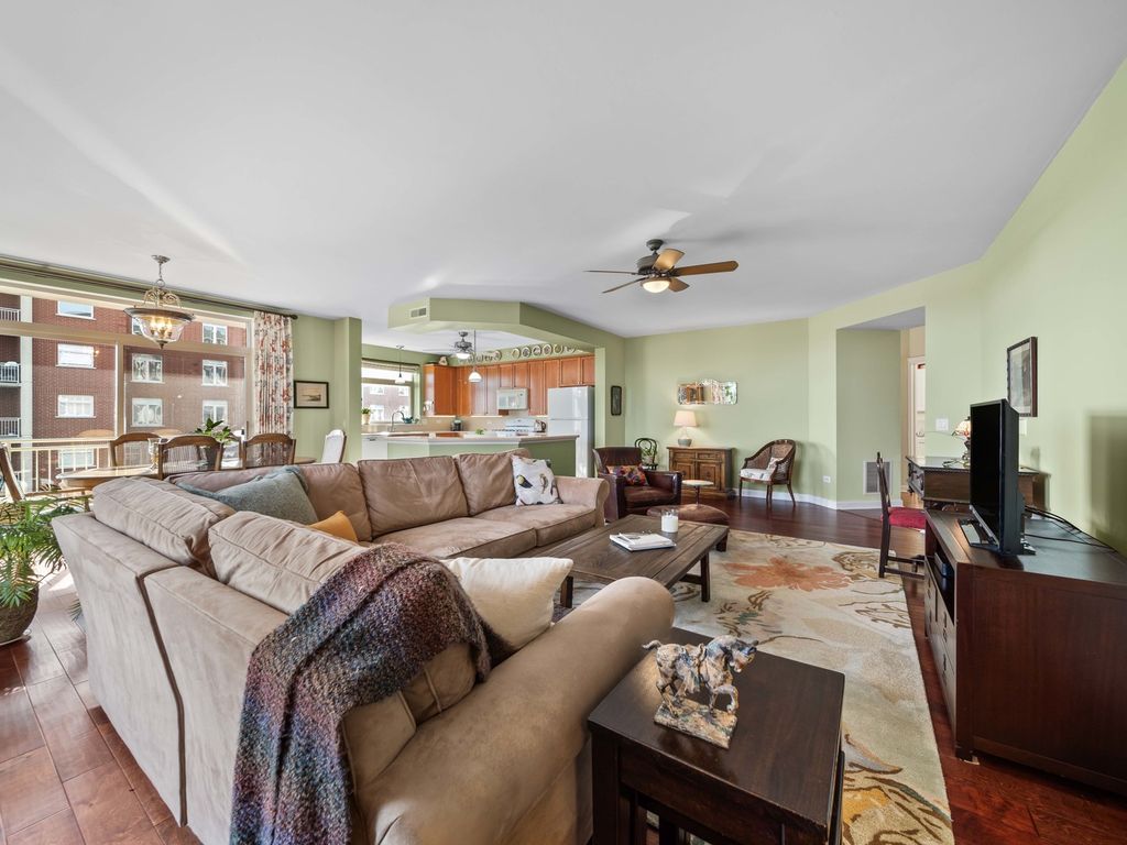 Bathed in natural southern light and ideally positioned as a corner residence within the sought-after Woodlands of Morton Grove, this open-concept condominium offers an inviting blend of comfort and functionality across a thoughtfully designed main level. A welcoming foyer with hardwood flooring and a guest coat closet opens to expansive living and dining spaces, where hardwood floors continue seamlessly and sliding glass doors extend the living experience to a private balcony. The kitchen is well appointed with spacious countertops, under-cabinet lighting, an LG refrigerator, GE microwave and oven/range, Bosch dishwasher, and a double stainless steel sink with disposal, complemented by a dedicated eating area. The primary suite features two generous walk-in closets, along with a neutrally decorated bath with chrome plumbing fixtures, a separate shower, soaking tub, and Kohler commode. A well-proportioned second bedroom with double-door closet sits adjacent to a hall bath. The in-unit laundry room features a GE washer and dryer, utility sink, and upper cabinetry for additional storage. Additional highlights include central air (2017), oven and washer/dryer replaced within the past five years, newer shades and drapes in the living room and kitchen, two storage closets and indoor parking. Residents enjoy access to community amenities including an exercise room and party room, all within a well-maintained, elevator-served building. This sun-filled corner unit delivers practical design, generous storage, and effortless living in a desirable Morton Grove location.