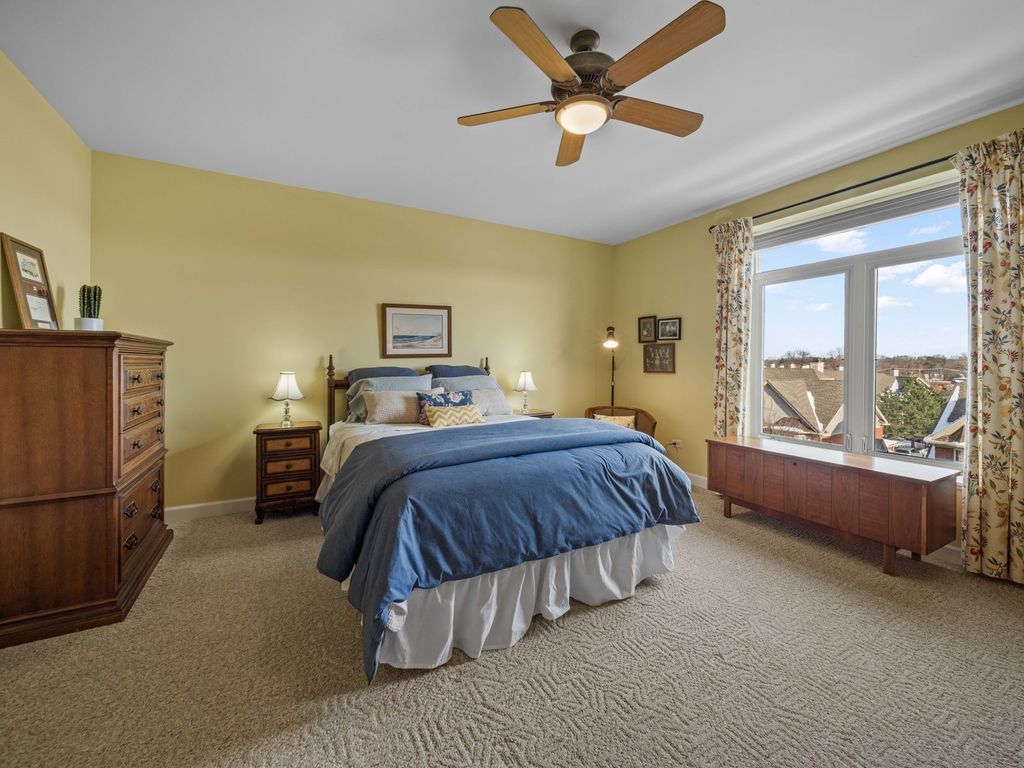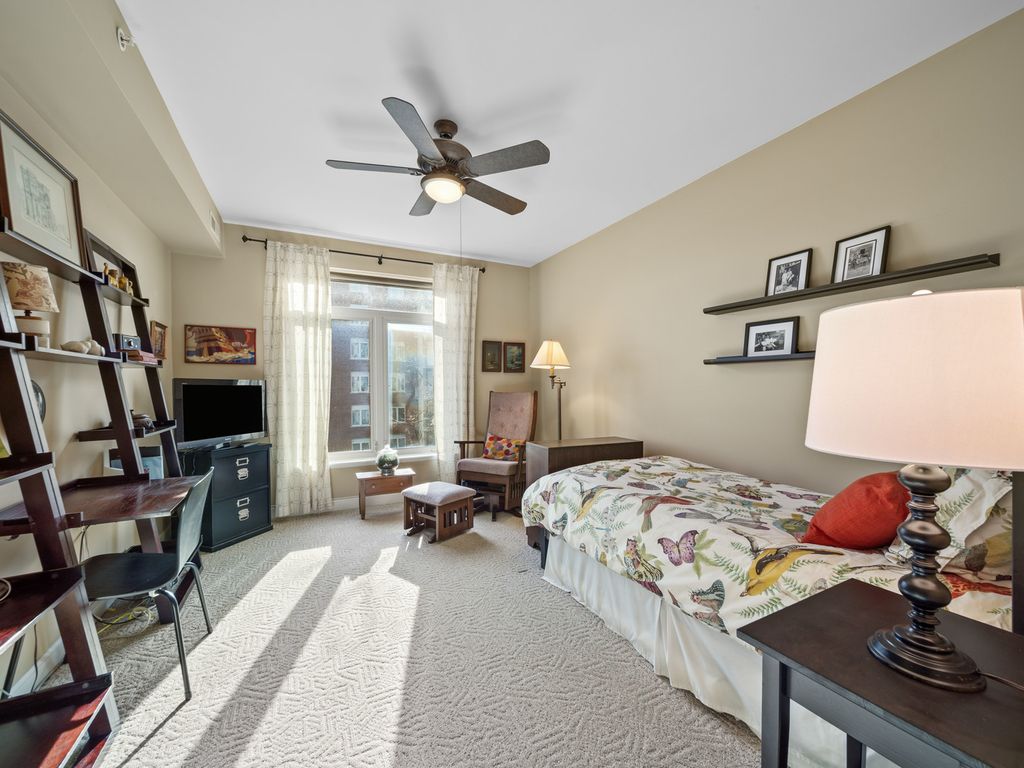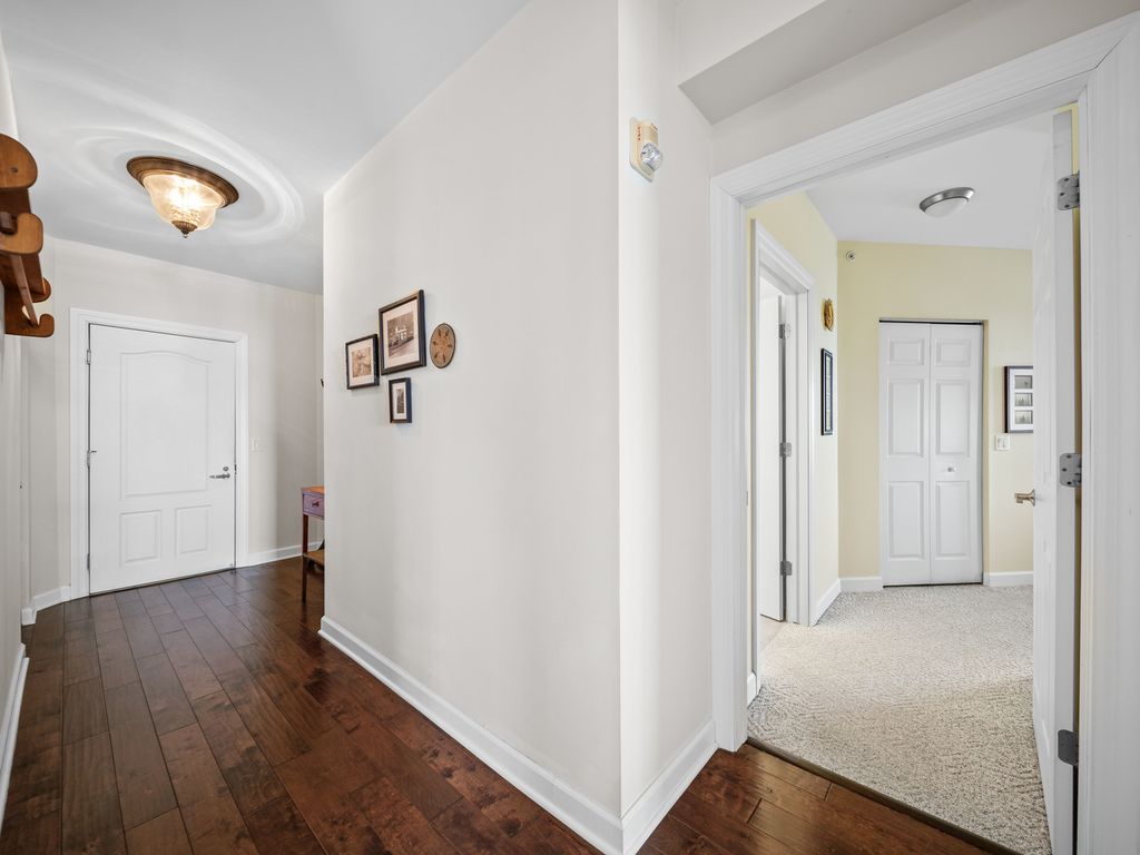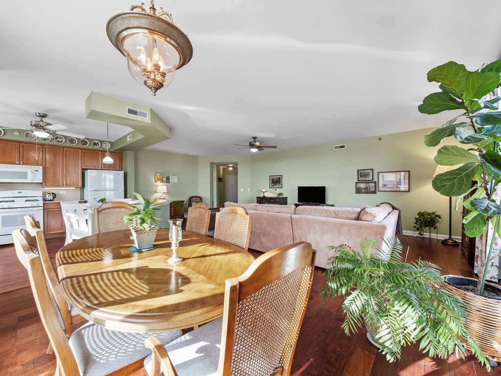 Bathed in natural southern light and ideally positioned as a corner residence within the sought-after Woodlands of Morton Grove, this open-concept condominium offers an inviting blend of comfort and functionality across a thoughtfully designed main level. A welcoming foyer with hardwood flooring and a guest coat closet opens to expansive living and dining spaces, where hardwood floors continue seamlessly and sliding glass doors extend the living experience to a private balcony. The kitchen is well appointed with spacious countertops, under-cabinet lighting, an LG refrigerator, GE microwave and oven/range, Bosch dishwasher, and a double stainless steel sink with disposal, complemented by a dedicated eating area. The primary suite features two generous walk-in closets, along with a neutrally decorated bath with chrome plumbing fixtures, a separate shower, soaking tub, and Kohler commode. A well-proportioned second bedroom with double-door closet sits adjacent to a hall bath. The in-unit laundry room features a GE washer and dryer, utility sink, and upper cabinetry for additional storage. Additional highlights include central air (2017), oven and washer/dryer replaced within the past five years, newer shades and drapes in the living room and kitchen, two storage closets and indoor parking. Residents enjoy access to community amenities including an exercise room and party room, all within a well-maintained, elevator-served building. This sun-filled corner unit delivers practical design, generous storage, and effortless living in a desirable Morton Grove location.
