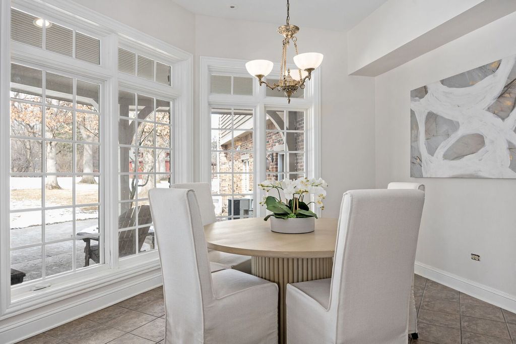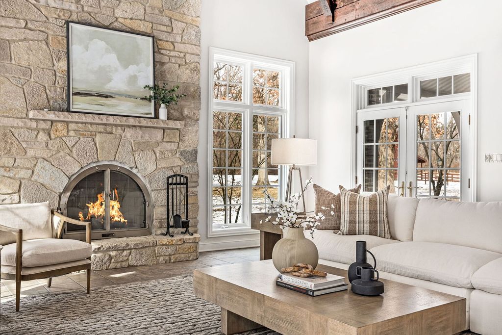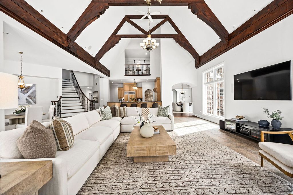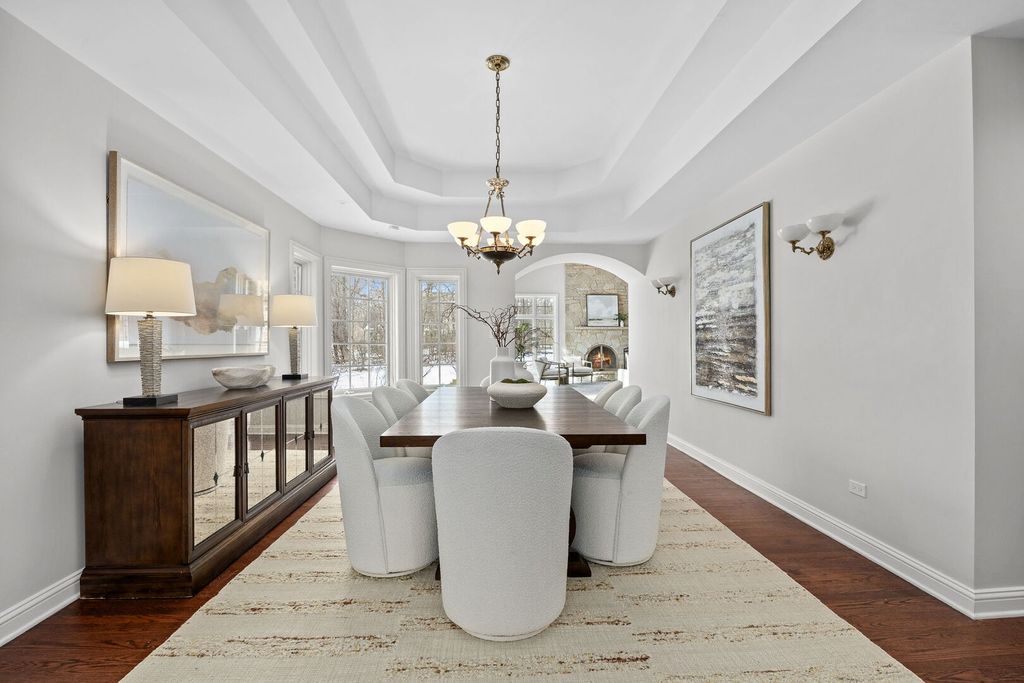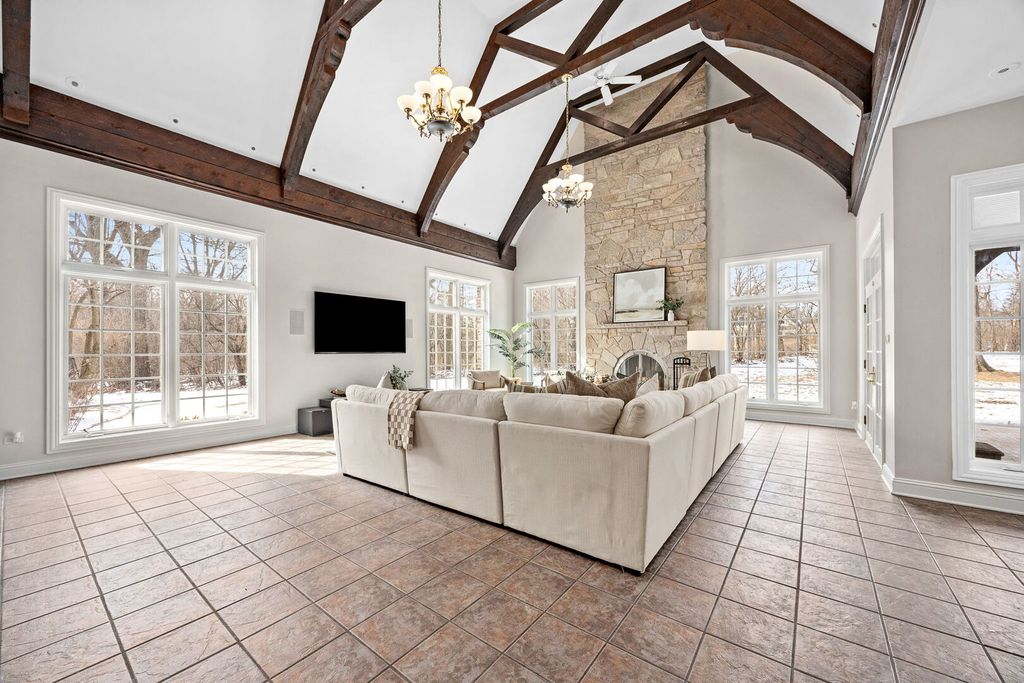 This magnificent 5-bedroom, 4 full and 2 half bath estate offers 6,294 square feet of refined living space set on 5 pristine acres. A grand arched double-door entrance with patterned glass welcomes you into a dramatic foyer with arched ceilings, setting the tone for this exceptional property. Heated tile flooring flows throughout the foyer, gourmet kitchen, and family room, providing comfort and continuity across the main living spaces. The kitchen is thoughtfully designed with custom natural wood cabinetry, granite countertops, a peninsula and center island, both with seating, and premium appliances including an AGA cast iron range that also provides home heating, plus a Sub-Zero refrigerator. A sunlit breakfast nook with expansive windows offers tranquil views of the property, and the kitchen opens directly to the spectacular two-story family room, the true centerpiece of the home, featuring vaulted ceilings with exposed wood beams, a floor-to-ceiling stone fireplace framed by two large windows, surround sound, and dual chandeliers. New hardwood flooring enhances the formal dining room, living room, private office, and primary suite. The dining room showcases a multi-tier tray ceiling, elegant wall sconces, chandelier, and a unique two-sided see-through stone fireplace shared with the living room. The living room highlights cathedral ceilings, abundant natural light, and custom inlay detailing in the hardwood floors. A private office offers serene views along with built-in custom cabinetry including desk, shelving, and storage. The primary suite serves as a peaceful retreat with vaulted ceilings, oversized windows, a walk-in closet with custom built-ins, and a full en-suite bath featuring a walk-in shower and double vanity with granite countertops. Two updated half bathrooms complete the main level. The upper level features new hardwood flooring throughout and is anchored by a dramatic open sitting area overlooking the family room through wrought iron railings with custom woodwork. Barn-door access leads to a convenient storage room and an expansive unfinished space presenting a rare opportunity to add a second primary suite; with room for a large bedroom, walk-in closet, and full bath, making this an ideal setup for multi-generational living or extended guest accommodations. Three generously sized bedrooms offer ample closet space, including two with en-suite bathrooms, one of which is also accessible from the hallway to serve the third bedroom, providing flexible living arrangements. The finished lower level is designed for entertaining, offering custom wood built-ins, rich wood paneling, a wet bar with sink and cabinetry, a fifth bedroom, full bathroom, and laundry room. Exterior highlights include classic brick and stone architecture, a concrete and brick paver driveway, a charming red barn with paddock, a three-car garage with heated floors, an irrigation system, and electric fencing. The expansive lot offers exceptional privacy, surrounded by mature trees that create a peaceful, secluded setting rarely found so close to town. Ideally located just minutes from downtown Naperville's premier dining and shopping, near Egermann Woods, Green Valley Forest Preserve, and Seven Bridges Golf Club, with convenient access to Routes I-88, I-355, and I-55. Schedule your private showing today and experience this exceptional estate firsthand.