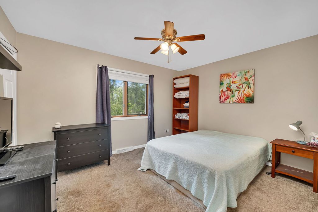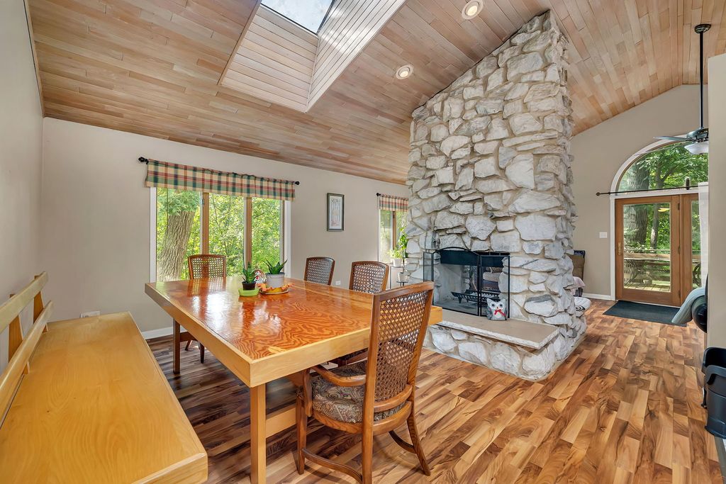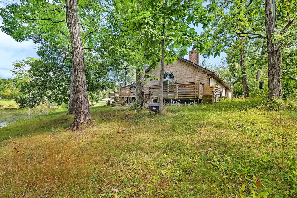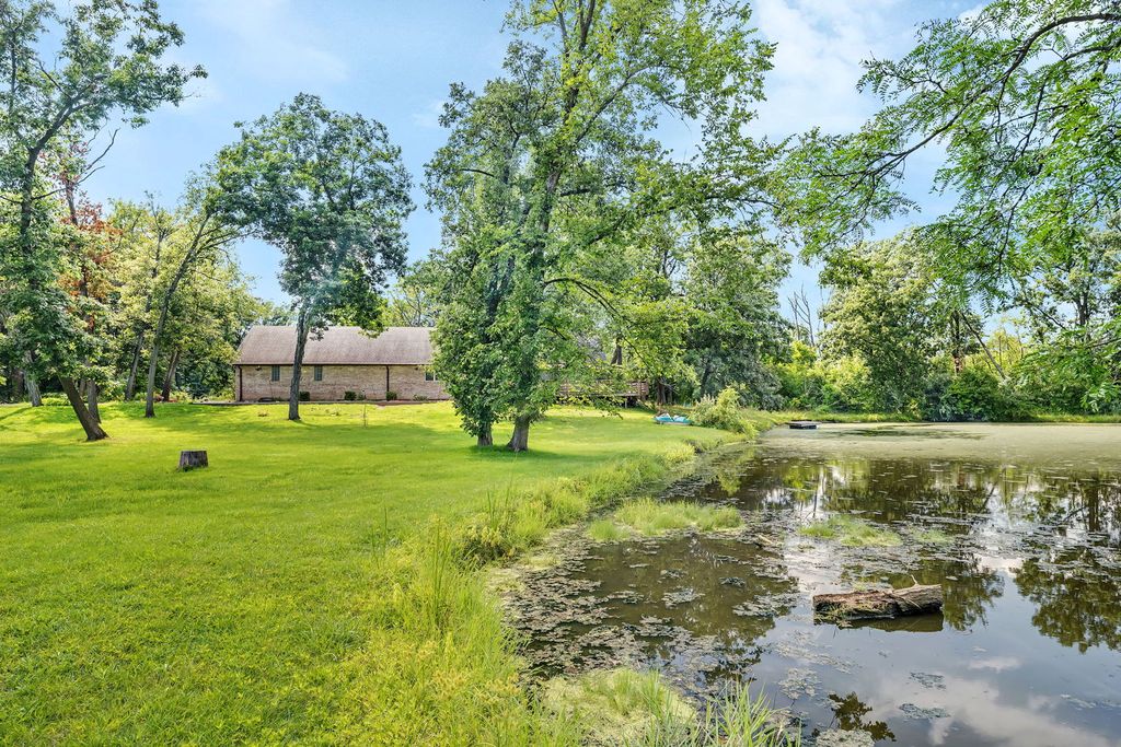 Discover this charming brick ranch set on a quiet street surrounded by mature trees, offering peace and privacy with beautiful pond views. Updates include furnace (2024), A/C (2018), washer/dryer (2024) and roof (around 10 years). This home features 3 bedrooms and 2 full bathrooms on the main level, including a primary suite with a walk-in closet and private bath. The open-concept kitchen, dining, and living areas showcase vaulted wood ceilings with oversized skylights, filling the space with natural light. A stunning stone, see-through fireplace serves as the centerpiece of the main level. Enjoy the outdoors from the wraparound deck overlooking the pond or the enclosed porch just off the kitchen-perfect for morning coffee or evening relaxation. The basement provides even more living space with a large family room, additional bedroom, full bathroom and a spacious crawl area for storage. Property includes a private well and septic system. This home provides a truly serene setting with modern comforts and is ideal for those seeking privacy, space and natural beauty. Ideal location just minutes from interstate access, schools, restaurants, bars, golf courses and so much more. Schedule your showing today!