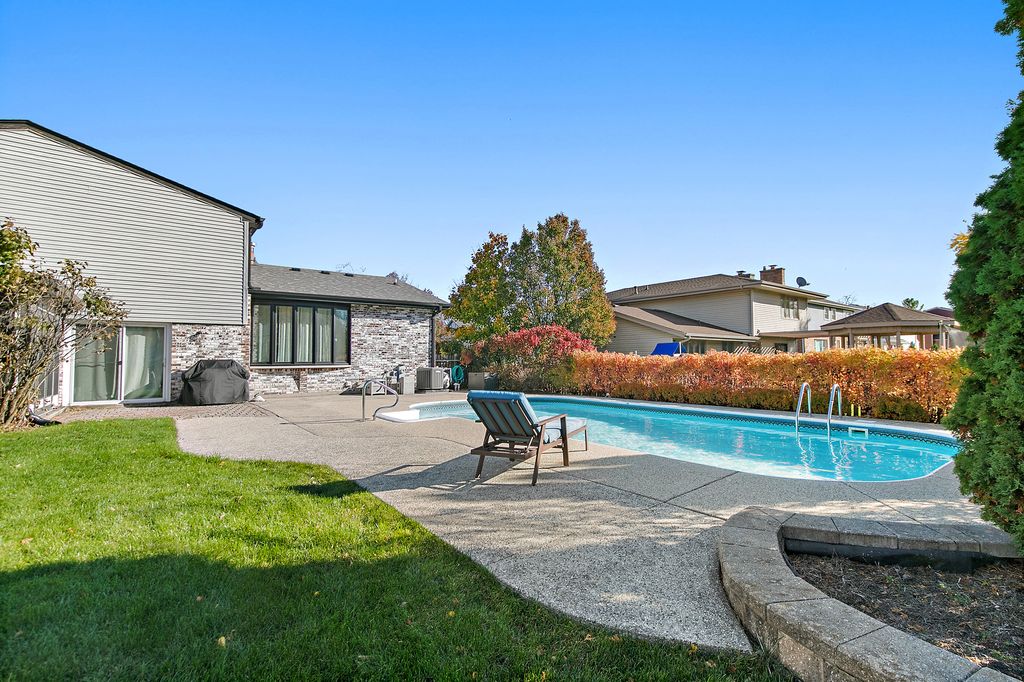 Beautifully updated and meticulously maintained 4 bedroom tri-level home offering large living spaces, hardwood floors, and an amazing backyard in highly desired Weathersfield West! Step into the welcoming foyer and immediately take in the expansive vaulted living and dining rooms, creating an open and airy feel ideal for everyday living and entertaining alike. The kitchen is both stylish and functional, featuring granite countertops, stainless steel appliances, ample cabinetry, and a sunny eat-in area framed by a large bay window overlooking the backyard and pool. The kitchen opens seamlessly to the oversized family room complete with recessed lighting, and a wet bar. Upstairs you'll find four well-sized bedrooms and a recently remodeled full bath in the hallway. The primary suite includes its own private full bath with a double vanity and whirlpool tub. Even more living space awaits in the finished sub-basement. Outdoor living truly shines here! Enjoy the covered front porch, then head out back to a private retreat featuring a 3-season room with cathedral ceiling and glass windows, a large brick paver/concrete patio (38x14), grassy yard space, and a heated in-ground pool, fully fenced and perfect for entertaining, relaxing, and making memories. The entire home has just been freshly painted and is move-in ready for its new owners. Other updates include two sump pumps (2020), roof (2020), pool heater (2021), water heater (2023), dryer (2025), and AC/furnace (2015). Ideally located near parks, shopping, and expressway access, this home truly checks all the boxes. Come see it before it's gone!
