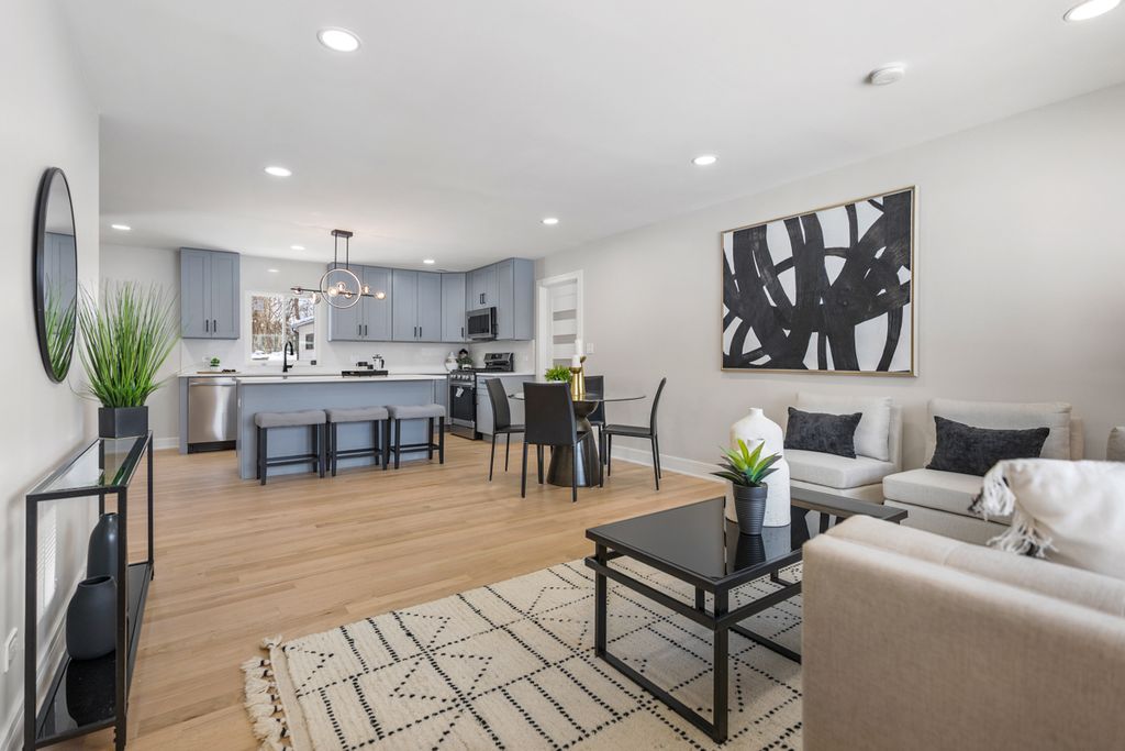 CATALOGUE QUALITY - NEW CONSTRUCTION - SINGLE LEVEL RANCH LIVING - 4 Bedrooms, 2 FULL bathrooms - Luxury on every inch and corner! Stunning, top-to-bottom, FULLY PERMITTED with the village of Hoffman Estates! Everything is up to code and brand new! This meticulously redesigned 4-bedroom, 2-bathroom residence offers a seamless layout featuring solid real hardwood oak floors, elegant glass panel doors, and a designer kitchen equipped with quartz countertops, custom backsplash, and premium stainless steel appliances. Upgraded baseboards and trims throughout the house. This is NOT a typical renovation. Home was stripped to the bones to include all-new copper piping, a new electrical service and panel, new Furnace + AC + boiler, new insulation, brand new windows, brand new duct work and so much more. 2023 roof with newer siding and gutters for absolute peace of mind. The exterior is equally impressive, boasting a long, extended BRAND NEW concrete driveway leading to a two-car garage and a private yard with a newly laid patio. NO HOA fees. Perfectly situated in the prime Schaumburg corridor with immediate access to I-90, IL-53, and the South Barrington/Route 59 commercial hub, this home offers an unbeatable combination of sophisticated modern finishes and a central, high-demand location.