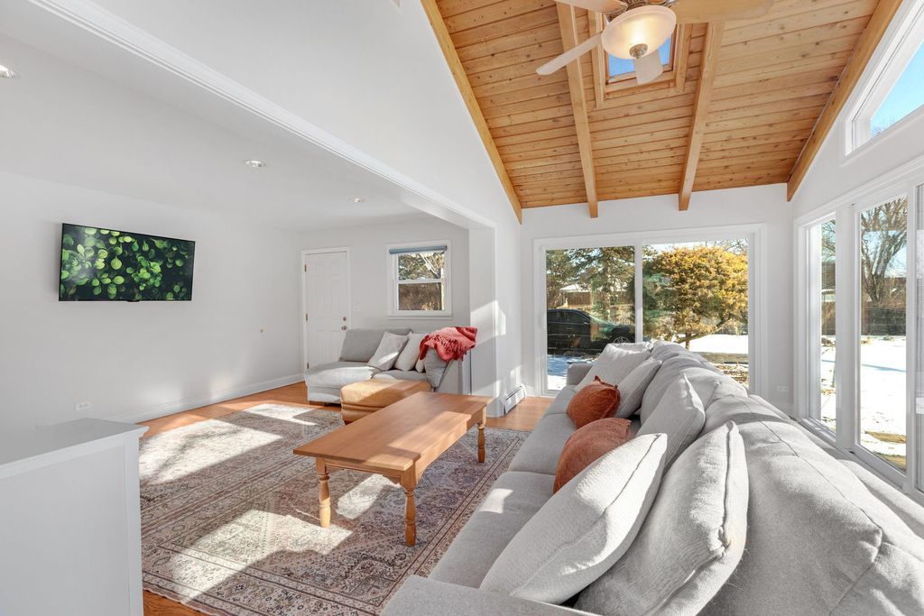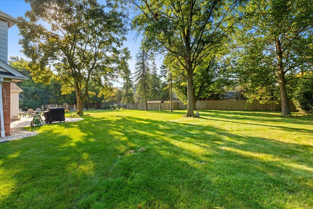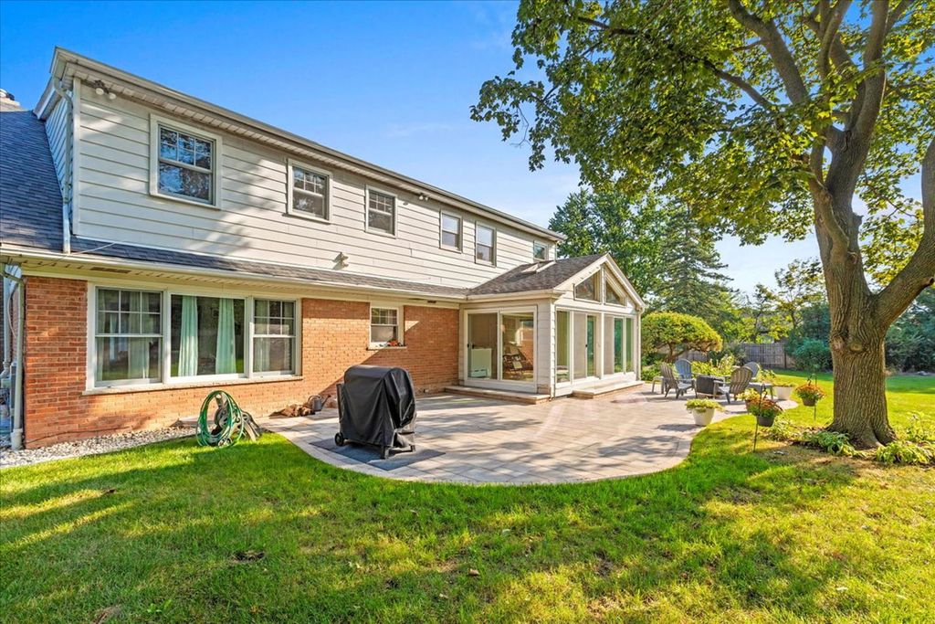 Spacious and tastefully updated two-story home set on nearly an acre of beautifully mature landscaping-an exceptionally rare offering in the Glenview/Northbrook area. This private, park-like oasis provides endless possibilities for customization and outdoor enjoyment. A charming covered front porch welcomes you into a wide and inviting entry foyer. To the right, the expansive living room features beautifully refinished hardwood floors, thick crown molding, recessed lighting, and a striking gas fireplace with a stone surround. The space flows seamlessly into the formal dining room, offering similar elegant finishes and serene views of the backyard. The heart of the home showcases a charming open-concept kitchen with rich cabinetry, granite countertops, and stainless-steel appliances, including a double oven. A breakfast bar with space for casual dining opens to the family room and a stunning four-season sunroom featuring a vaulted ceiling and four new sliding glass doors that effortlessly bring the outdoors in. Step outside to a newly constructed, expansive Unilock patio-reinforced for a hot tub-perfect for entertaining or relaxing while taking in peaceful views of your private retreat. The main level is completed by an attached two-car garage and a tastefully updated powder room. Upstairs, you'll find four generously sized bedrooms, all with hardwood floors and ample closet space. The primary suite features a custom walk-in closet and a stunning, brand-new en-suite bath with heated floors, a stand-up shower with additional handheld, and a long vanity with LED-lit mirror medicine cabinet. A second brand-new bathroom with a deep soaking tub and double-sink vanity serves the remaining three bedrooms. Additional living space awaits in the finished basement, offering a large recreation/family room, a laundry room with new washer and dryer, and abundant storage.