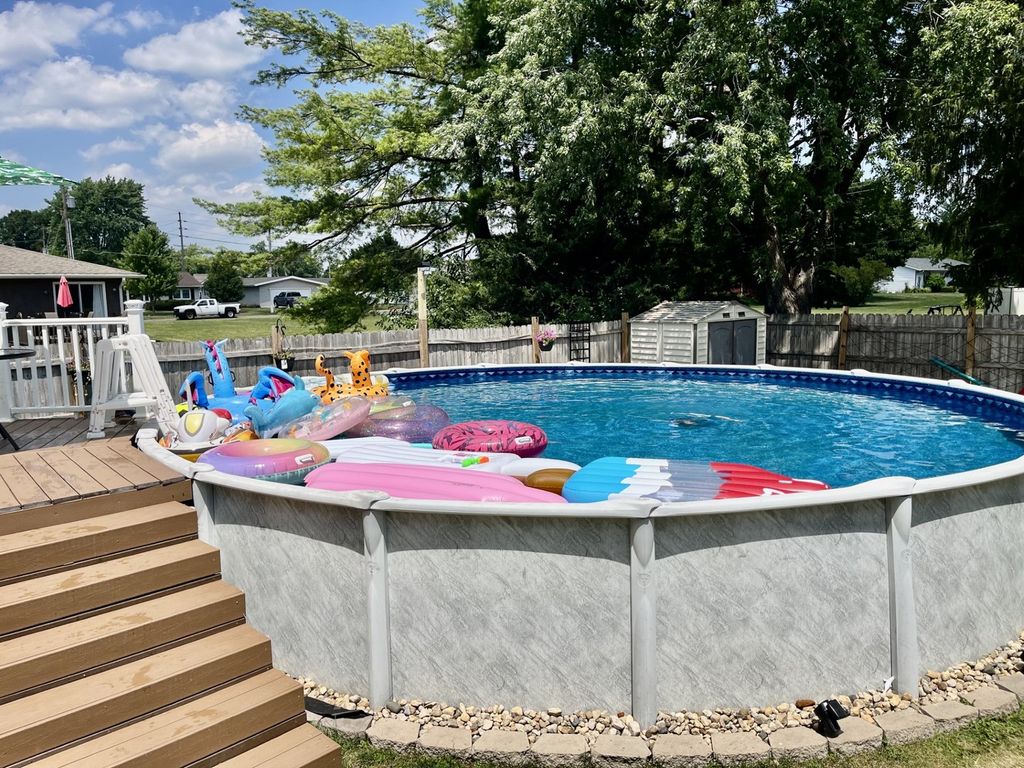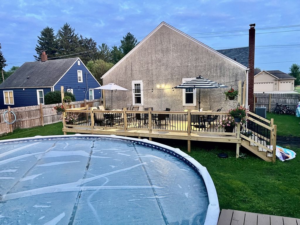 Charming three bedroom, two bath home offering a welcoming foyer with coat closet and a spacious living room featuring a fireplace, (owner has never used).The eat-in kitchen includes wood cabinets, double sink, and stove. An updated bathroom and three large bedrooms enhance the main living area, along with traditional built-ins and abundant storage throughout the home. The partially finished basement expands the living space with a family room, playroom/office, laundry area , and bathroom with a walk-in shower, plus plenty of additional storage. Enjoy outdoor living on the new deck overlooking a lovely, partially fenced backyard with an above-ground pool. A truly move-in-ready home