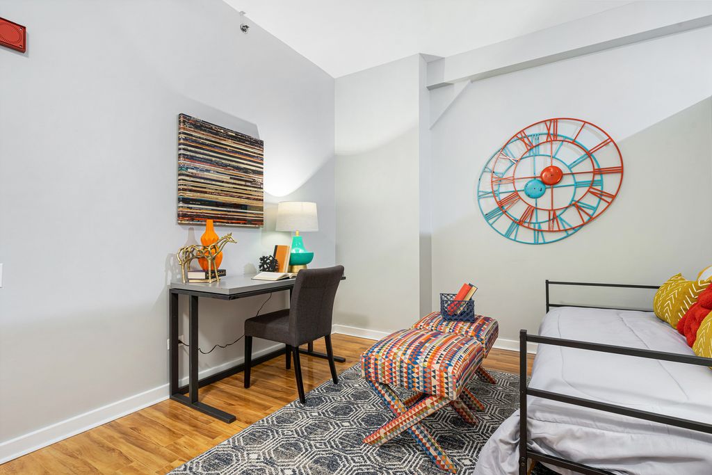 This bright and open soft loft features 12-foot ceilings and large windows. The unit includes one bedroom plus a den that can be utilized as an office. The kitchen features granite countertops, and there is a generous walk-in closet and in-unit laundry for added convenience. Additionally, a 6x9 storage closet is located on the same floor. The location is ideal, with easy access to shops, restaurants, public transportation, and Millennium Park. Please note that parking is not available in the building, but monthly parking is available nearby at the Millennium Park Garage.