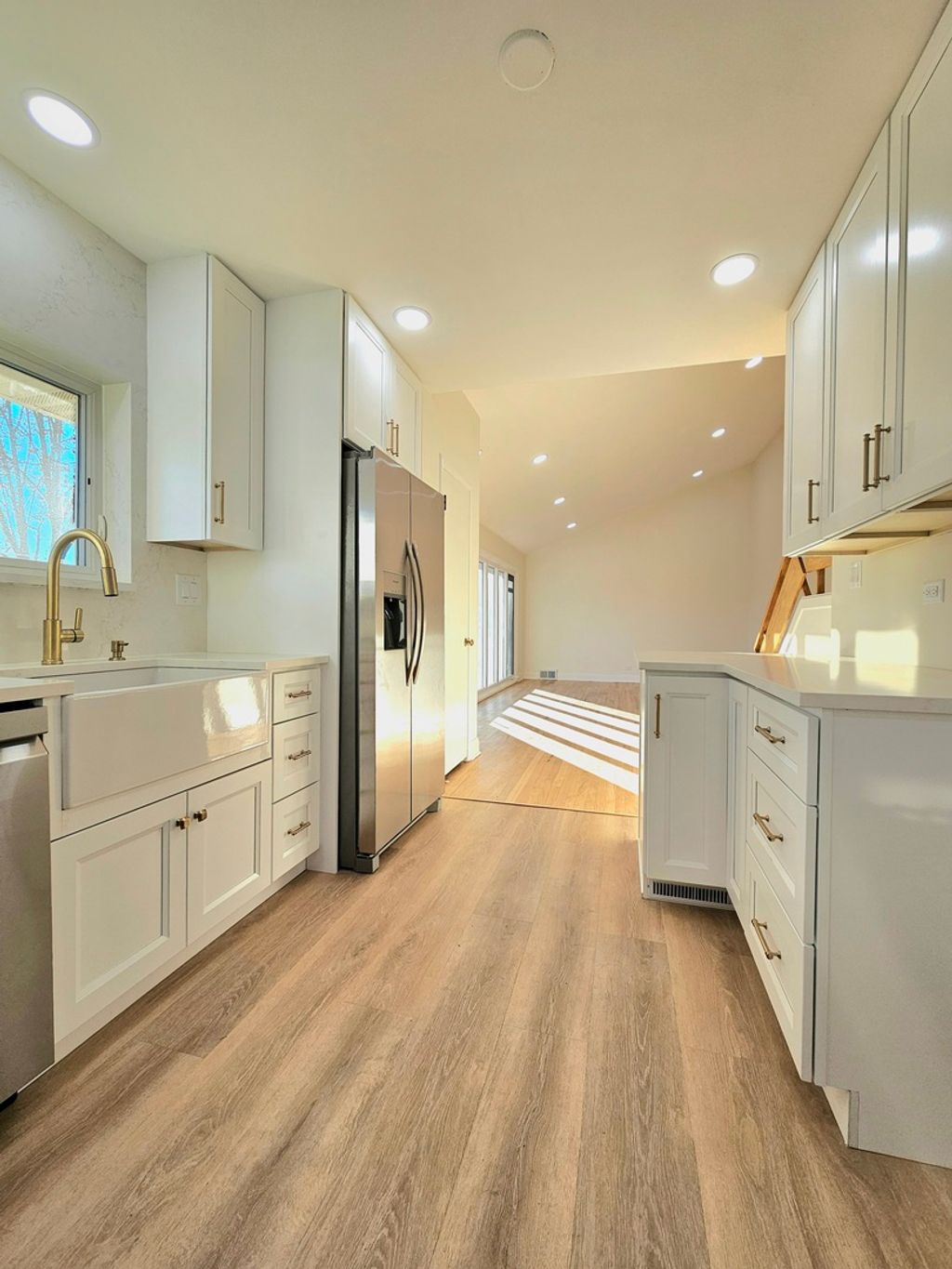 Welcome to your dream home. Beautifully updated, freshly painted and move-in ready, this spacious 5-bedroom, 2-bath multi-level residence offers modern finishes, flexible living areas, and thoughtful updates across all four levels. New virtually staged photos highlight room sizes, layout options, and customization ideas. The bright, south-facing main level features an open living, dining, and kitchen layout with vaulted high ceilings and dimmable recessed LED lighting. The kitchen includes new quartz countertops, 42" cabinets, new stainless steel appliances (with warranties), luxury vinyl flooring, and a stylish peninsula perfect for everyday living and entertaining. The second level offers three comfortable bedrooms with refinished hardwood floors and an updated full bathroom. The upper level includes two oversized bedrooms with new hardwood flooring and a cedar closet-ideal for an expansive primary suite. All five bedrooms are above the basement. The finished basement includes a second full bathroom with new fixtures, including a modern toilet, vanity and sink, LED medicine cabinet, and a Bluetooth speaker exhaust fan. This level also features a spacious family room and a large laundry/utility room, all with luxury vinyl flooring. A crawl space provides additional storage, and the sump pump offers added peace of mind. A wide, side-by-side 2-car driveway and 1.5-car attached garage make parking easy. Behind the garage is a heated/cooled extra room-great for a home office, gym, workshop, storage, or hobby space. Enjoy a large private backyard with a patio and storage shed-perfect for gatherings, grilling, and outdoor relaxation. Additional improvements include brand-new windows (except the living room) and a new water heater. Lot size is 7,500 sq ft. Located within walking distance to Melzer Elementary School in a prime Morton Grove location, this home offers incredible space, modern comfort, and outstanding value-with easy access to shopping, dining, public transportation, a short drive to the Metra station, major highways, and beautiful local parks. Don't miss out on this incredible opportunity.