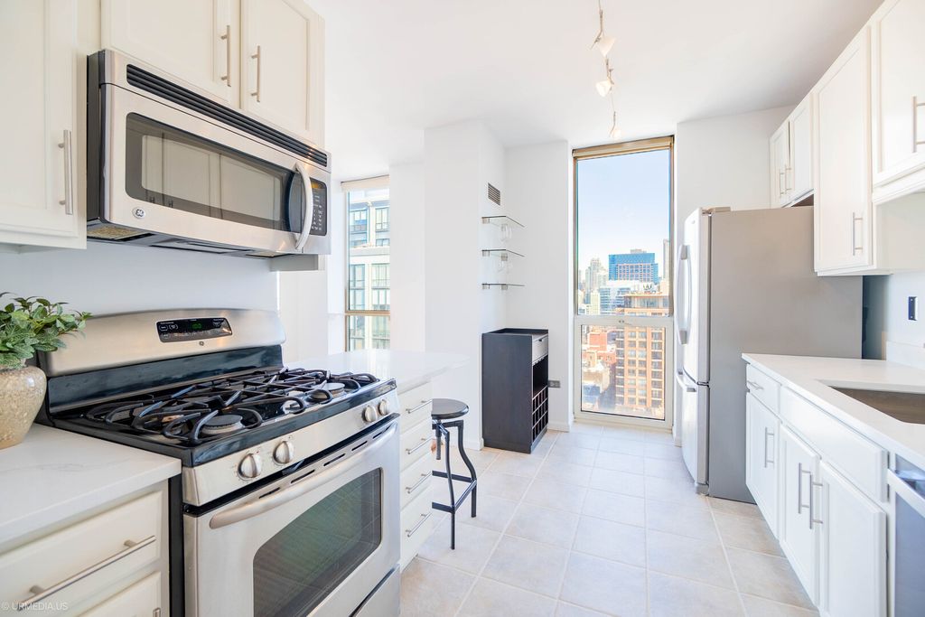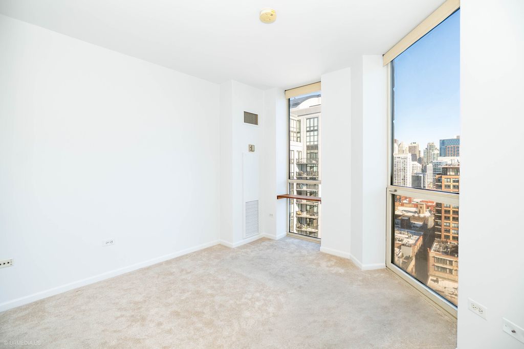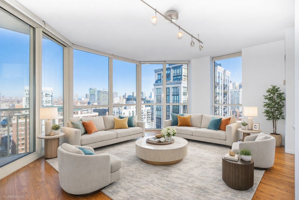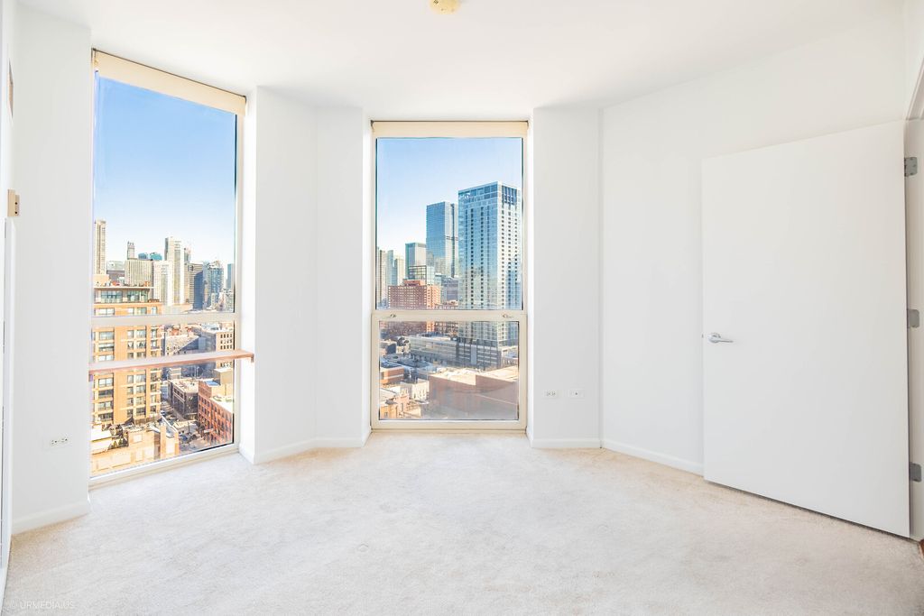 Incredible opportunity to own a sophisticated corner residence in one of River North's most desirable tiers at 645 N Kingsbury. Floor-to-ceiling windows flood the home with natural light and showcase dramatic skyline views. The open layout features hardwood floors throughout, a chef's kitchen with stainless steel appliances and brand new quartz countertops, freshly painted, upgraded light fixtures and a private balcony off the living room, perfect for relaxing or entertaining. The luxurious primary suite offers spa-inspired comfort with double vanities and a serene bath. Full-amenity building includes 24-hour door staff, fitness center, party room, and bike room. Perfectly situated across from Montgomery Ward Park with easy access to the East Bank Club, Chicago's Riverwalk, and many shopping and dining options. Commuters take ease with highway access only 3 blocks away. Deeded parking available for $30,000.
